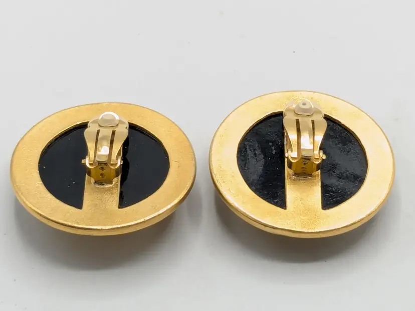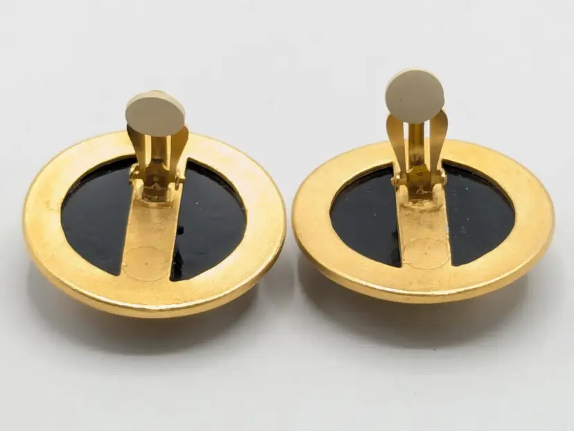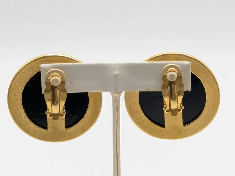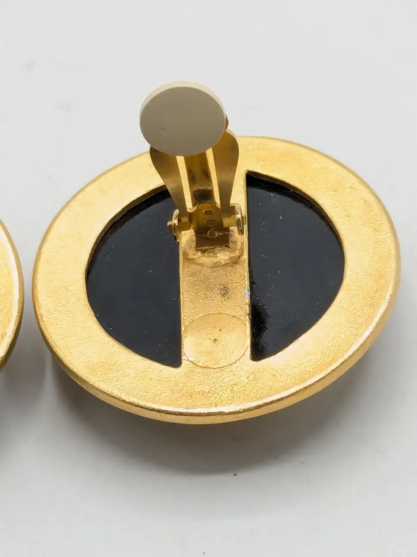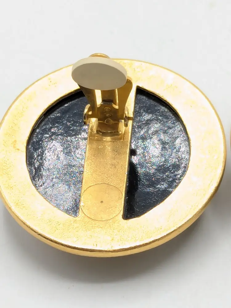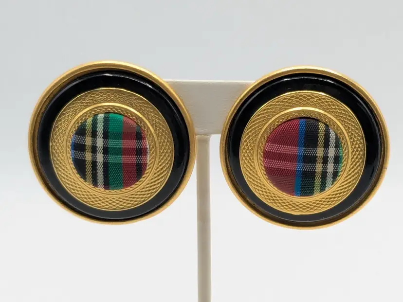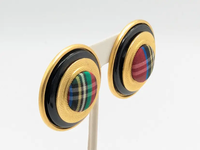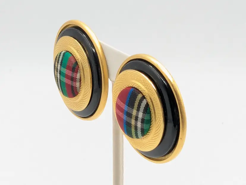 Good condition. Bold tartan plaid designed fabric with gold tone and black enamel. Measures approximately 1 1/2" in diameter. EN2