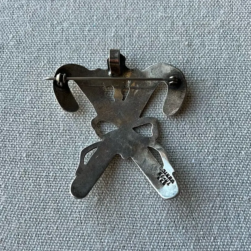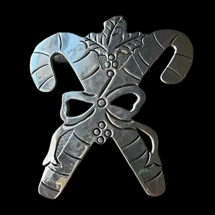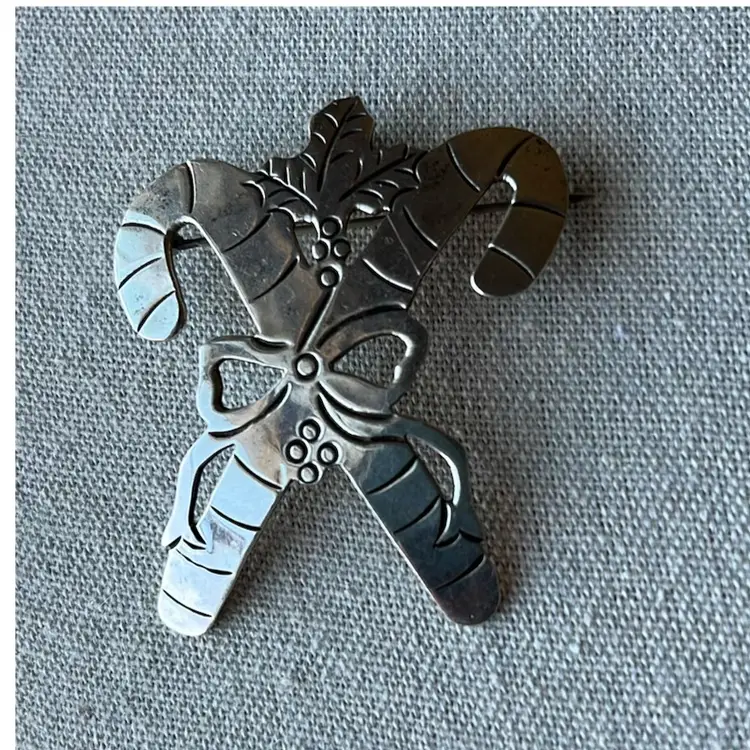 Vintage Taxco Mexico 925 Sterling Silver Candy Cane Holly Bow Holiday Christmas Brooch That Converts To A Pendant. Marked 925 TM 33 Mexico. Needs polishing. In good condition. Almost 2”