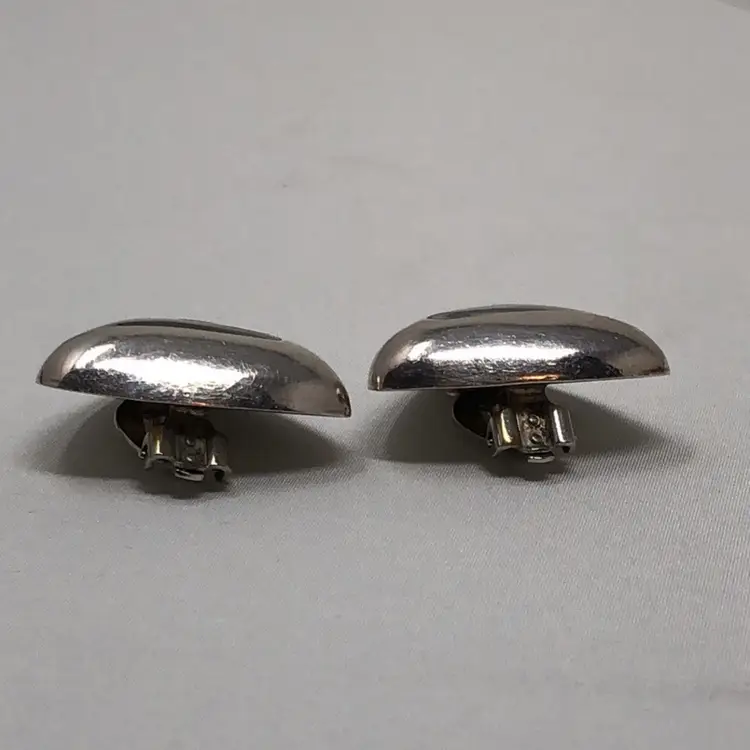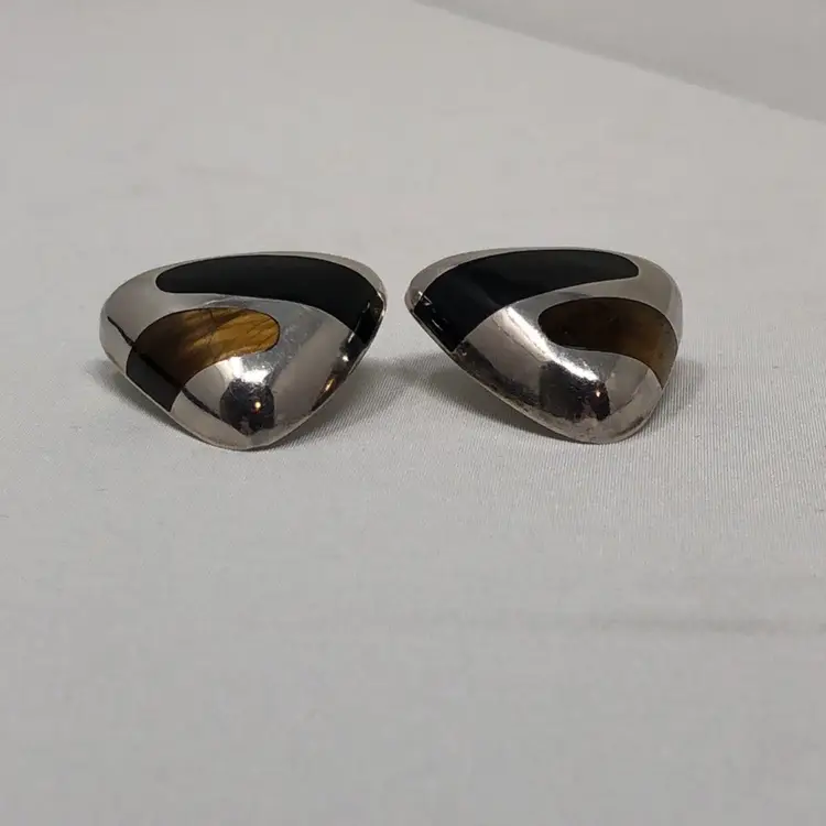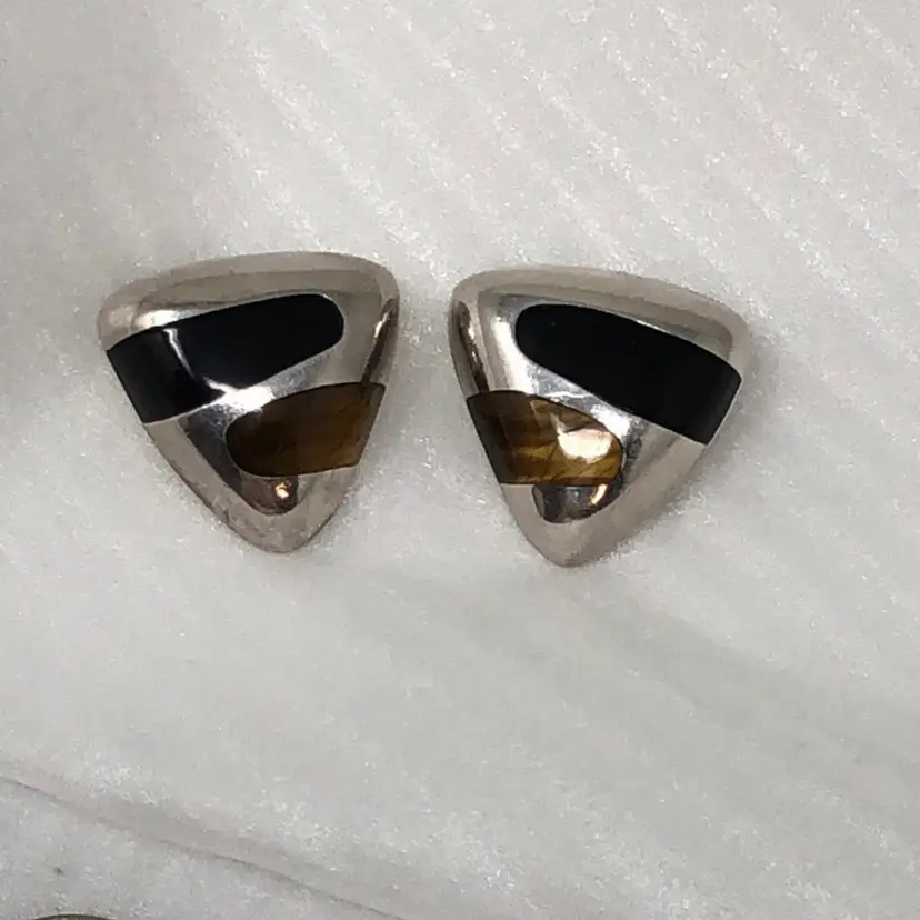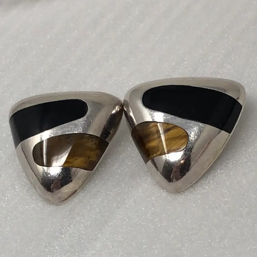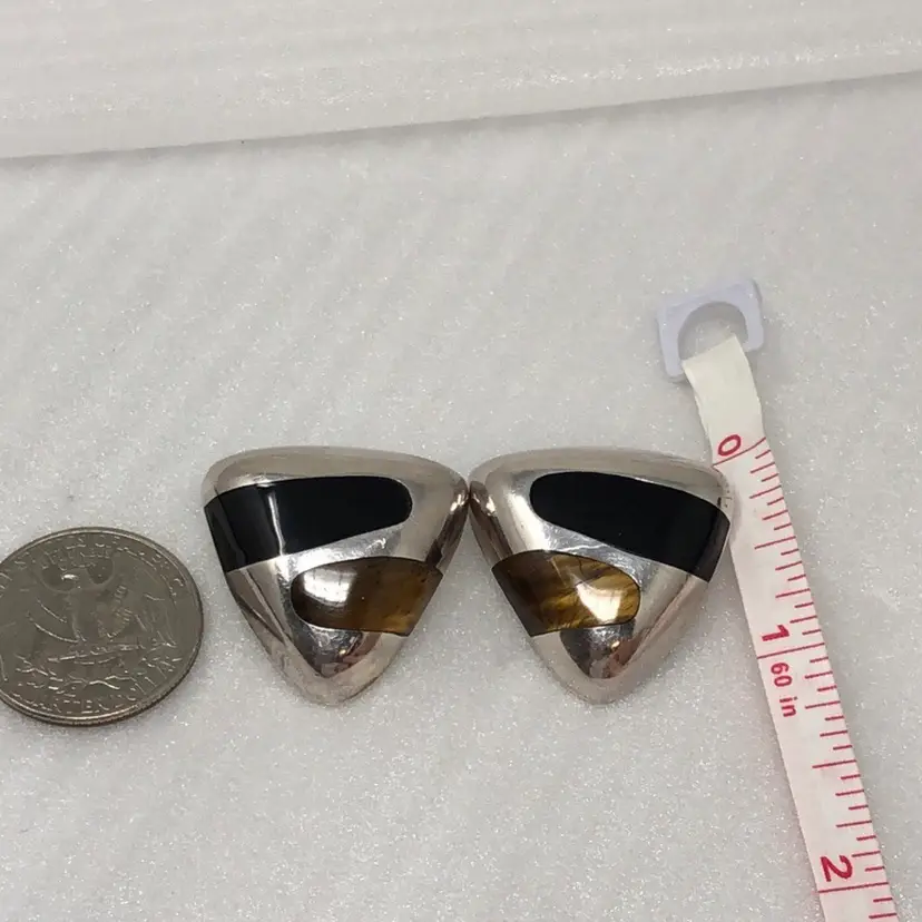 Sterling Silver black brown Signed Mexico 950 Triangle inlay design Clip on for pierced and non pierced ears 60’s style Western Southwestern Cowgirl