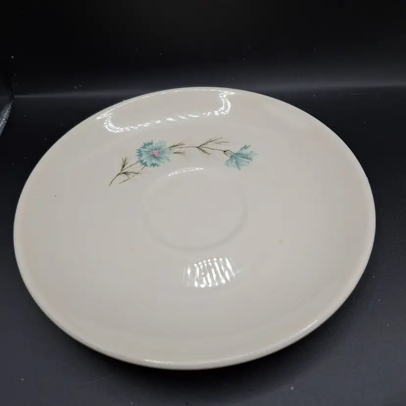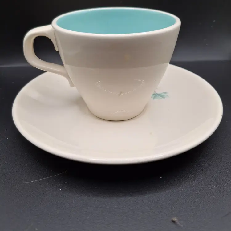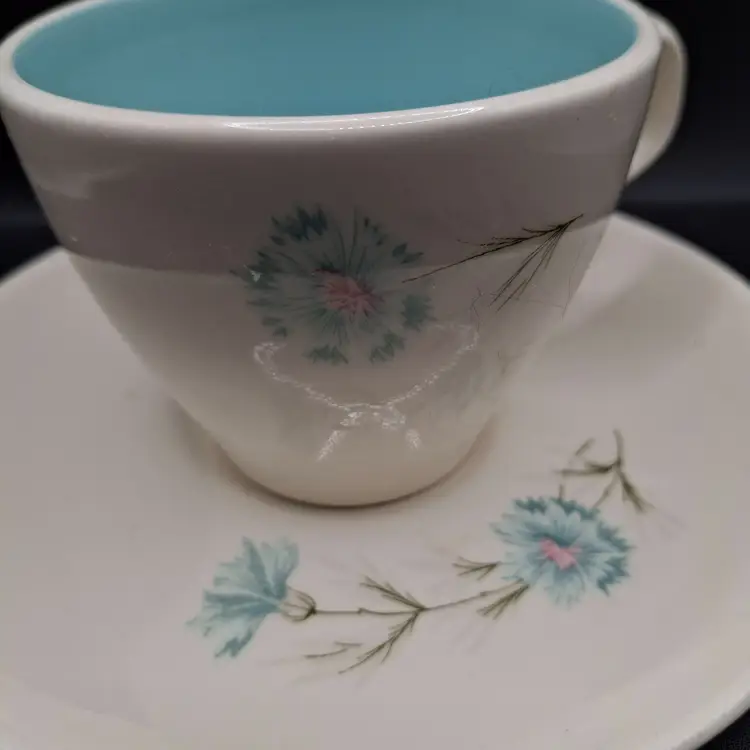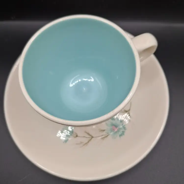 This delicate vintage tea set invites you to a bygone era of elegance. The serene blue interior contrasts charmingly with the gentle floral design, creating a timeless aesthetic for your cherished tea moments.