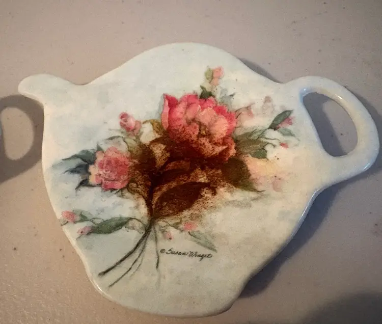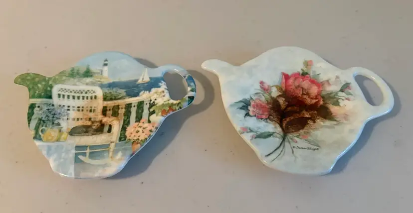 This vintage tea bag tidy set/2, made in Italy, features a novelty shape and colorful ceramic material. The small size, measuring 3 inches in height, makes it perfect for all occasions. These original tea bag holders add a touch of vintage charm to your tea-drinking experience, with the added convenience of keeping your tea bags neatly organized. Perfect for adding a touch of Italian flair to your tea time.
