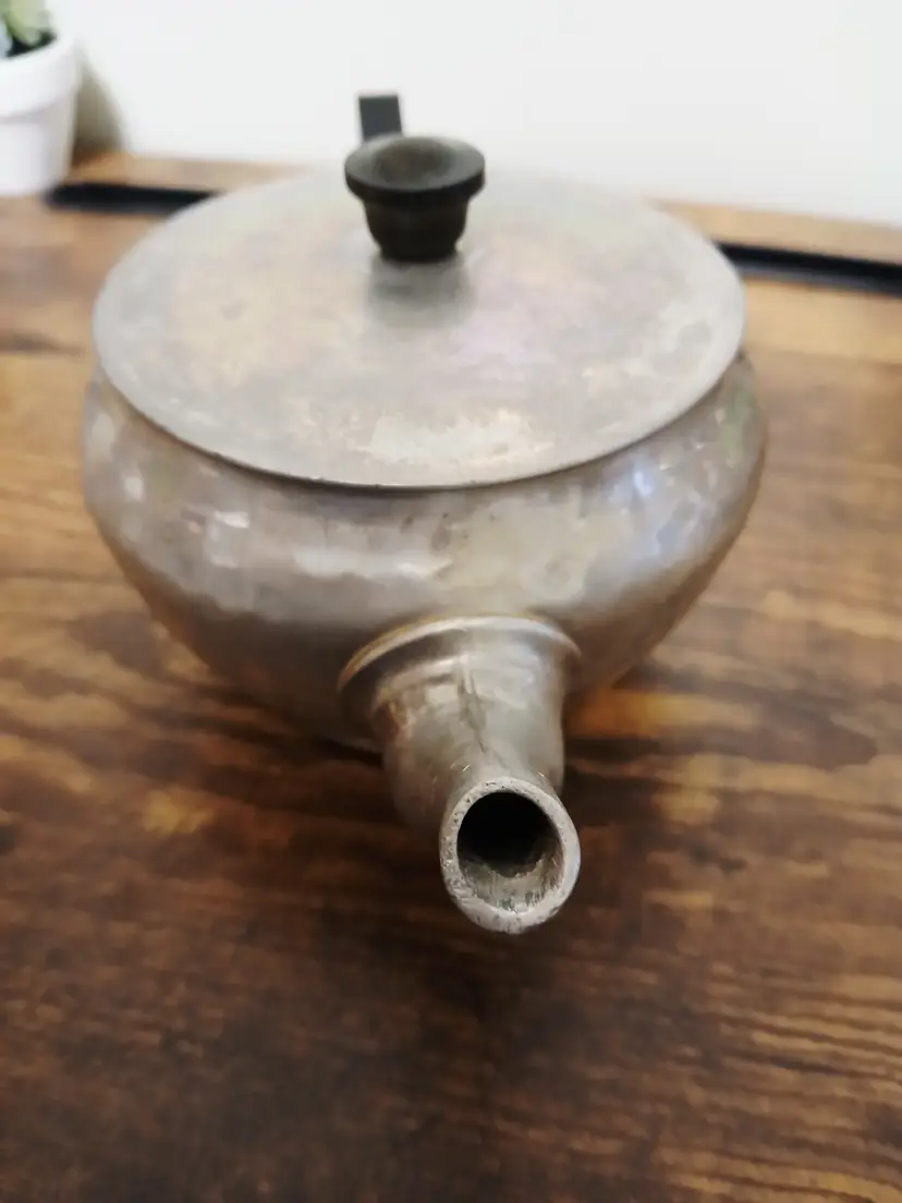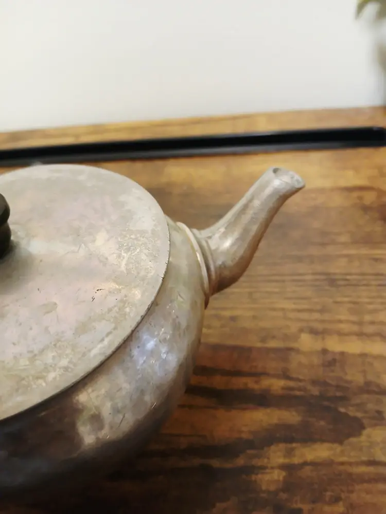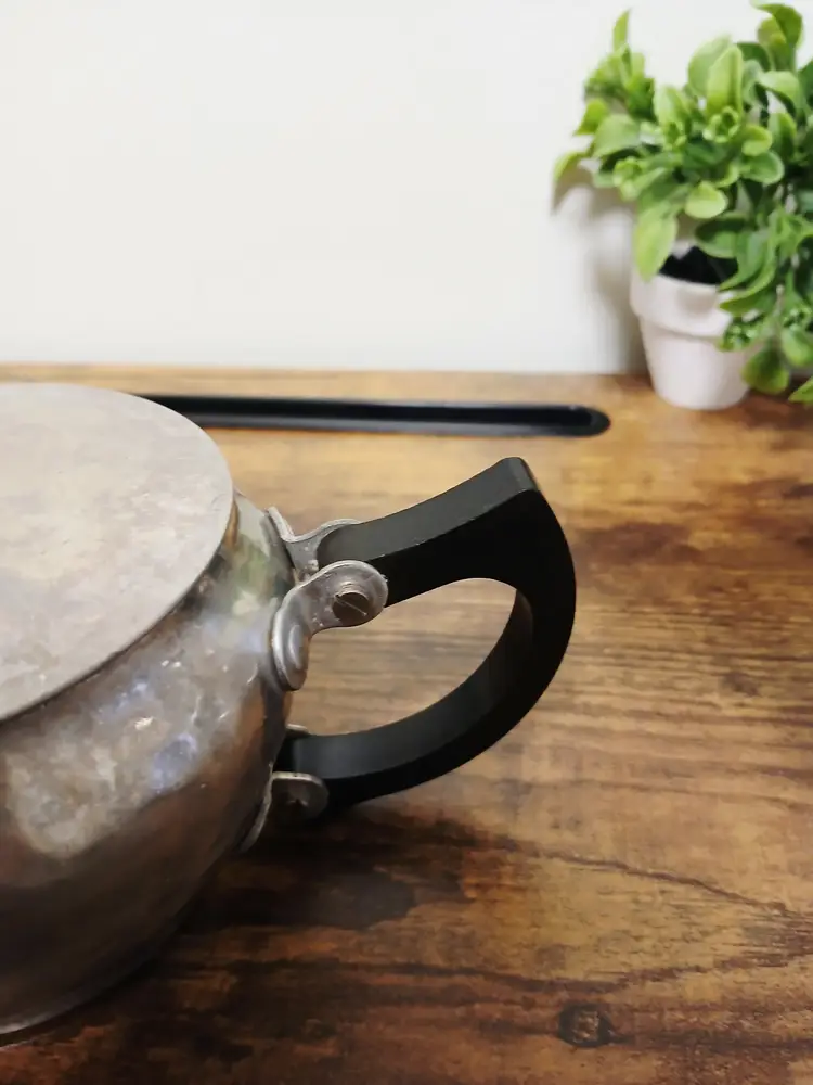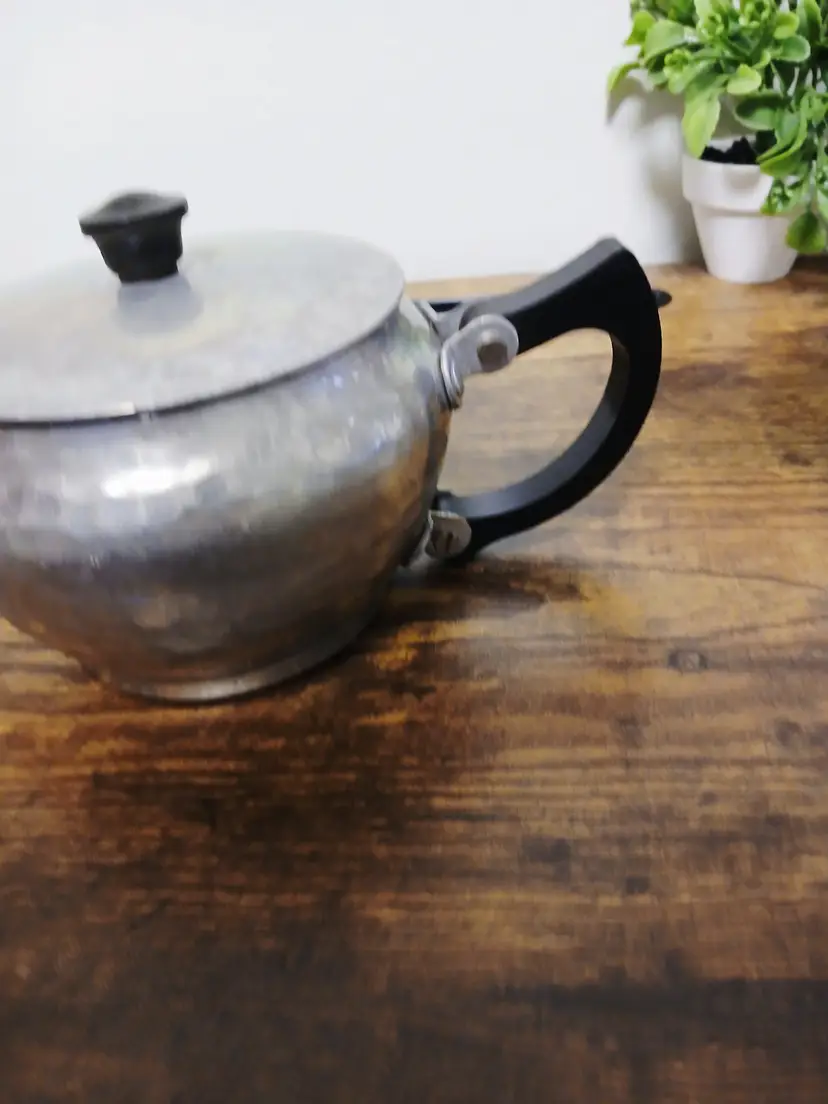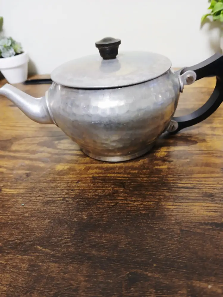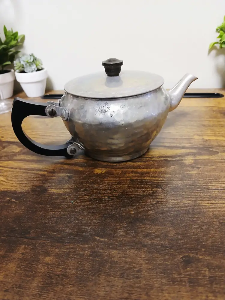 Brew your favorite tea with this charming vintage hammered metal teapot. Featuring a unique textured design and a sturdy black handle, it's perfect for adding a touch of retro elegance to your kitchen. Ideal for both display and use. Approximately 4 1/4" x 7 1/2× 3 3/4"