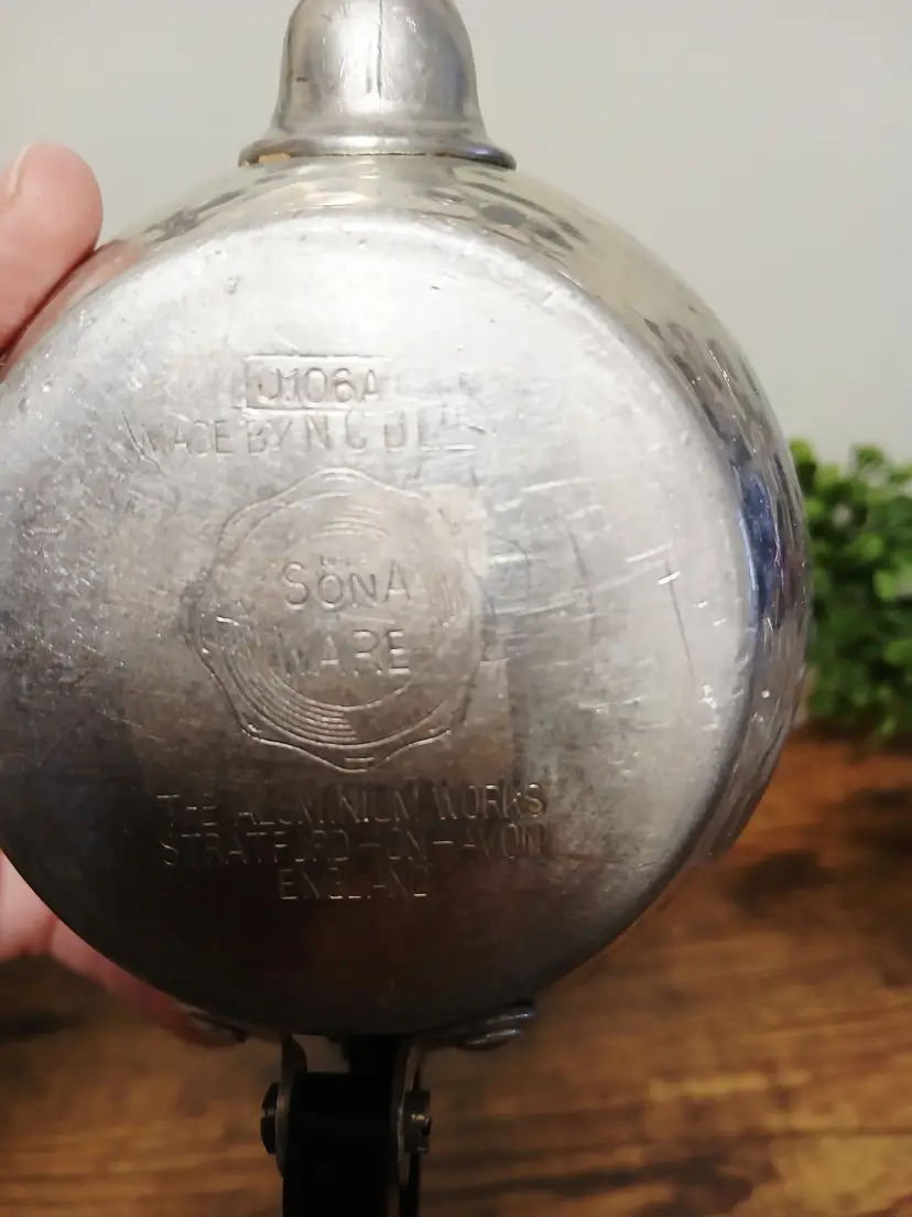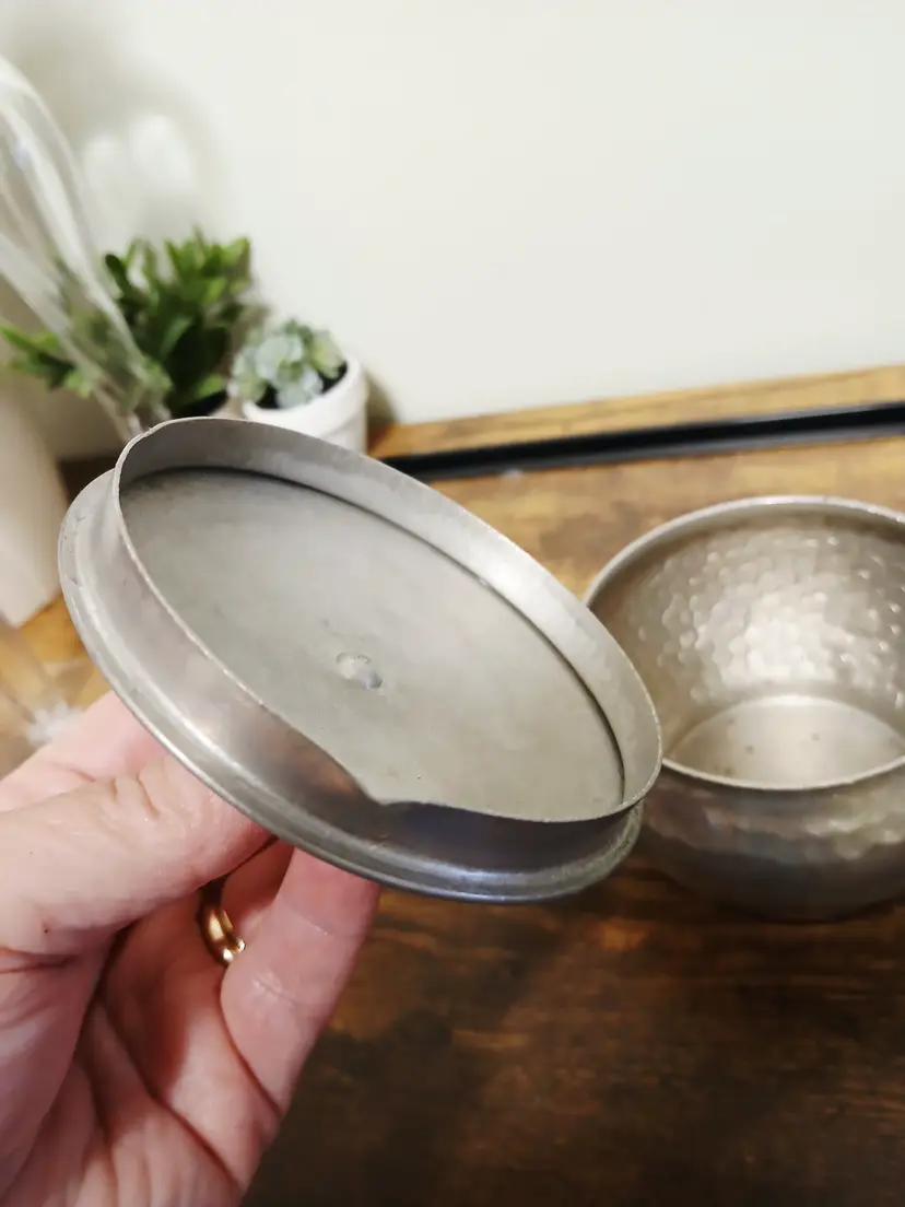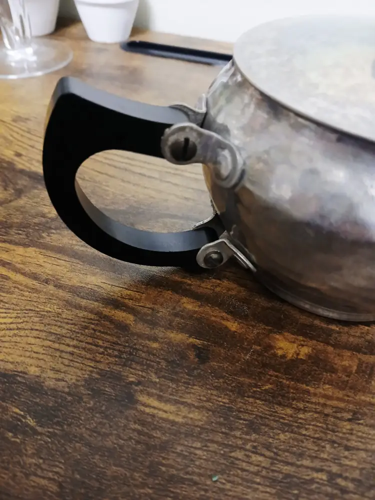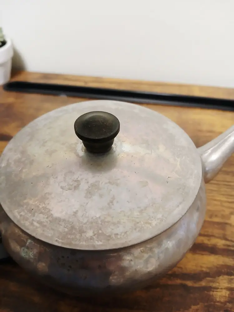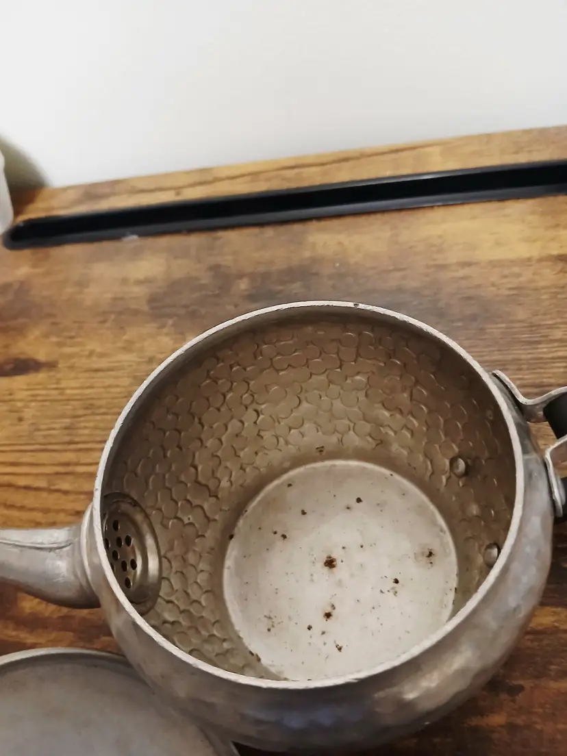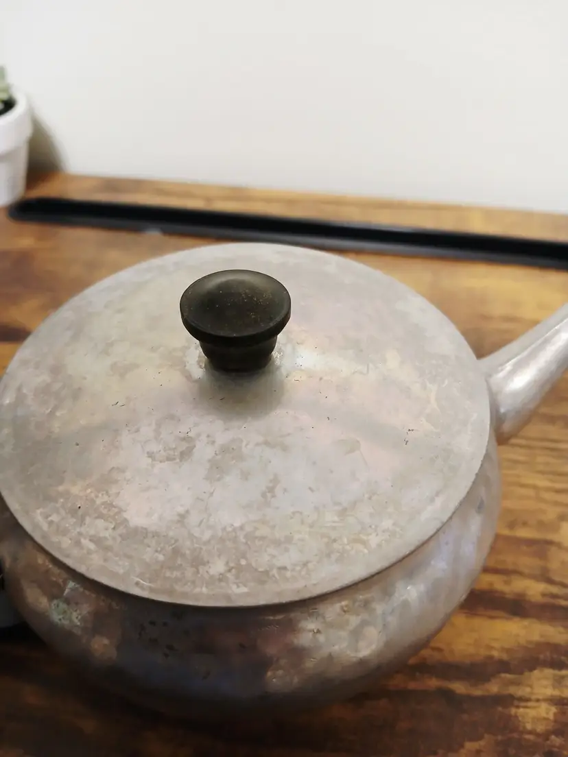 Brew your favorite tea with this charming vintage hammered metal teapot. Featuring a unique textured design and a sturdy black handle, it's perfect for adding a touch of retro elegance to your kitchen. Ideal for both display and use. Approximately 4 1/4" x 7 1/2× 3 3/4"