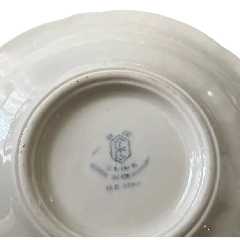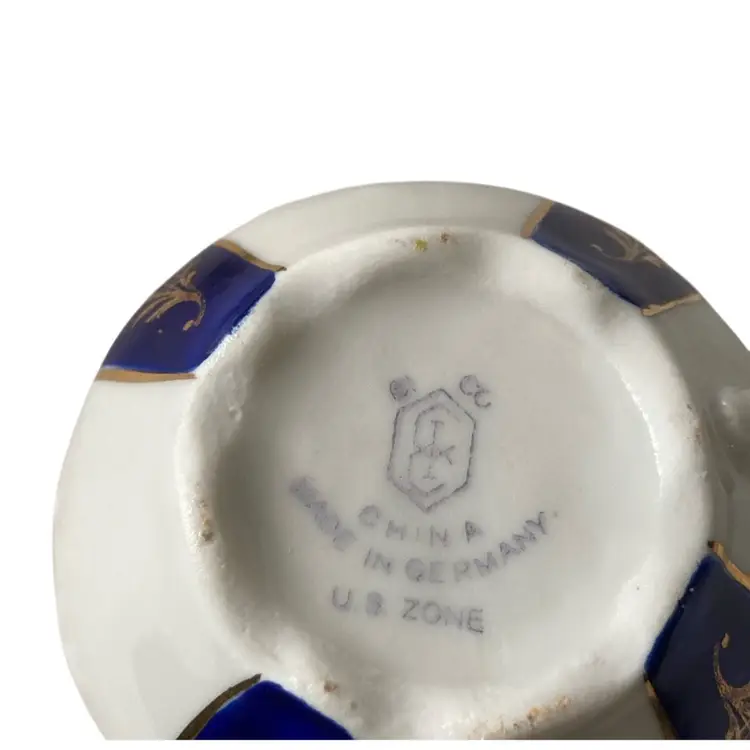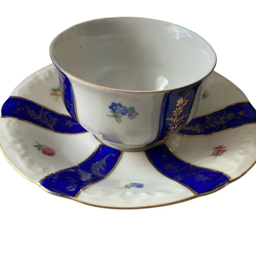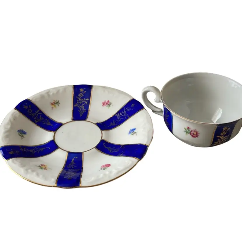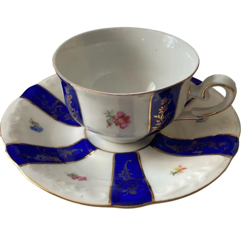 Saucer is 5” round cup is 1.5” x 2.5”. Cobalt blue stripes with gold embellishments. In great condition.
