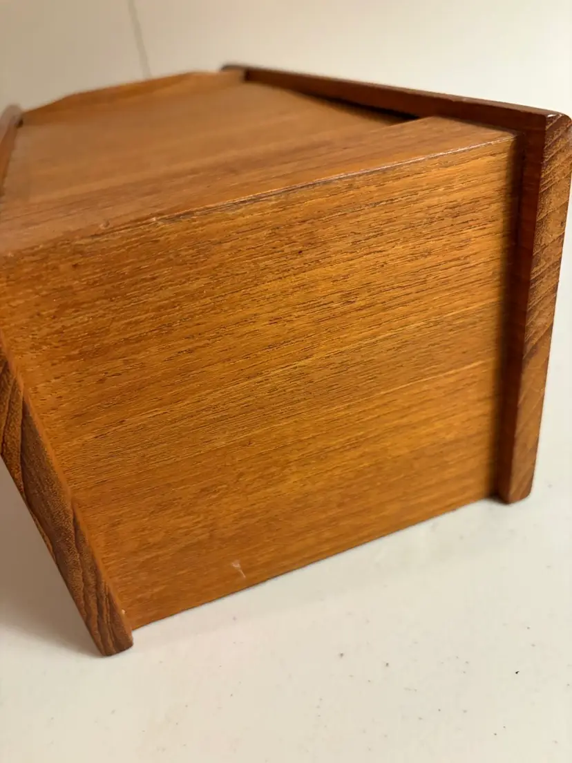 The Vintage Teak MCM Rolltop File Box is a retro-inspired desktop organizer made by Kalman Teak Wood. Crafted from teak wood in Thailand, this unique desk accessory features a roll-top design and dimensions of 14x6 inches. Perfect for organizing office supplies or storing recipe cards, this functional piece adds a touch of vintage charm to any workspace