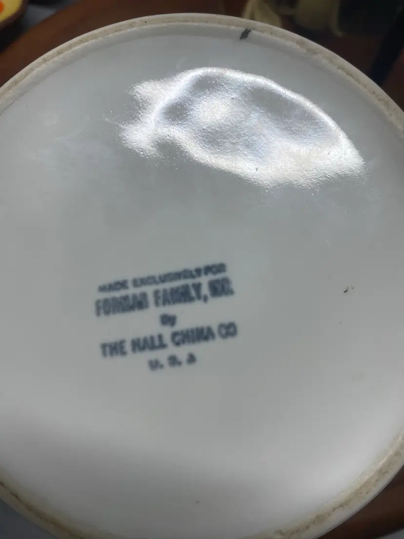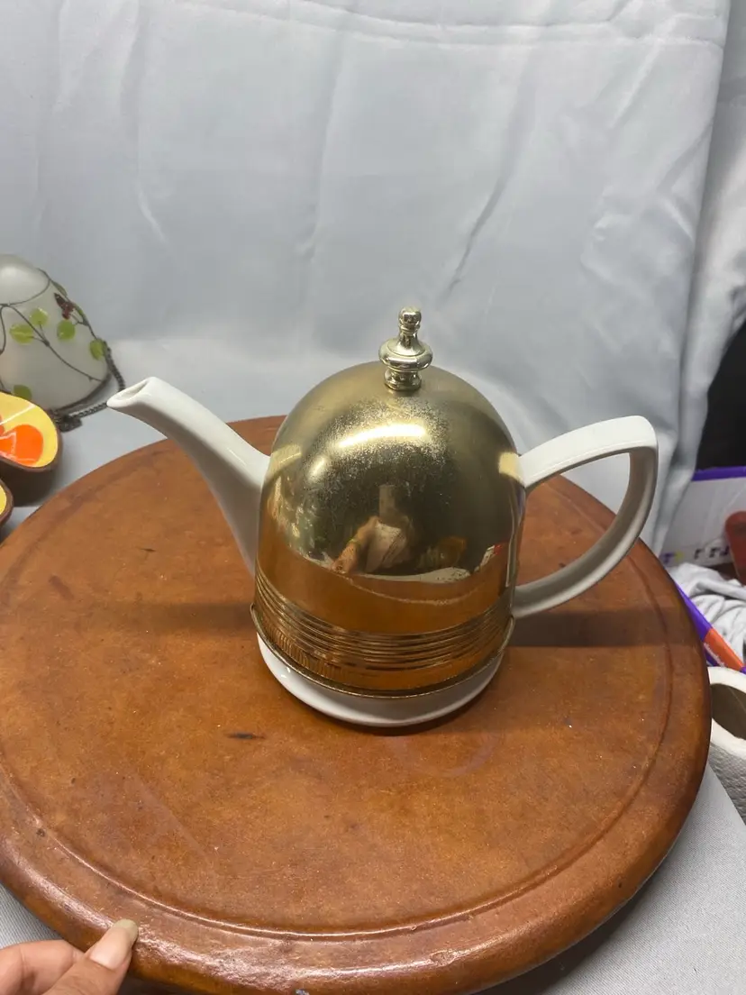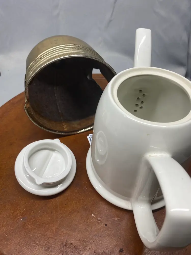 No chips or cracks some wear on cozy approximately 7” tall with cozy, 9.5” wide