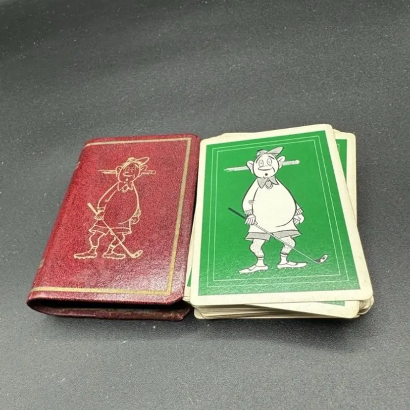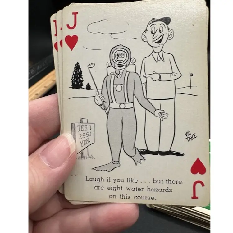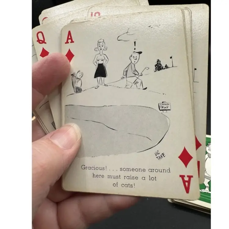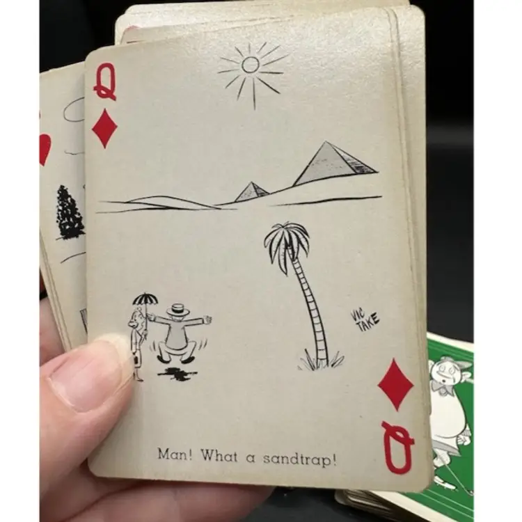 This is a unique set of vintage playing cards with a fun golf theme. The deck features 52 funny cartoon characters and comes with a metal holder for storage. These cards are perfect for collectors of vintage paper items and those who enjoy the game of golf. Made in the United States by CREATIVE PLAYING CARD, this set is a great addition to any collection.