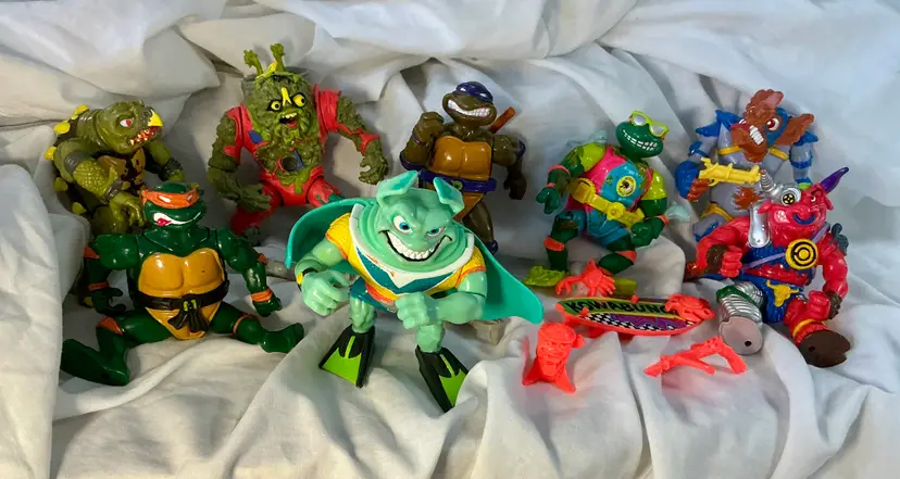 This vintage lot of 8 4" Teenage Mutant Ninja Turtles action figures from 1988 comes with accessories and is a must-have for collectors or fans of the classic cartoon series. The colorful plastic figures are original and depict the beloved animal species of turtles, staying true to the TMNT franchise. Perfect for fans of the 1980s TV show, these vintage action figures bring nostalgia and a touch of retro charm to any collection.