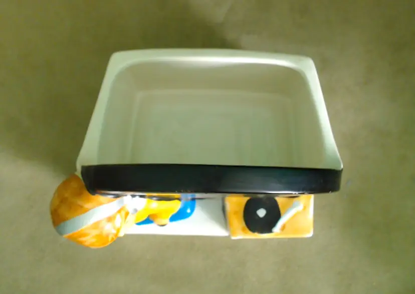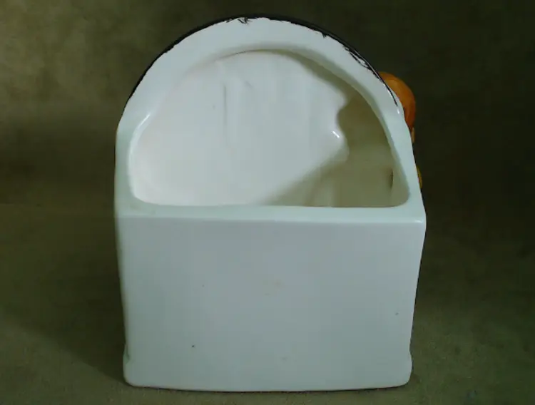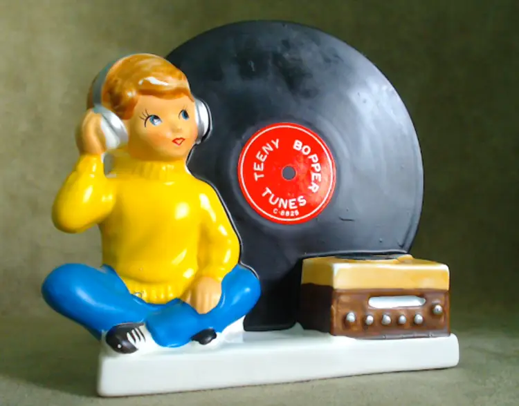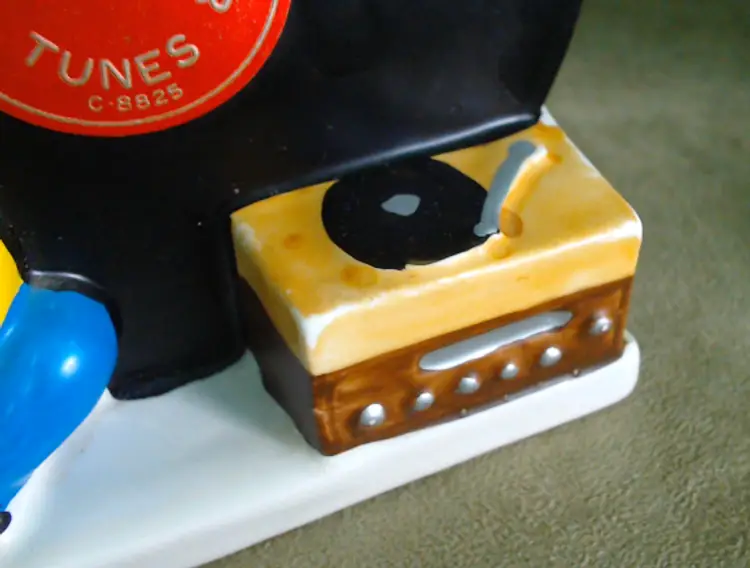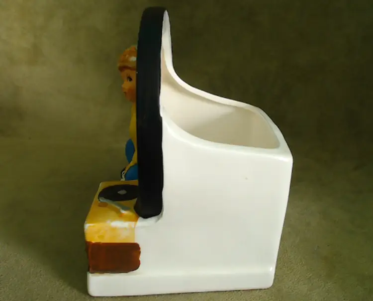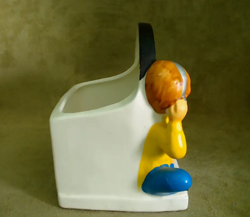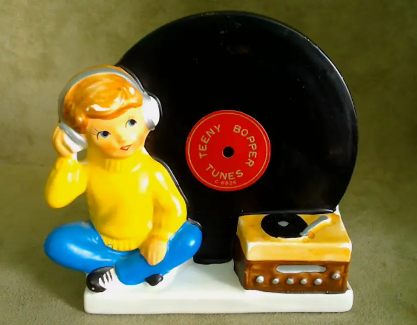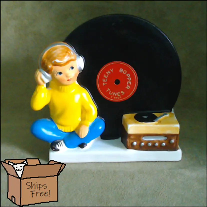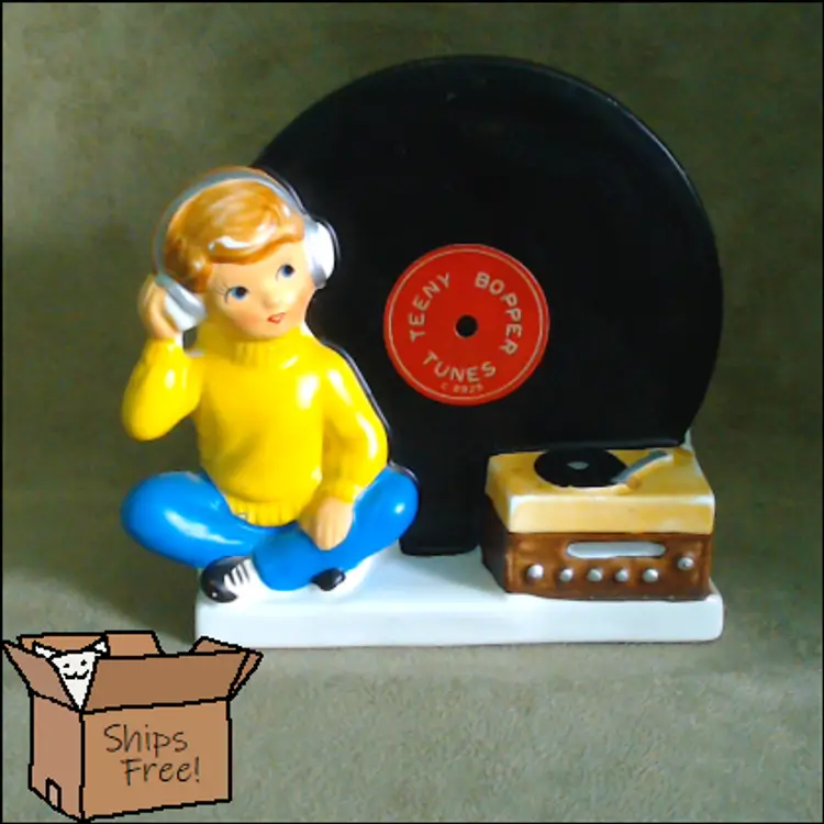 This is a vintage planter, featuring a boy and his favorite tunes! Made in Japan during the 1960s, for NAPCO (under the Napcoware label), this planter is an ode to the music loving youth of the era. It would look great with mid-century diner decor, or paired with an older vinyl collection! Condition: This planter is in Excellent shape! There are no chips, cracks, or any other damage that I could find. The cold-paint is nearly spotless, which is amazing for a planter of this age. Very clean inside too! Size: The piece measures 5½" across, is 3½" wide, and stands 5¼" tall. The actual planter portion is about 4" across, 2" wide, and is 2¾" deep.