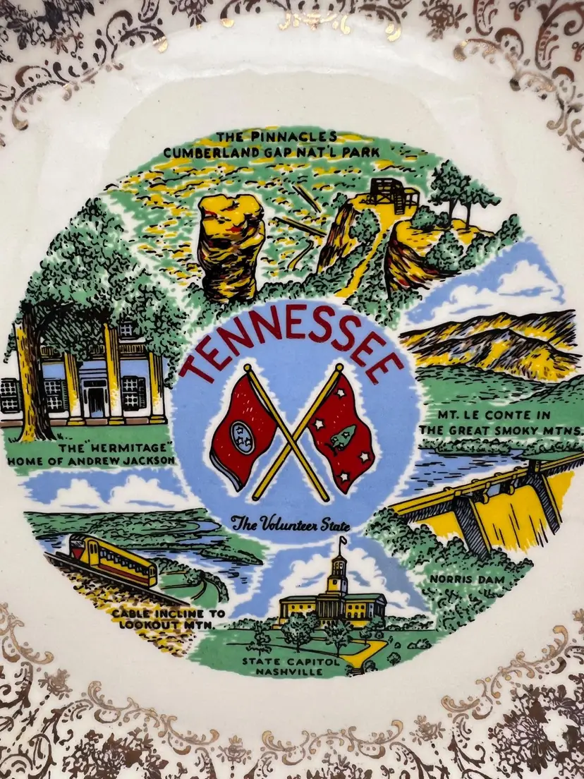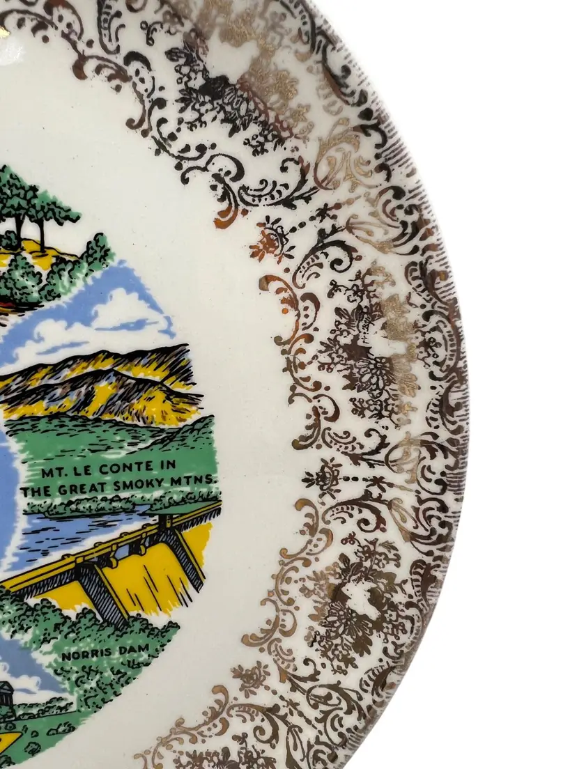 This decorative collectible plate features iconic Tennessee landmarks, showcasing the state's rich heritage. The plate measures 9.25" across and has a gold trim design on the border. No markers to indicate maker. Landmarks on the plate include The Pinnacles, Mt. LeConte, Norris Dame, State Capitol, Cable Incline at Lookout Mountain, and The Hermitage.