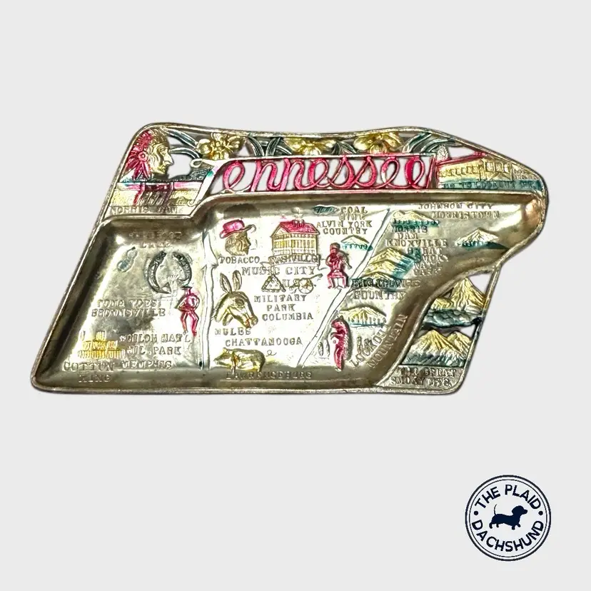 Awesome souvenir from the 60’s when families did driving vacations on the new highways. Shaped like the state of Tennessee with places to visit. Made of tin in Japan.