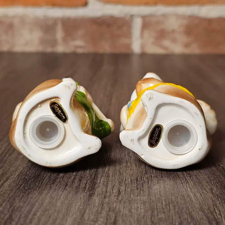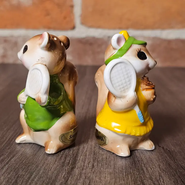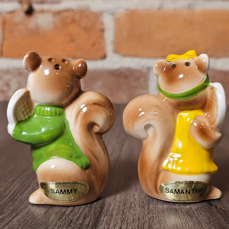 Condition: Good vintage condition overall. Samantha shaker shows a small chip on the foot (see photos). Original stoppers are present. Please review all photos carefully.