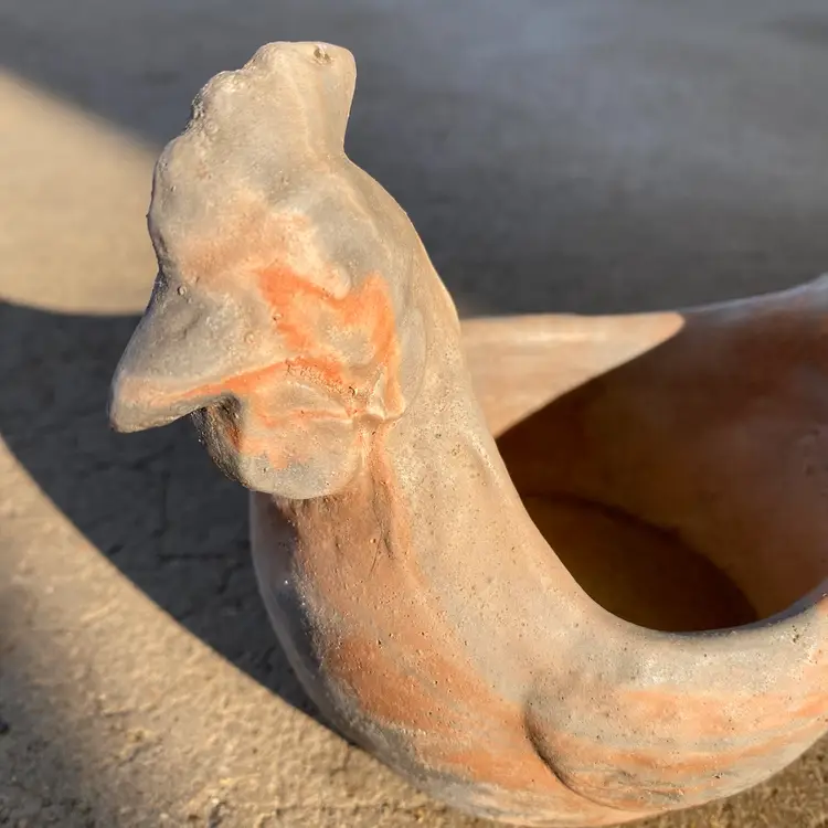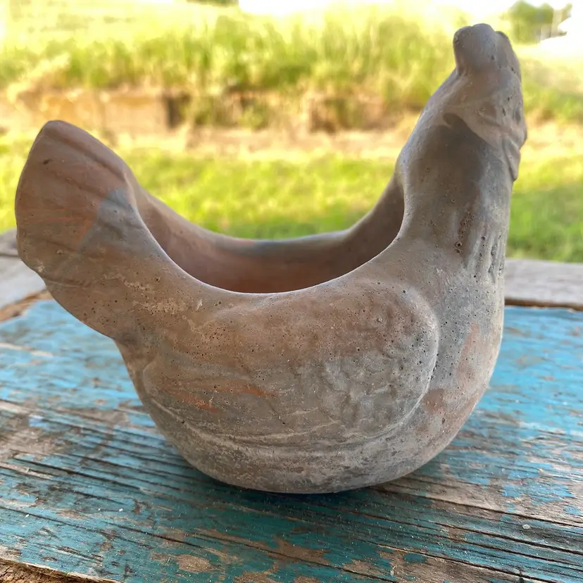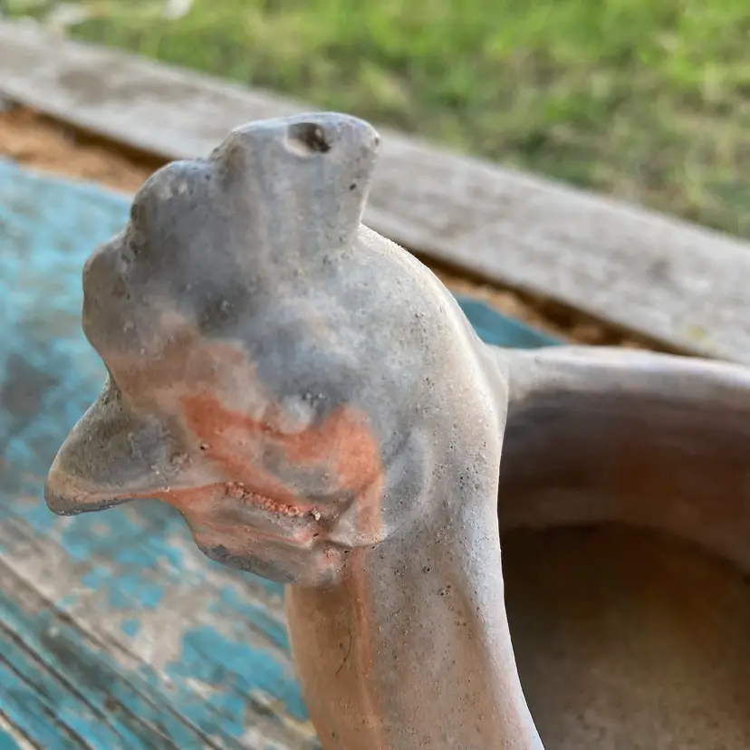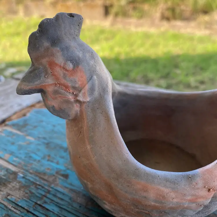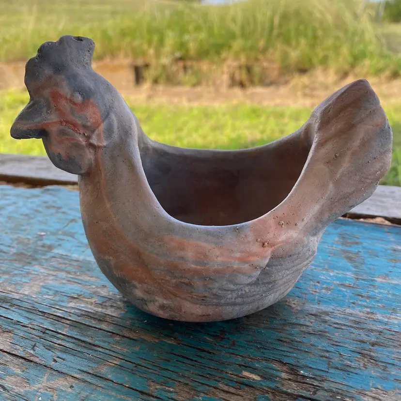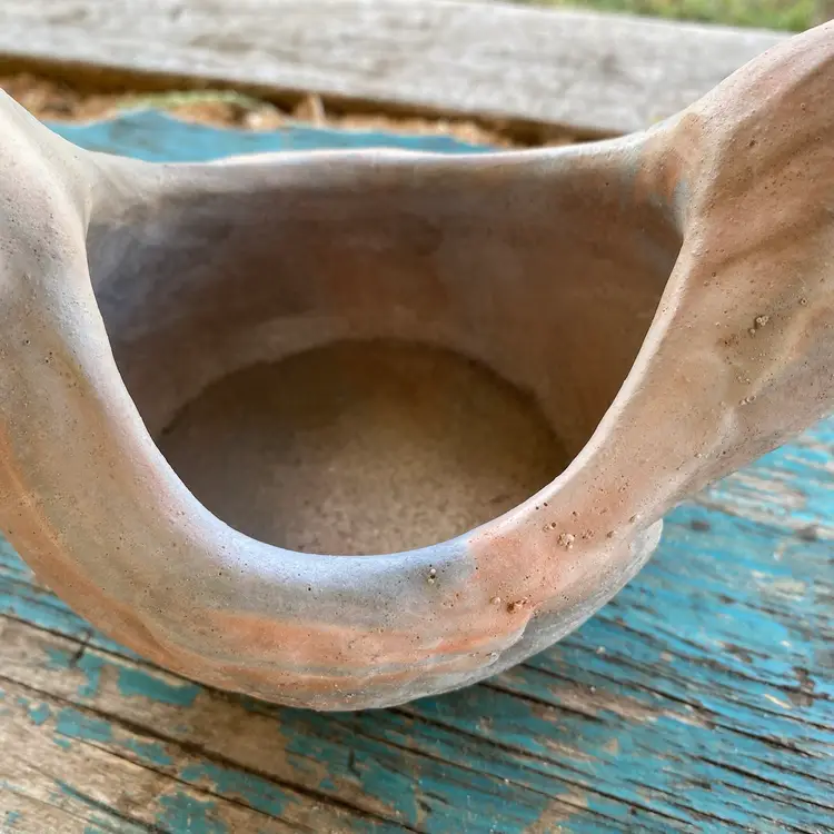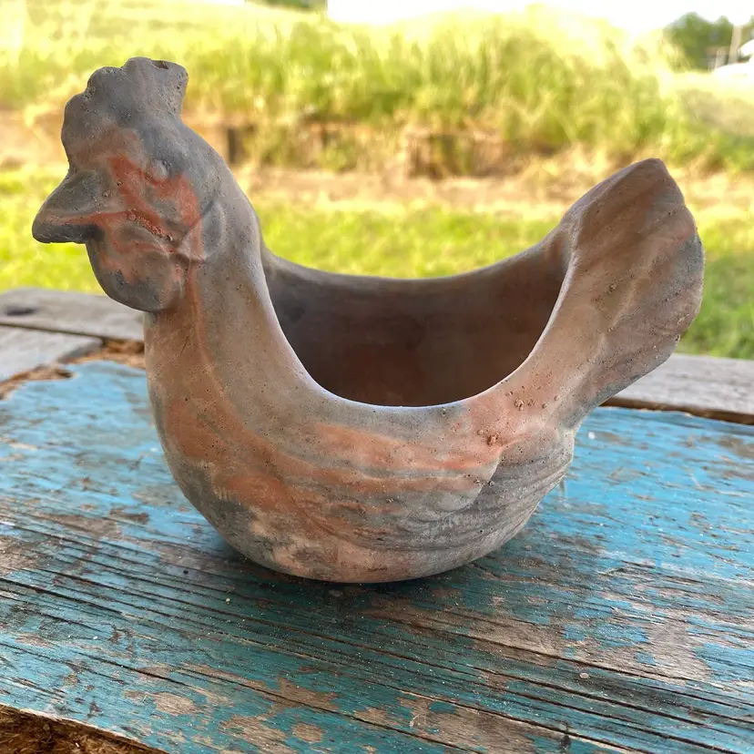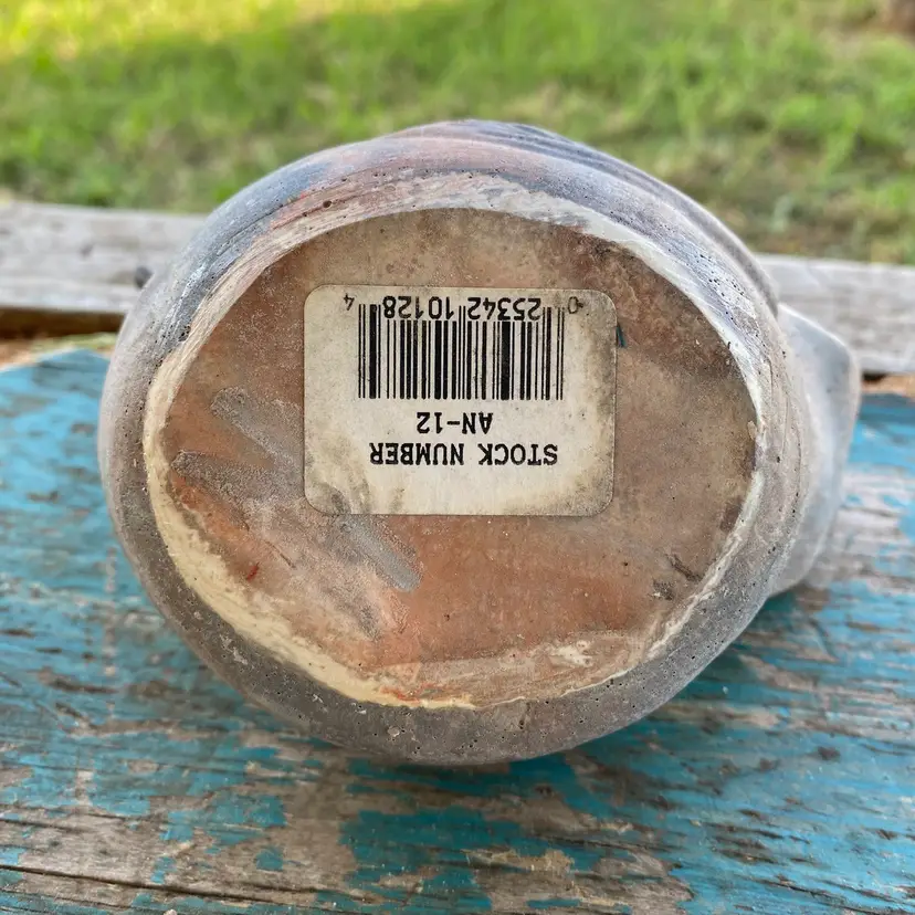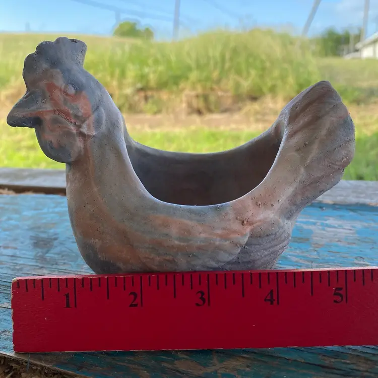 Approximately 5 inches by 4.5 inches. Has a small chip on top. (See photos). Swirl color of terra cotta and grey.