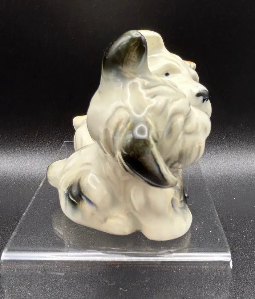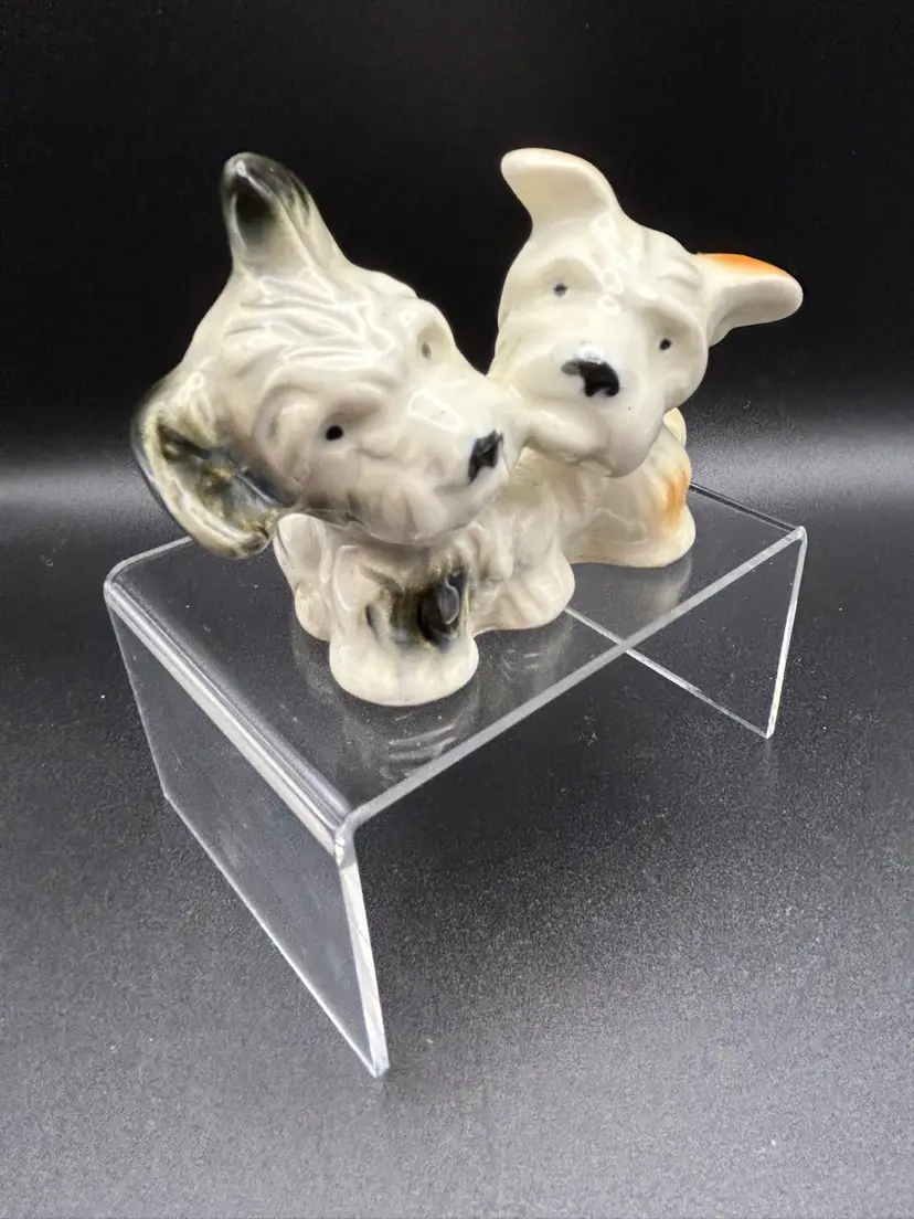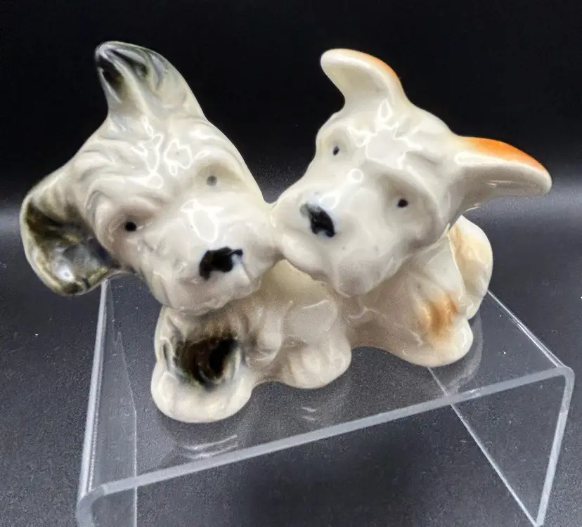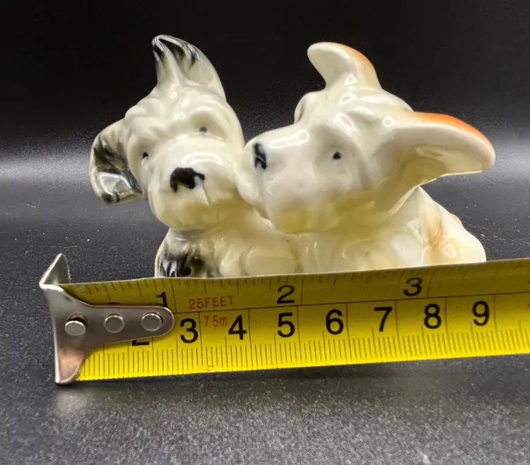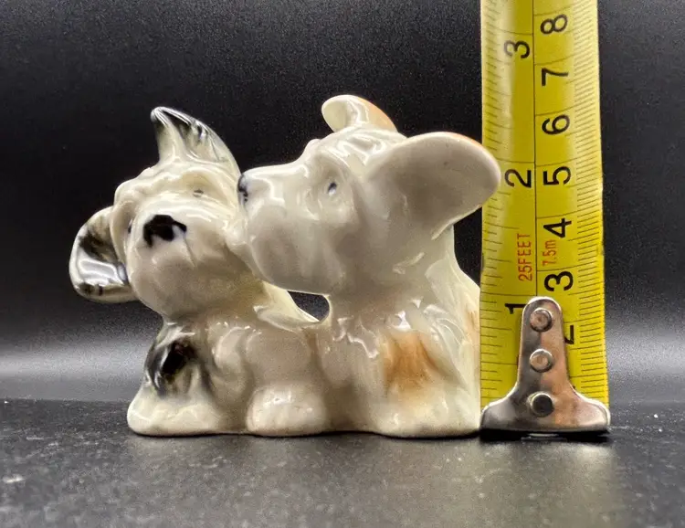 This vintage figurine features two adorable terrier dogs, made of high-quality porcelain and crafted in Japan. The intricate details of these small puppies is sure to delight any collector or dog lover. Measuring at about 3x3 inches, this figurine is the perfect addition to any collection or as a standalone display piece. There are some condition issues with crazing.