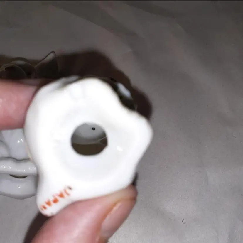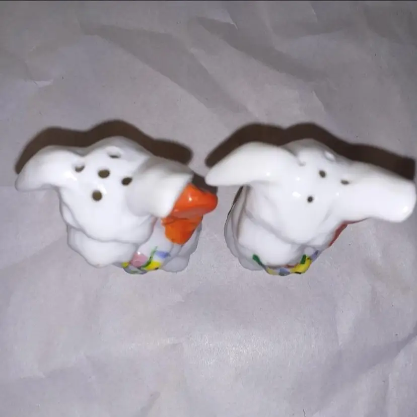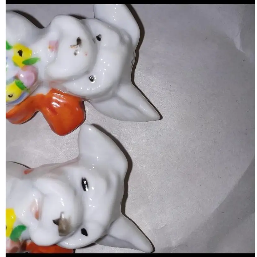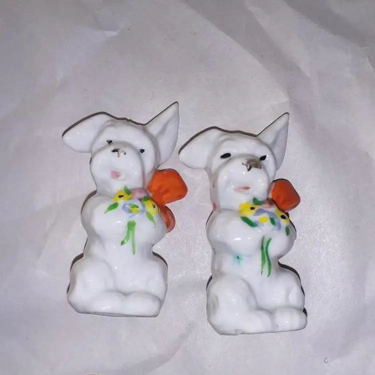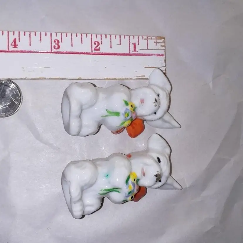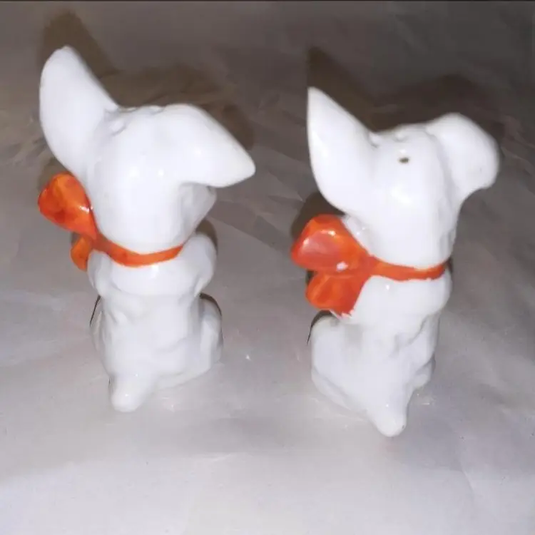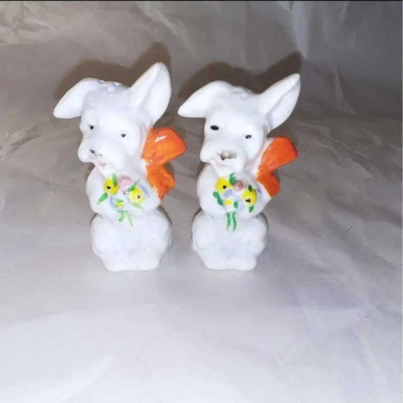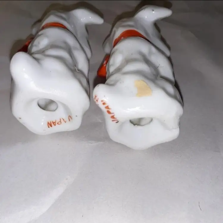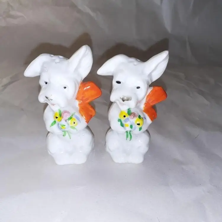 Adorable white terrier sitting up holding a bouquet of flowers with a big radioactive red bow around their neck. This adorable set of salt and pepper shakers is marked Japan on the bottom no chips cracks or crazing to have a manufacturer's bubble on the bottom which is pictured but was part of the manufacturing process please see all pictures as they are the best description all items from a smoke-free home with pets experience fragile shipper
