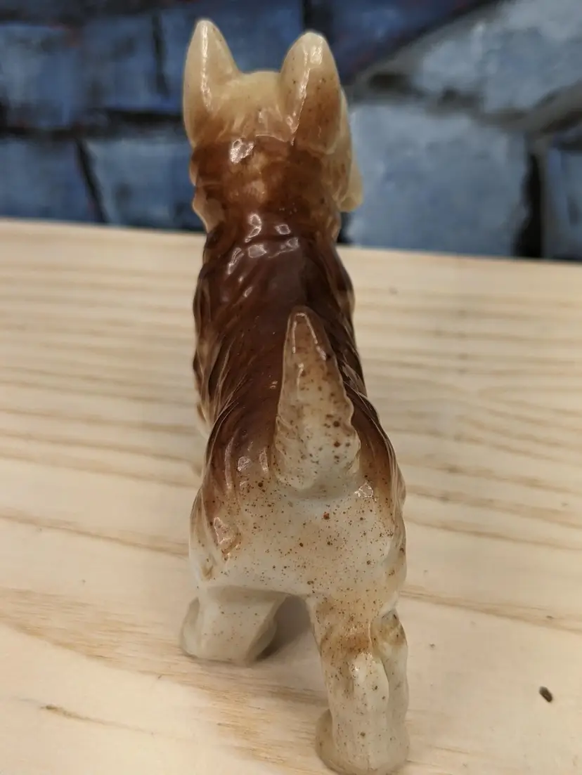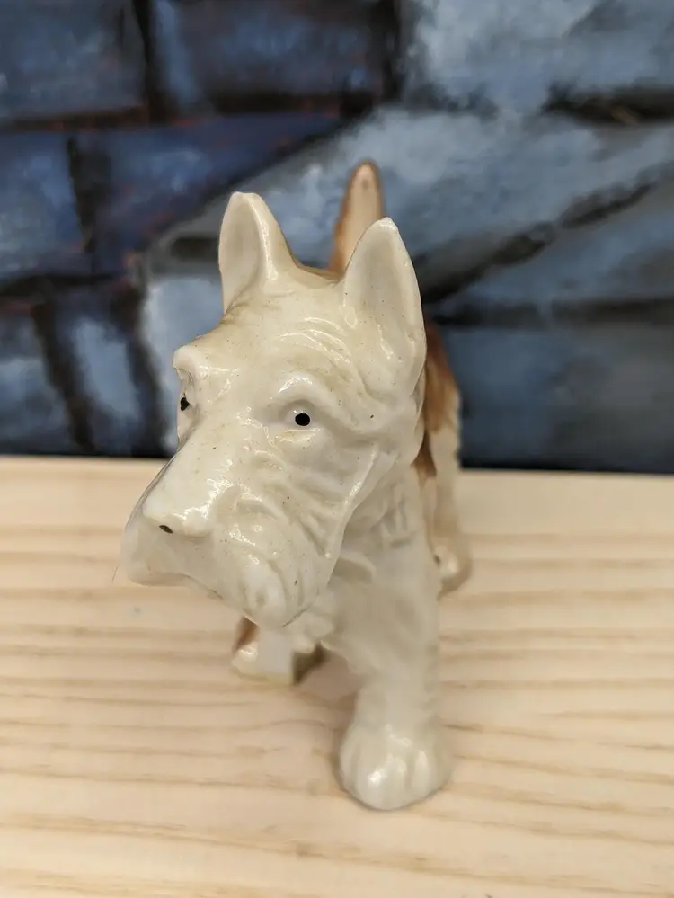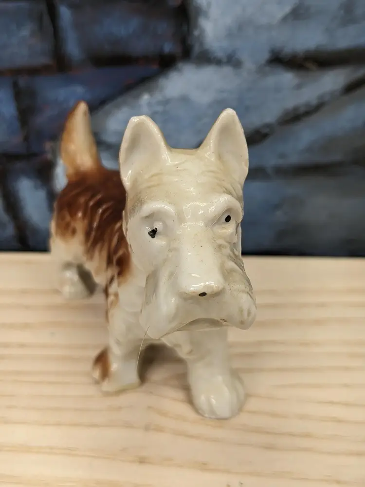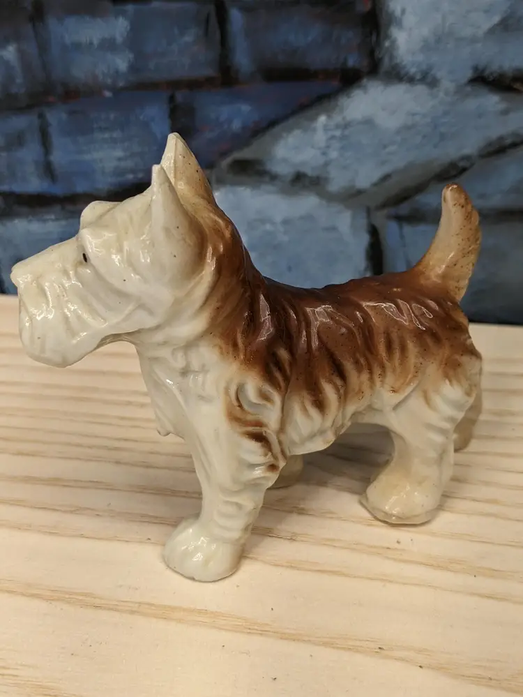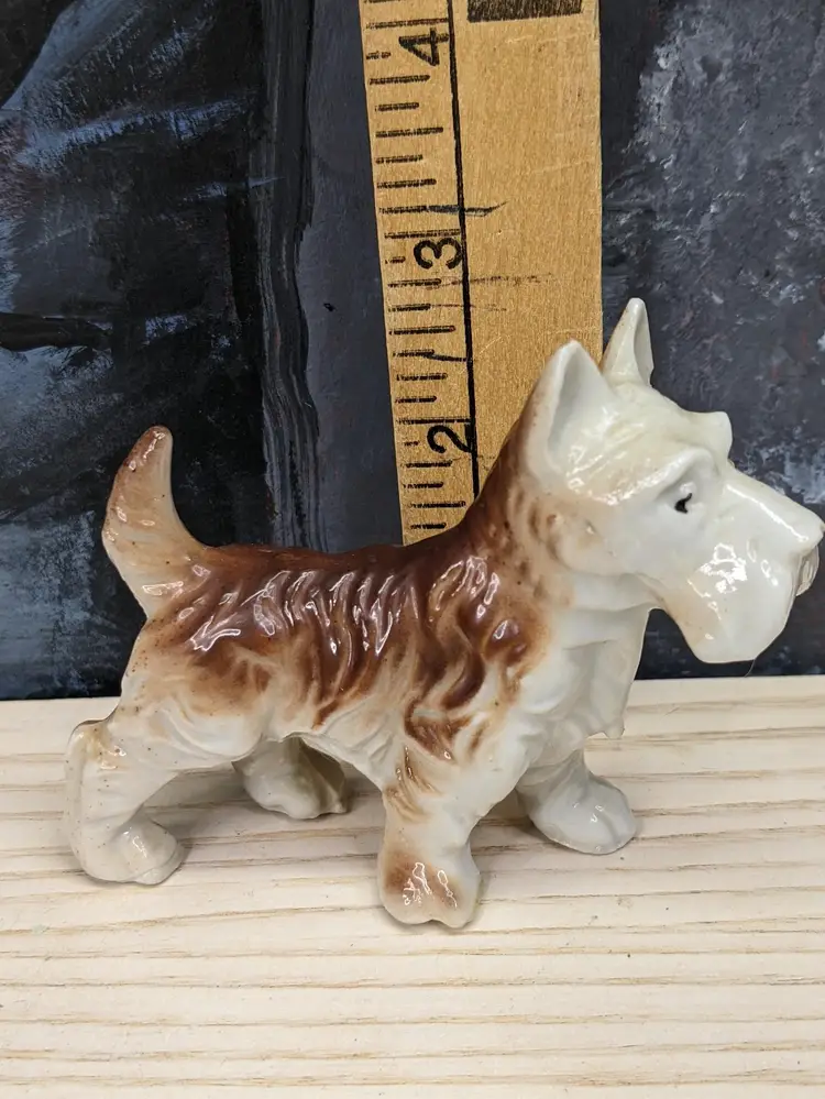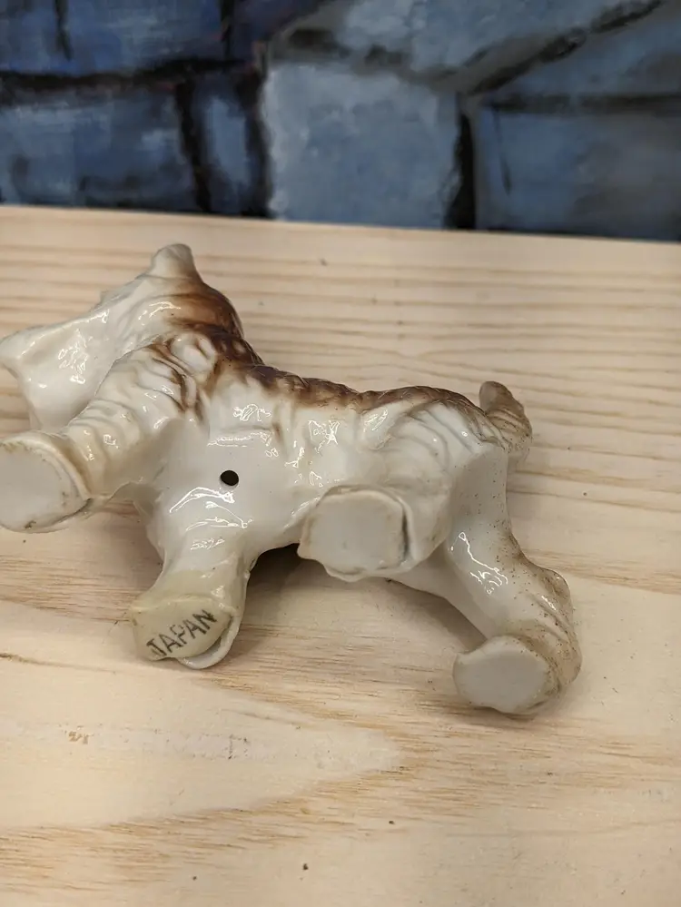 Vintage Terrier Puppy Dog Porcelain Figurine Scottie Westie Japan 3" Tall and 3 I/2 in long . He is Small Brown and beige color with his tail up. Very cute. He has Japan stamped on the bottom of his foot. Very good condition no chips or cracks . Please check the photos for details .