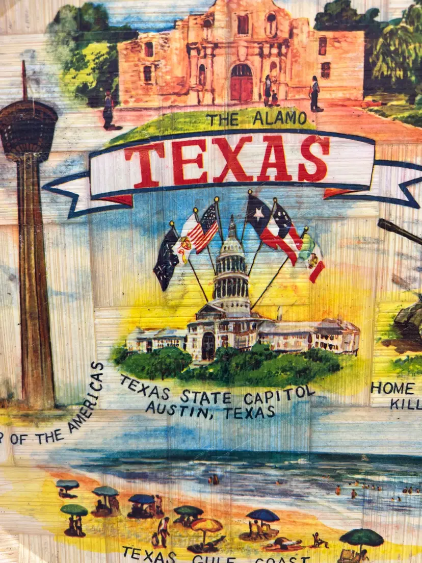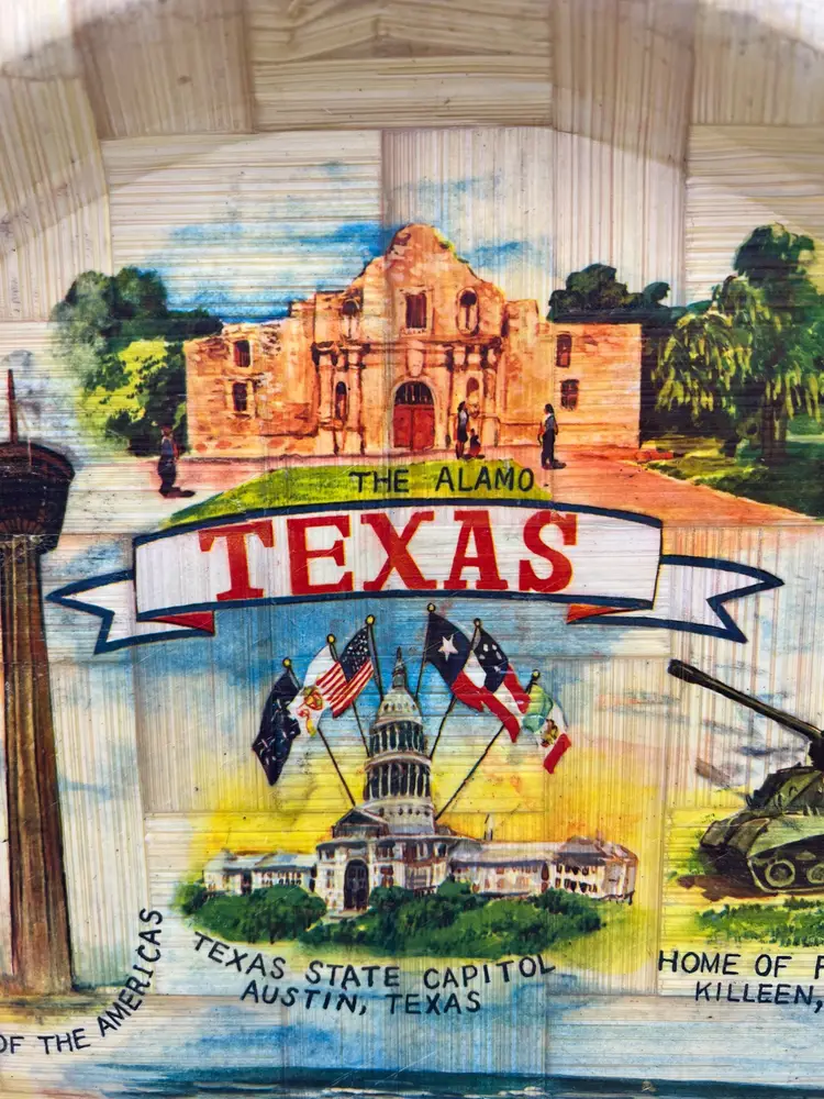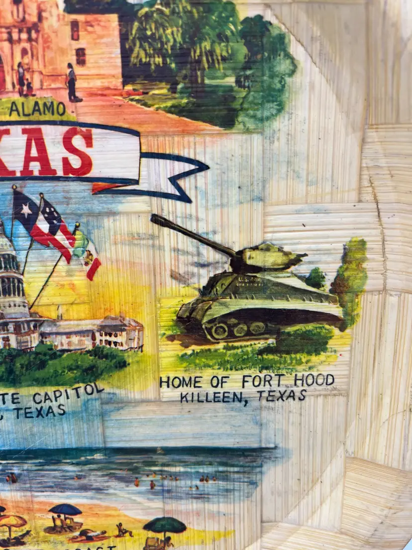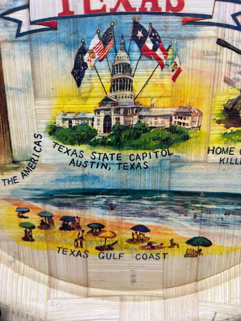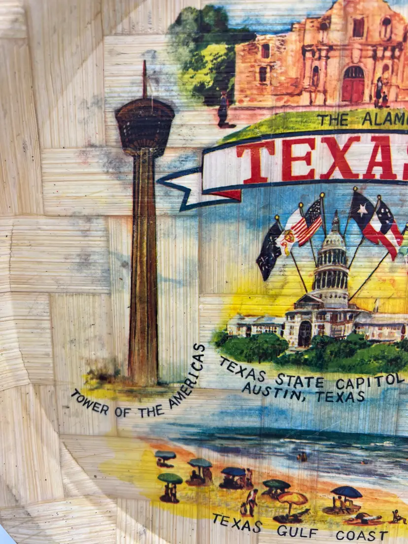 Vintage round bamboo souvenir tray featuring colorful scenes from across Texas. The printed collage shows the Alamo, Tower of the Americas, the Texas State Capitol in Austin, a Fort Hood tank scene from Killeen, and a busy Texas Gulf Coast beach. The tray is hand woven of genuine bamboo with a clear finish and has the original “color fast, heat & water proof, unbreakable” wording on the back. Measures approximately 13 inches across and works well as wall décor, a bar cart accent, or a lightweight serving tray for drinks or snacks. Great display piece for a Texas, mid-century travel, or souvenir collection.