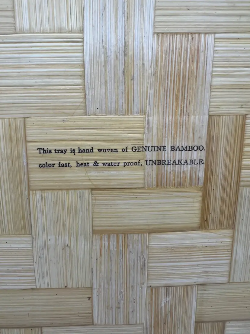 Overall good vintage condition with normal age and use wear. Some surface scratching, light finish wear, and scattered marks to the image. Slight discoloration/spotting to the bamboo weave in places. No cracks or breaks in the tray. Back text remains legible. See pictures for further details on condition.