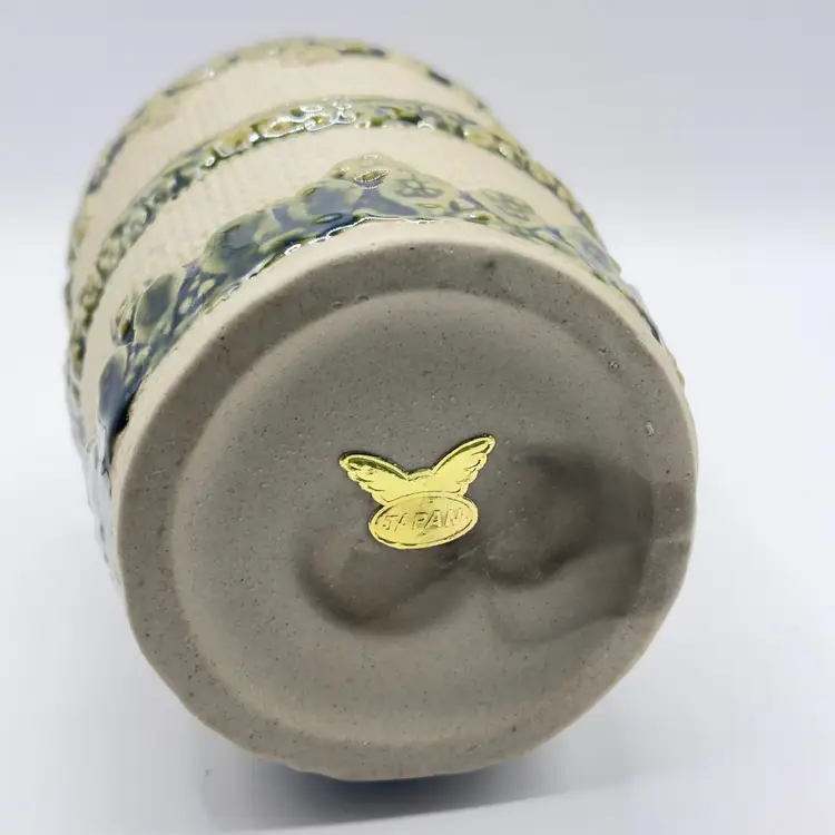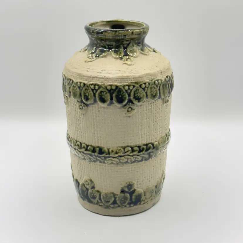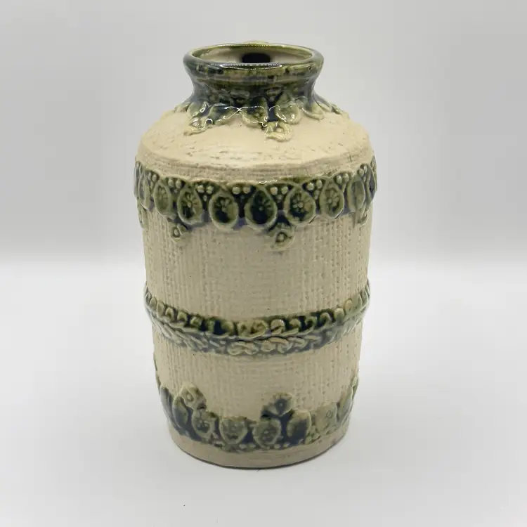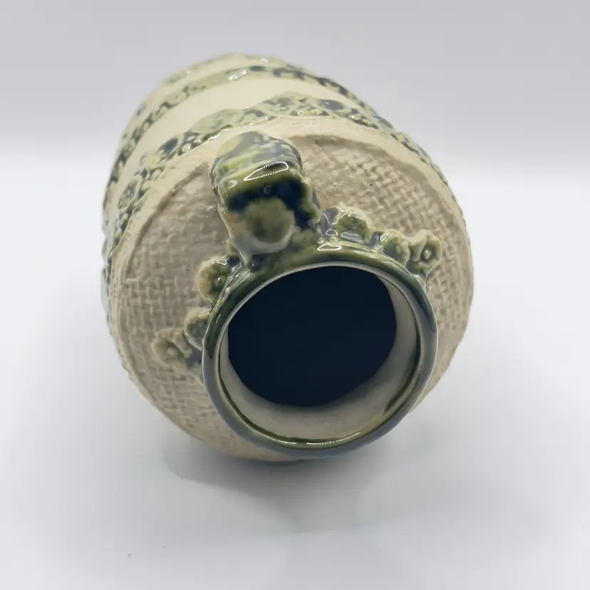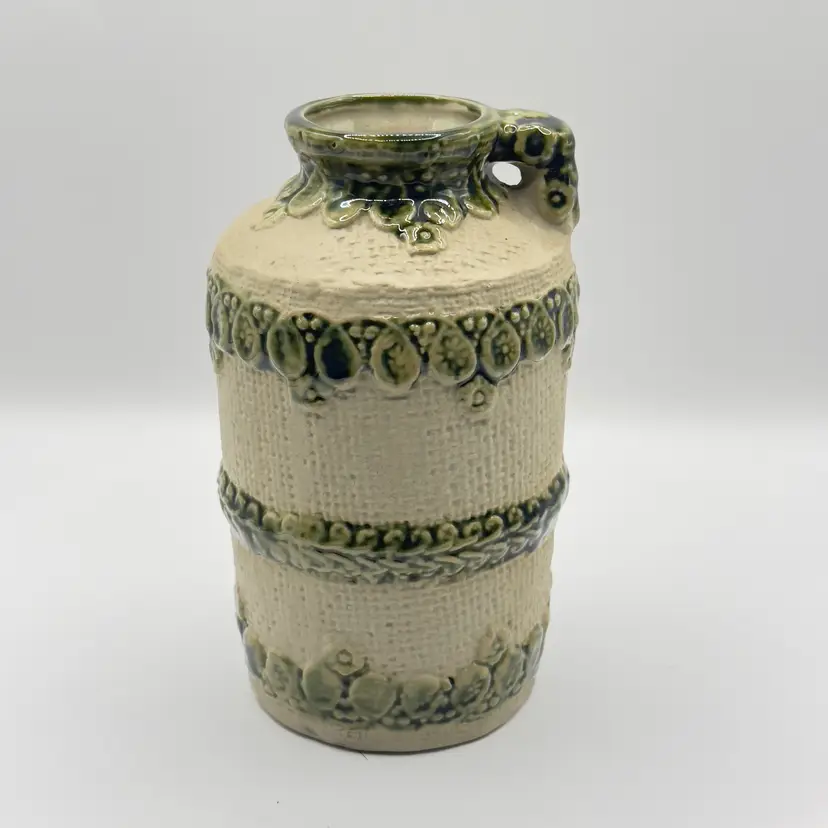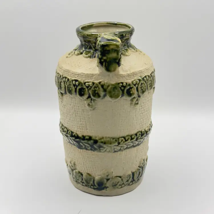 Add a touch of rustic charm to your home with this vintage stoneware jug vase. Featuring beautiful green glaze accents and a textured design, it's perfect for farmhouse-style decor. In excellent condition with no chips or cracks. Measures 6.5 inches. Weighs 2lbs.