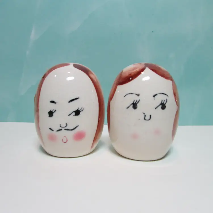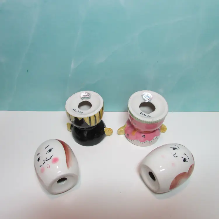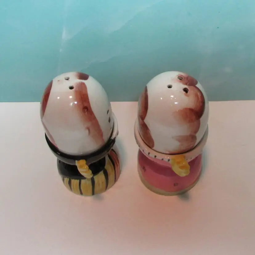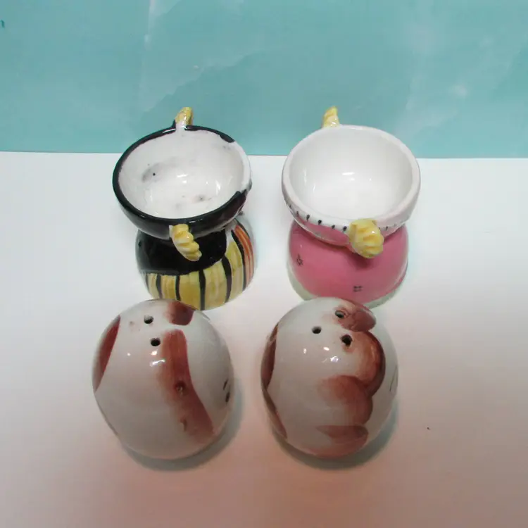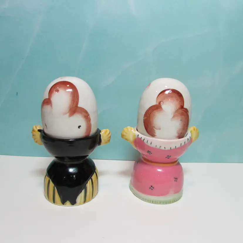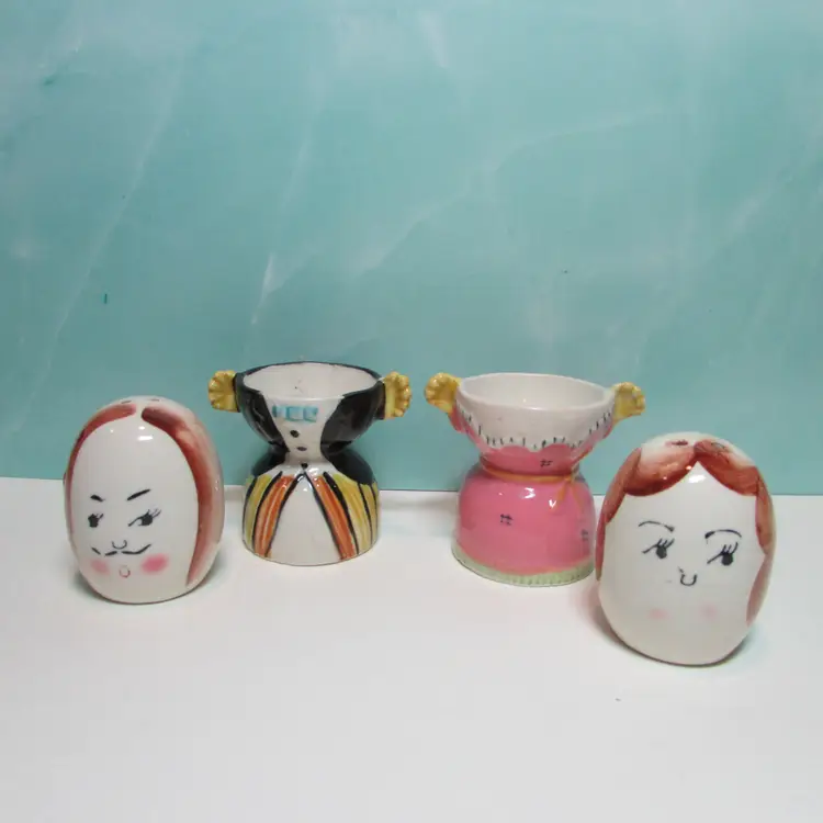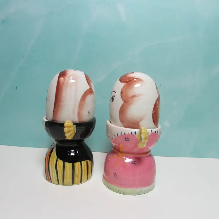 This lovely set has some crazing and paint loss, but still a fun set to display. Each shaker is about 2 1/2" tall and when in the egg cup it is about 4 3/4" tall. This is shipped from a smoke free home. Thanks for looking!