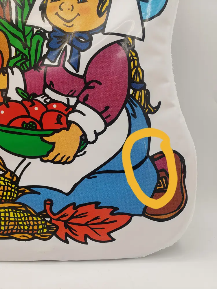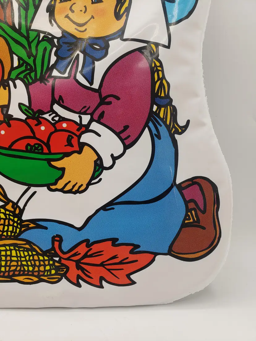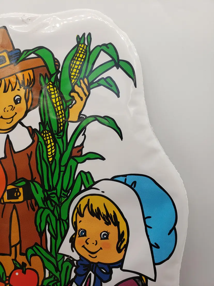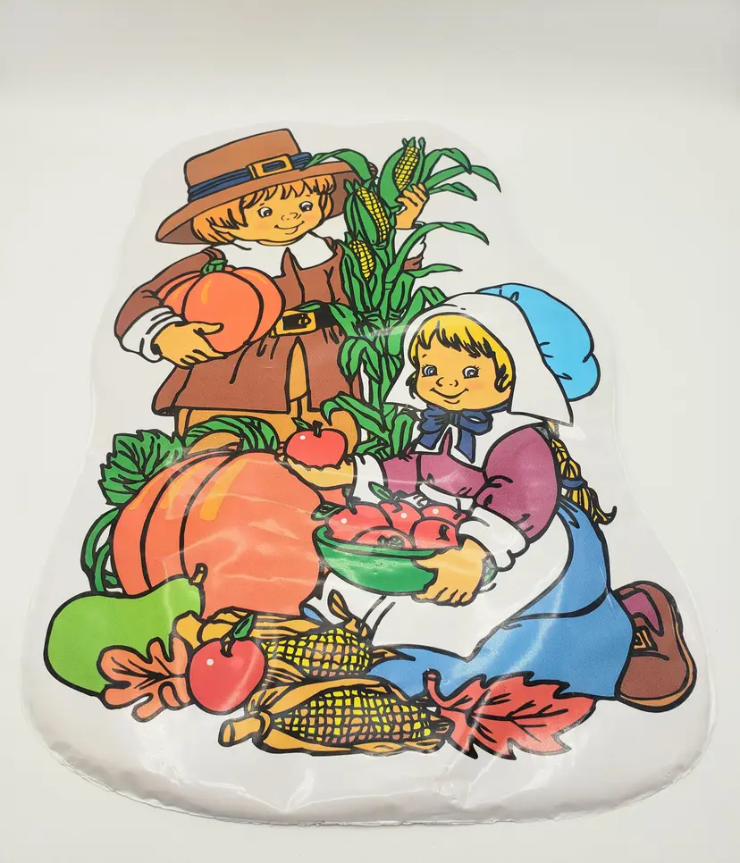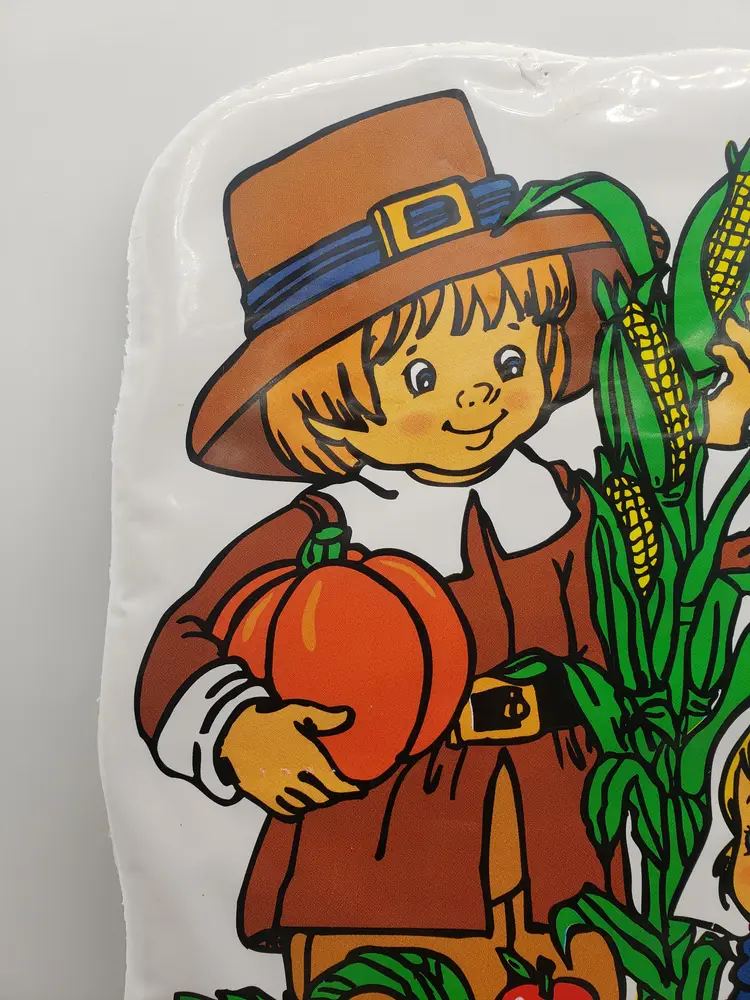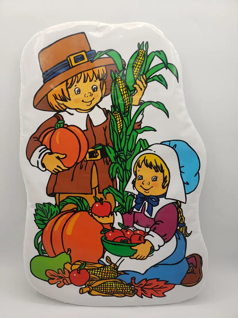 Vintage Thanksgiving Decoration Die Cut Wall Decor Little Pilgrims Harvest 1980s. A sweet, vintage item. Measures about 17.5" long and 11.5" wide. Vinyl over cardboard. Flaws: a few thumb tack and tape markings; small tear on front; repaired tear on back. No odors. Non-smoking home.