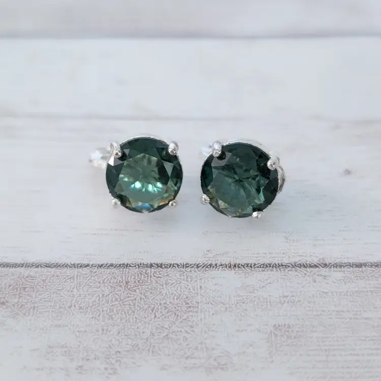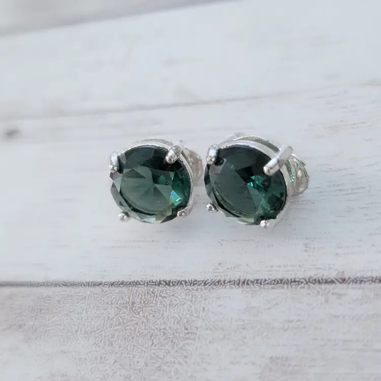 These earrings measure about 7/16". 7/16" = 0.4375". I am not sure of the material of the gems. Some marks and signs of wear to the silver tone, with possibly a small amount of silver tone chipping to the front.