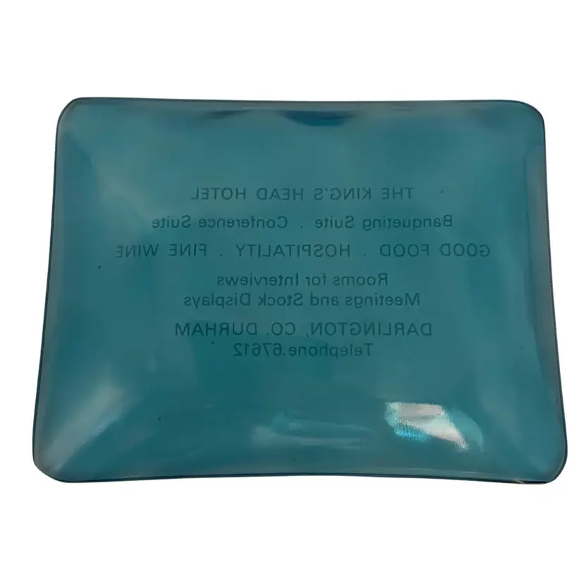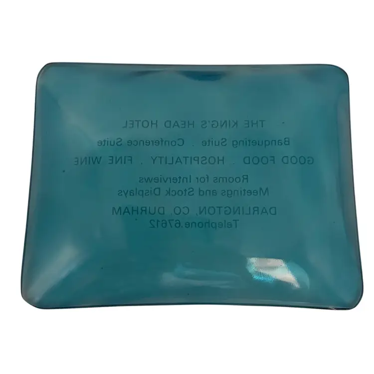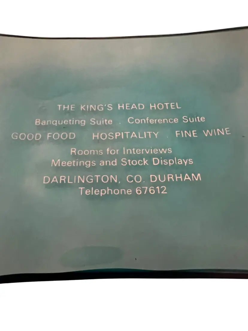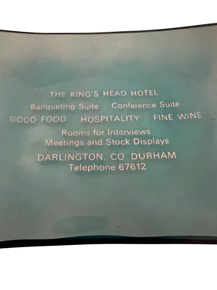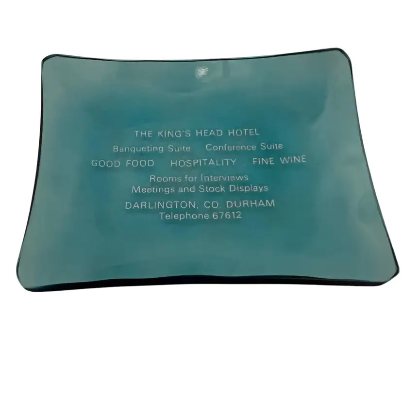 This vintage aqua blue glass trinket dish advertises The King’s Head Hotel in Darlington, County Durham, England. Featuring white lettering that highlights the hotel’s banqueting and conference suites, fine food and wine, and meeting spaces, it captures a slice of mid-century hospitality marketing. Whether used as an ashtray, trinket dish, or decorative piece, it’s a charming souvenir with local flair. Measures approximately 4.75" x 3.5".