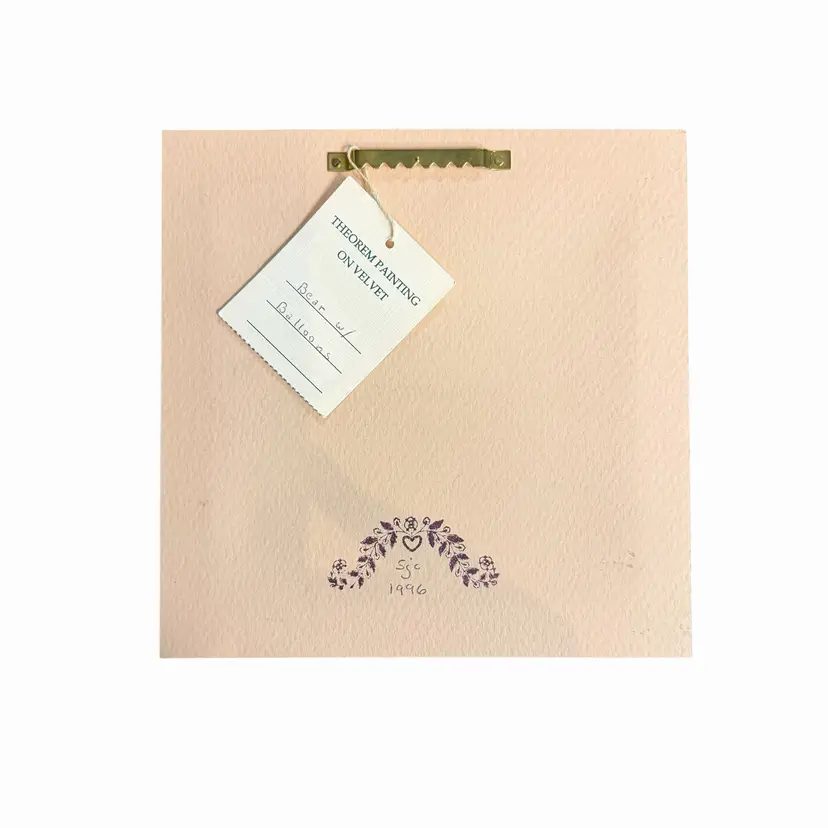 Sweet vintage framed theorem painting on velvet featuring a teddy bear holding two balloons. This piece has a soft, cozy look that works beautifully in a nursery, child’s room, or anywhere you want a touch of charming vintage decor.