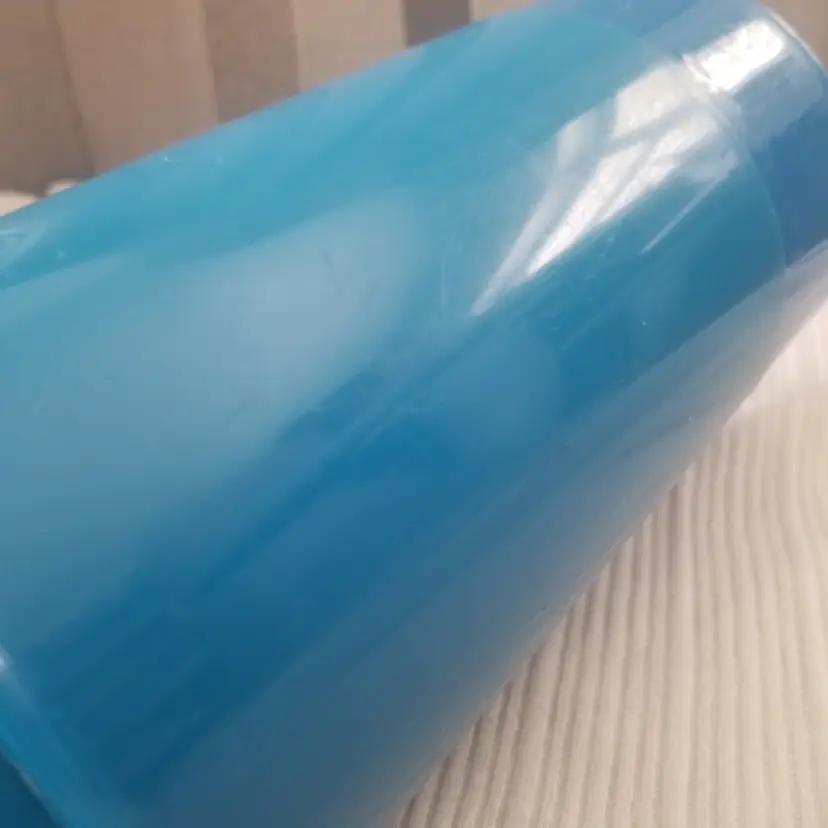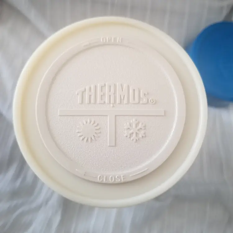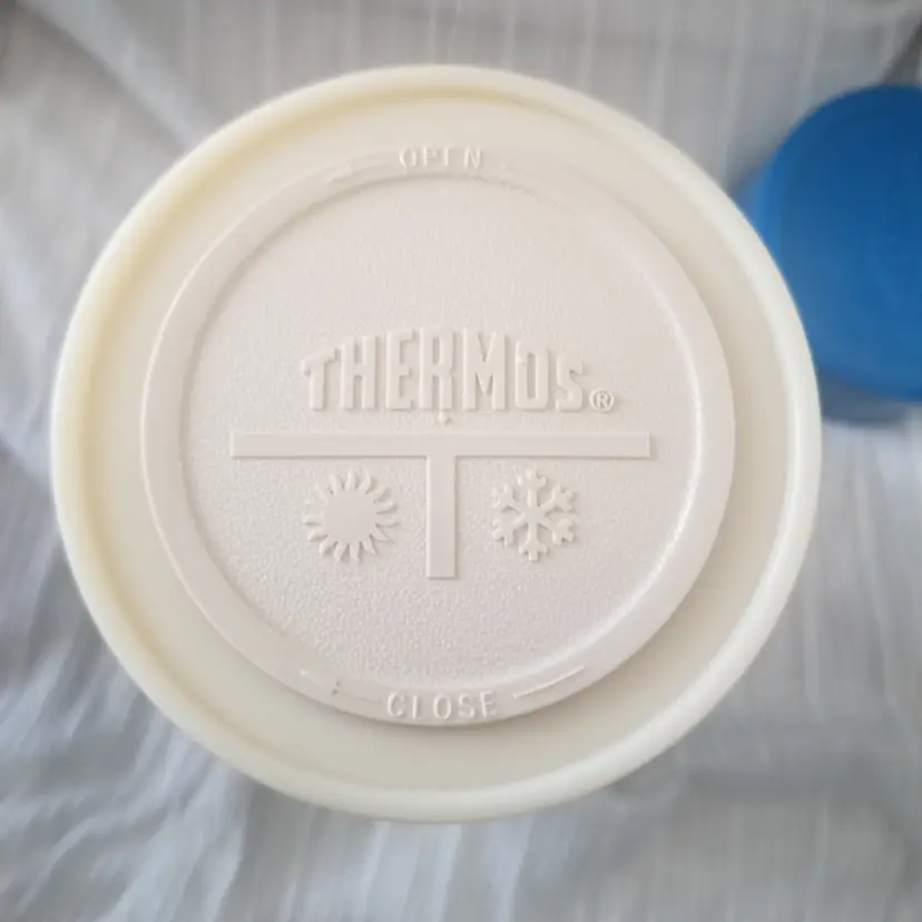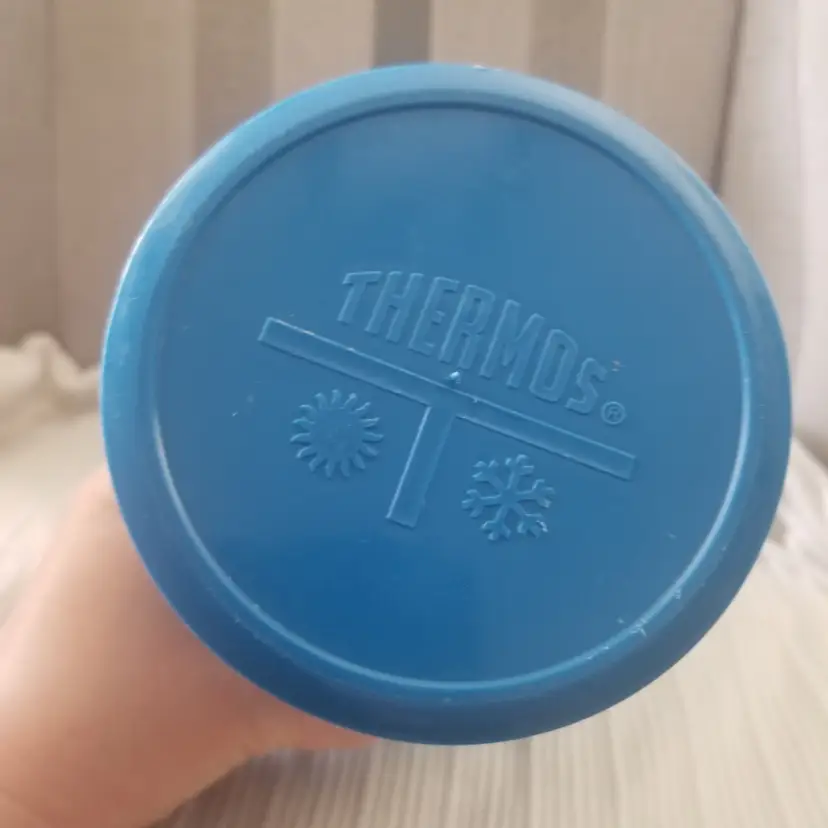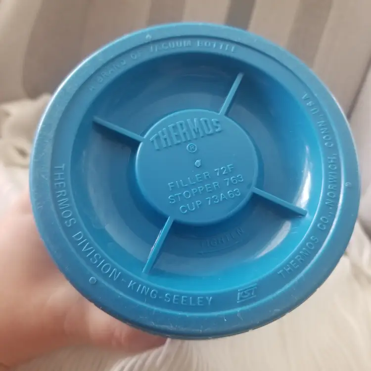 Vintage Thermos King-Seeley vacuum bottle in blue. Filler 72F, Stopper 763, Cup 73A63. Features Thermos and Hot/Cold symbols on the lid. There is also a graphic for this on the side in a gold color, but it shows wear. Outside of the Thermos has overall noticeable wear like scuffs and scratches, but the inside is in good shape and only appears to have some minor staining. Measures approx. 8.5” tall, 3.75” across the top, and 4.25” across the bottom.