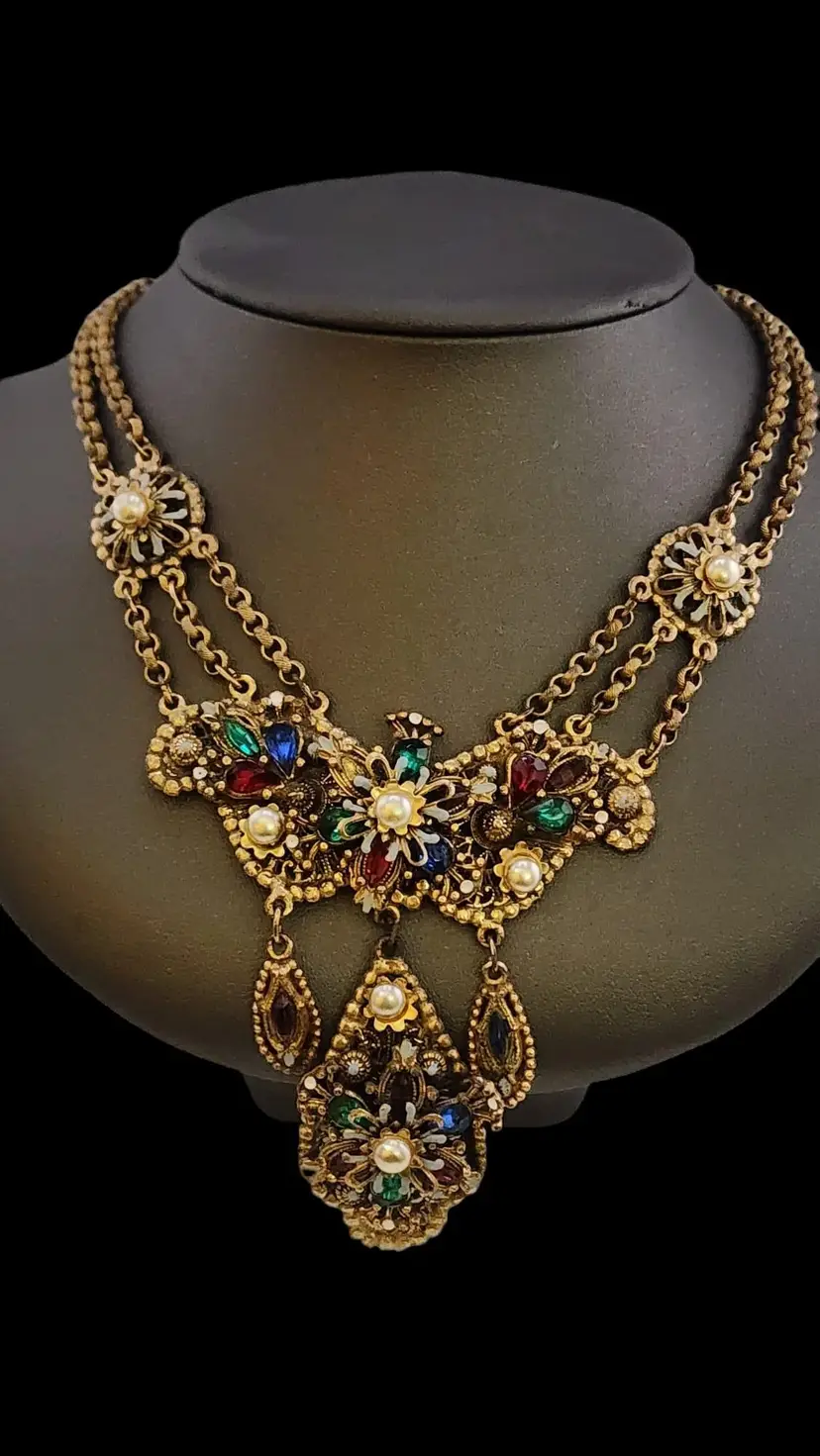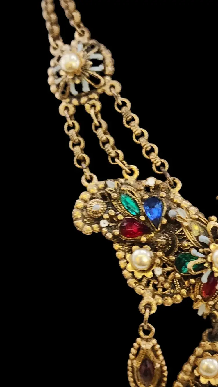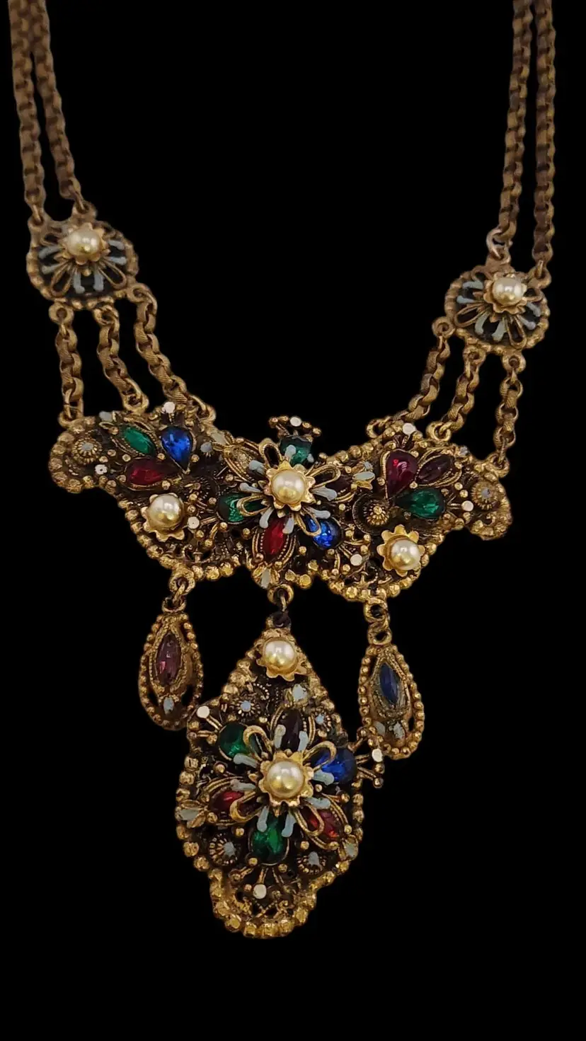 Size: 16.5" with a 3.75" drop Color: Gold, Multicolor Condition: Very good vintage Era: Circa 1940s Details: By Rice-Weiner, from the 40s, in nice condition, enamel and stones look good, as well as the brass. There is some darkening on the back chain, which is typical on these pieces. Push-in clasp has darkened and does have a bit of verdigris. Very well made, riveted, signed.