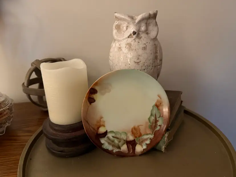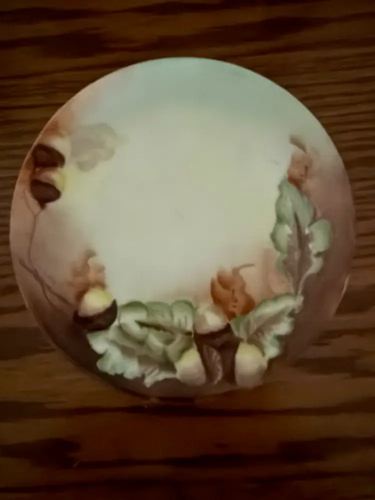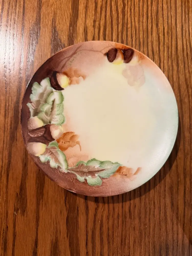 Add a touch of Old World charm to your collection with this beautiful vintage hand-painted plate from Thomas Porzellanfabrik, Bavaria, Germany. Dating from the early 1900s, this 6-inch porcelain plate features a rich autumnal motif of acorns and leaves, delicately painted in warm, earthy tones.