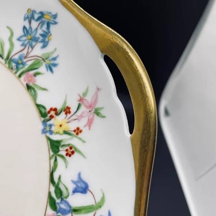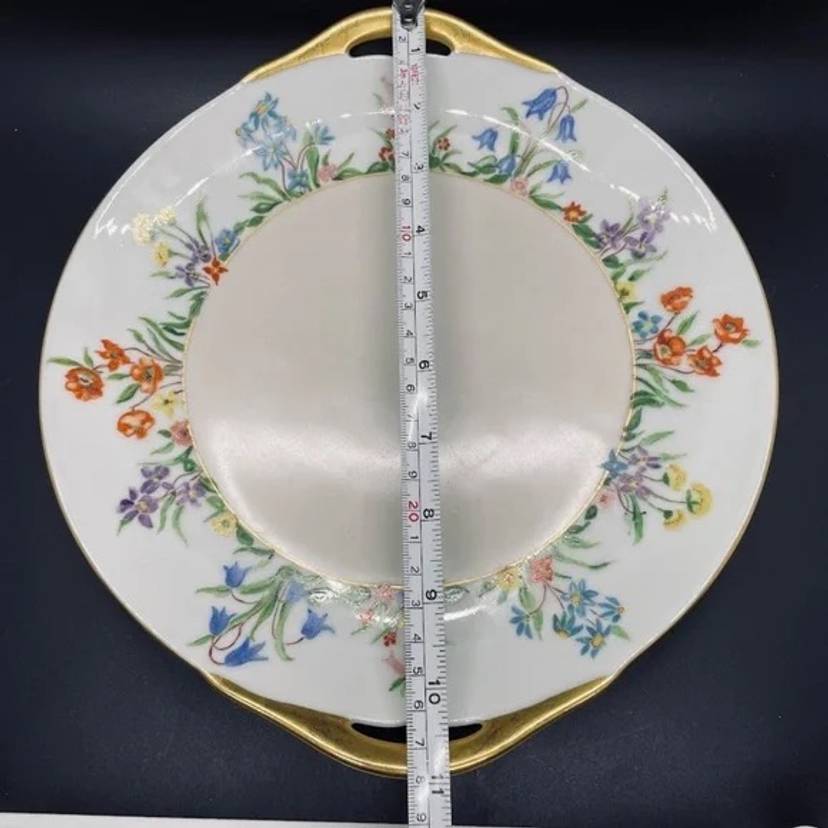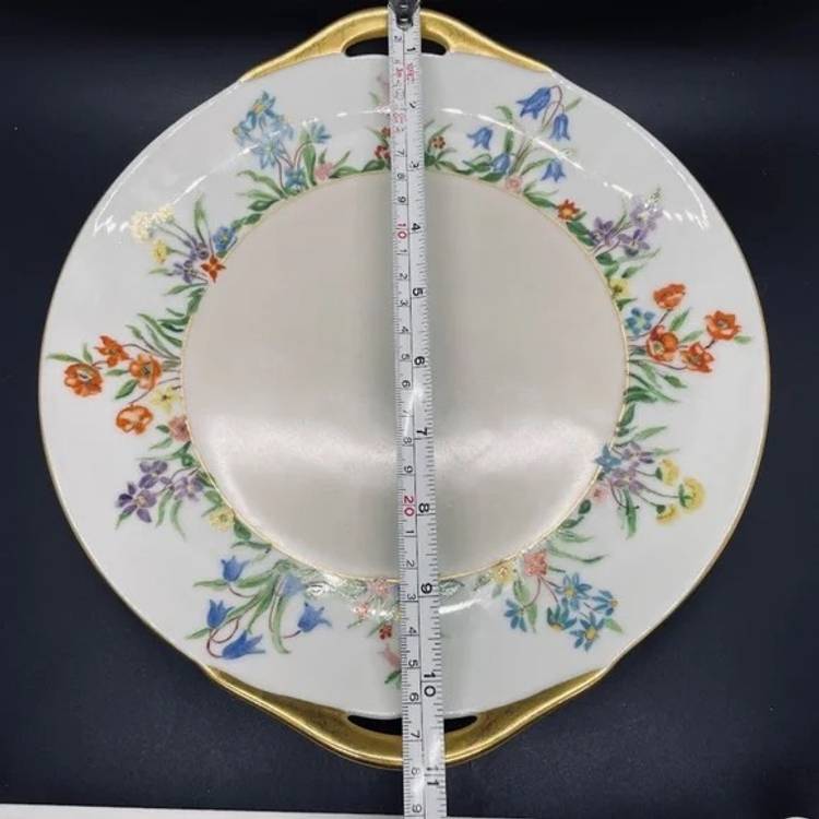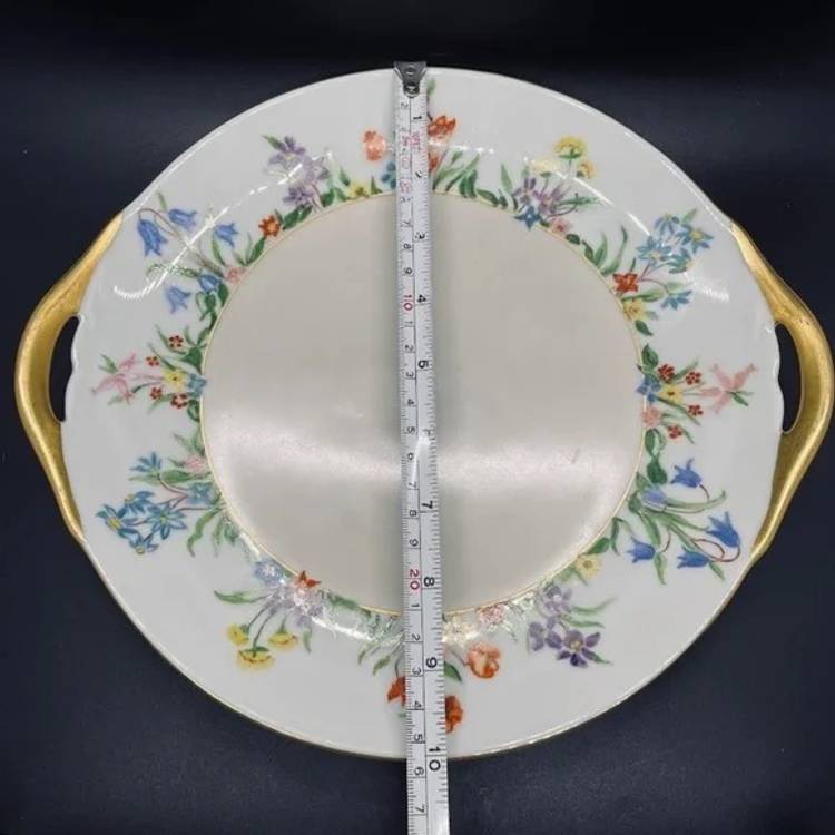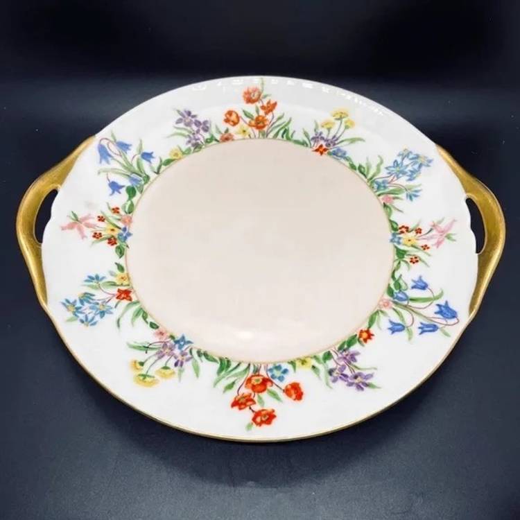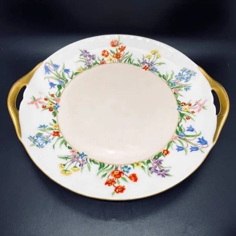 Keywords: Vintage Antique, 1930s, Thomas, Bavaria, Germany, Rosenthal, Porcelain, Fine China, Blank, Hand Painted, Handpainted, Two Handle, Handled, Cake, Plate, Platter, Serveware, Serving, Dessert, Dish, Dinnerware, Colorful, Bright, Floral, Flower, Wildflower, Meadow, Gold Trim, Marked, Signed, Dated, Bouquet, Garland, Easter, Spring, Home, Kitchen, Dining