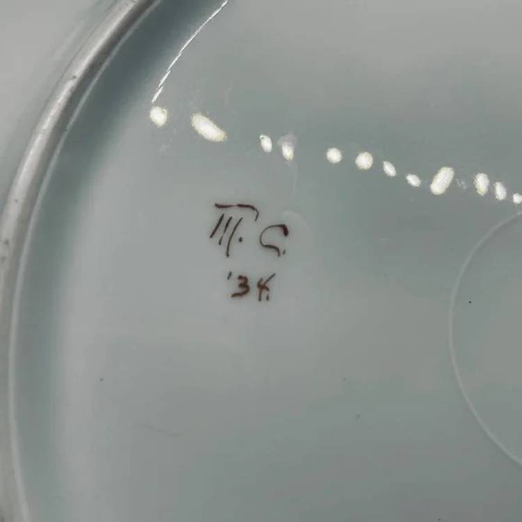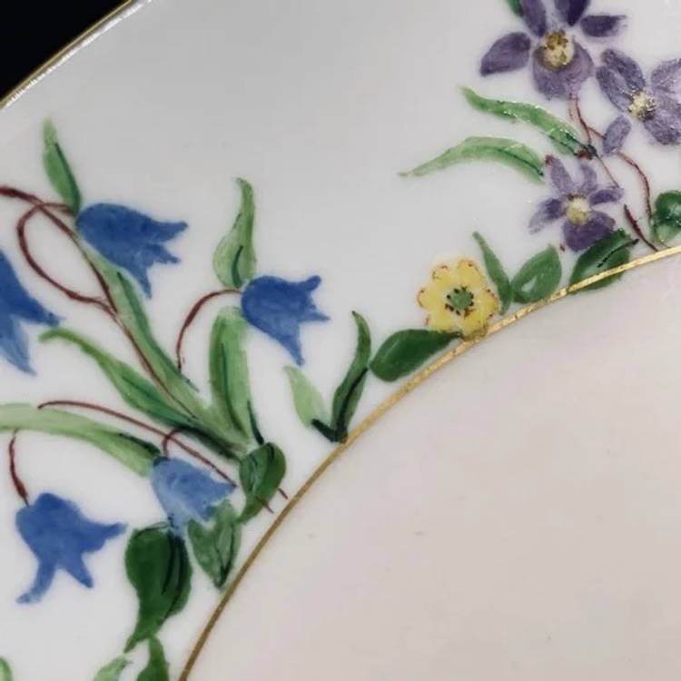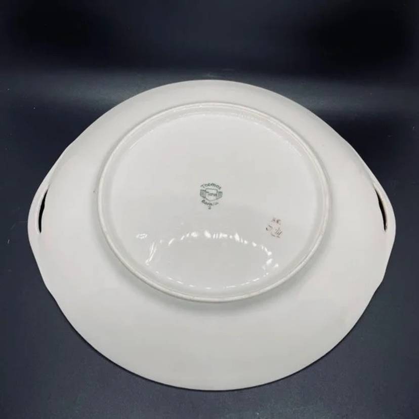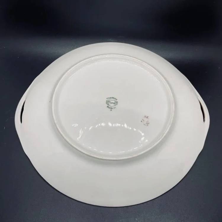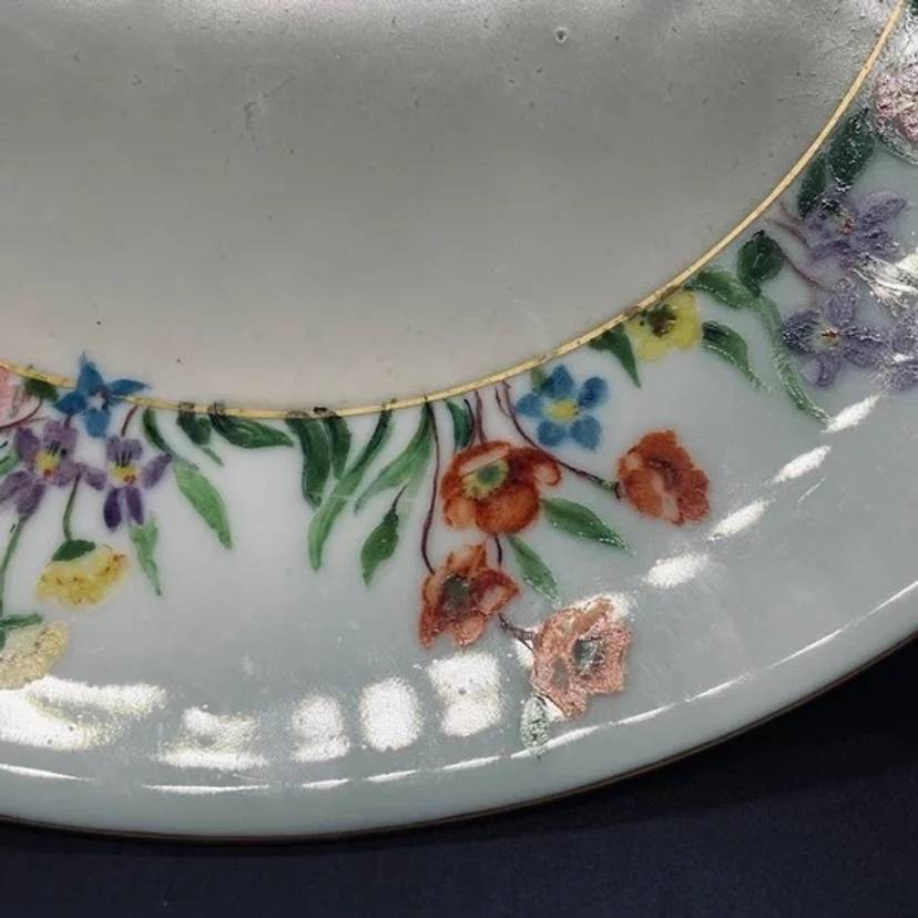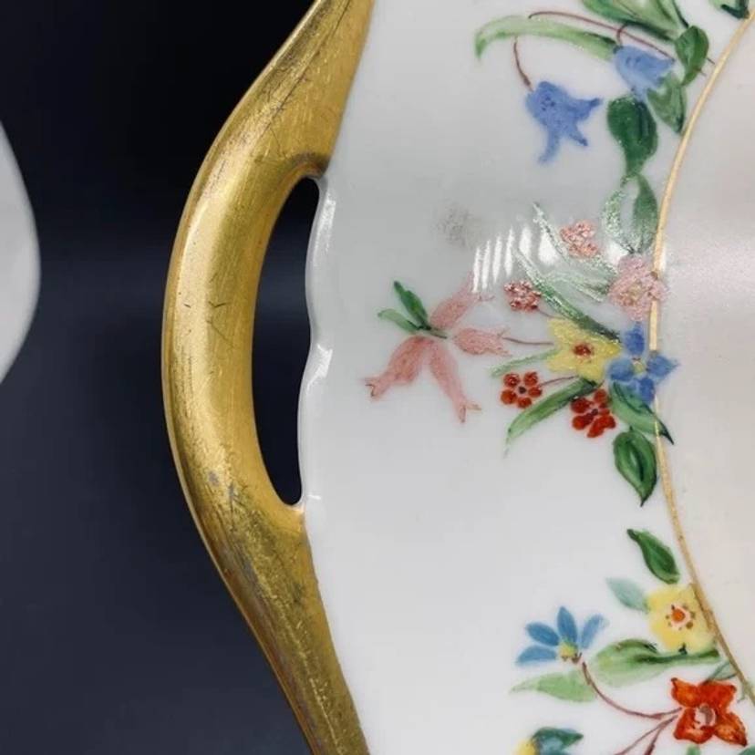Keywords: Vintage Antique, 1930s, Thomas, Bavaria, Germany, Rosenthal, Porcelain, Fine China, Blank, Hand Painted, Handpainted, Two Handle, Handled, Cake, Plate, Platter, Serveware, Serving, Dessert, Dish, Dinnerware, Colorful, Bright, Floral, Flower, Wildflower, Meadow, Gold Trim, Marked, Signed, Dated, Bouquet, Garland, Easter, Spring, Home, Kitchen, Dining