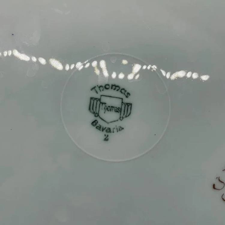 Beautiful Hand Painted Thomas Bavaria Porcelain Two Handle Cake Plate with a Colorful Wildflower Floral Bouquet Garland and Gold Trim. It's hard to tell in the photos, but the bottom center area is a light pink color. Perfect for Spring or any occasion. the Thomas mark dates the plate to 1930 and the signature dates the painted deisgn to 1934. No chips or cracks. Does show some signs of wear and use mainly in the form of scratches and scuffs to the plate surface and wear to the gold trim. Please see pictures.