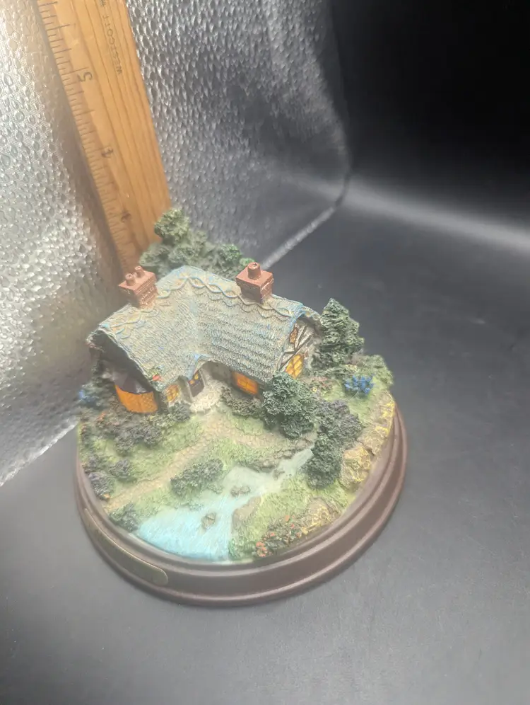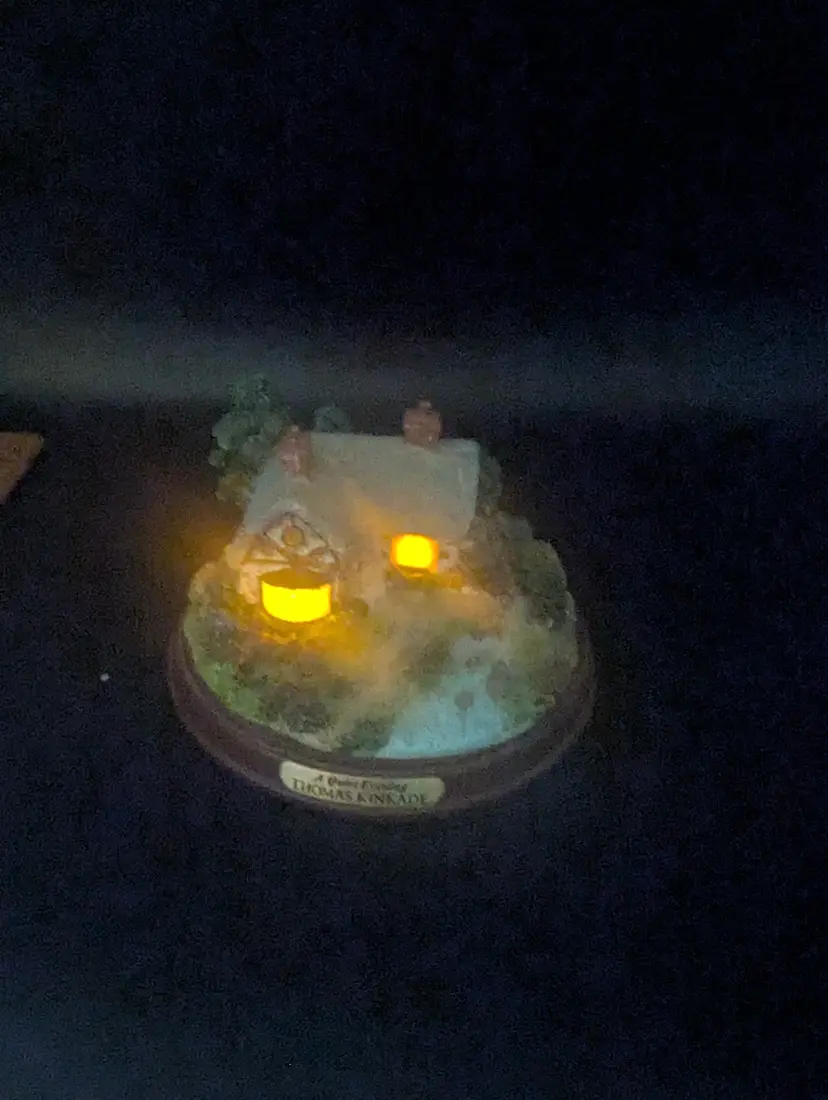 This is a lovely Vintage Thomas Kinkade "A Quiet Evening" Lighted Cottage Collection Miniature Sculpture. It lights up and requires 2 AA batteries. No chips or cracks. Please see all pictures for condition and measurements.