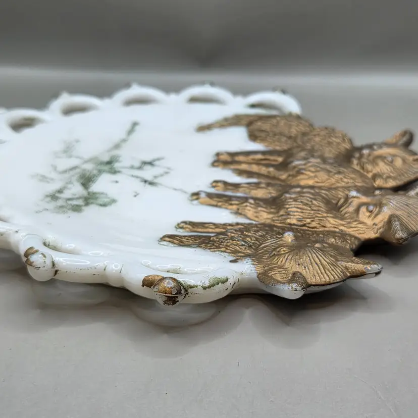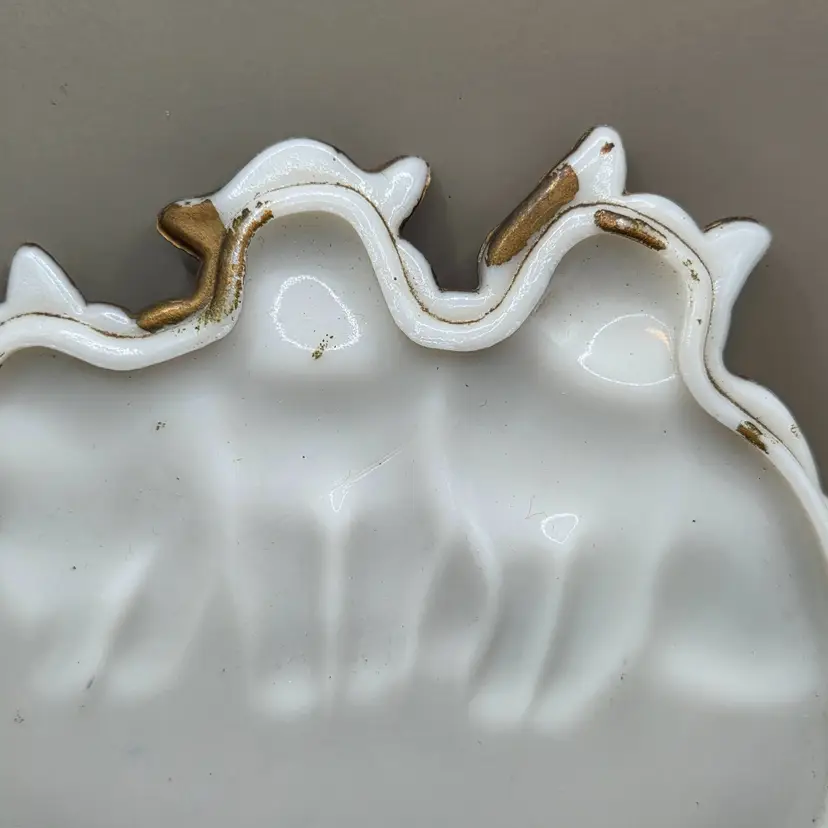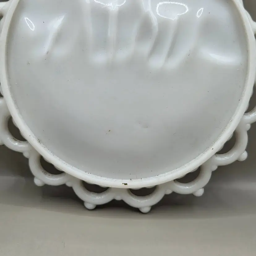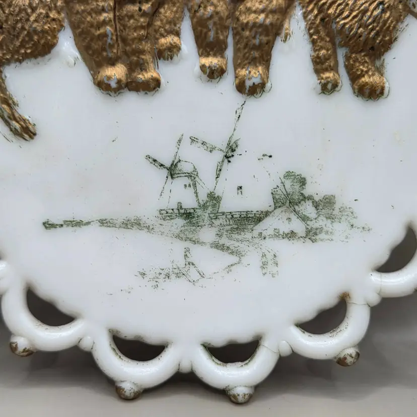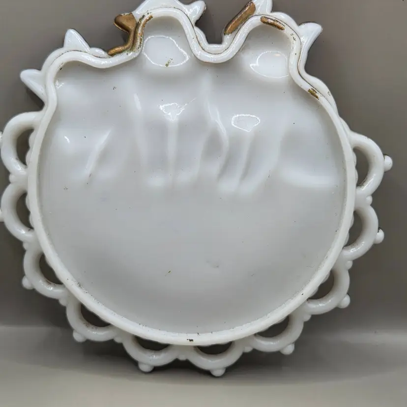 The Vintage Three Cats Lace Edge Milk Glass Style Wall Plaque with Gold Tone Decor is a decorative plate featuring a vintage design with a lace edge. Made of milk glass in a white color, this original Westmoreland product is machine washable and showcases an elegant cat theme. Produced in the United States, this plate adds a touch of charm to any occasion with its intricate details and unique style. Perfect for collectors or those looking to enhance their home decor with a nostalgic touch