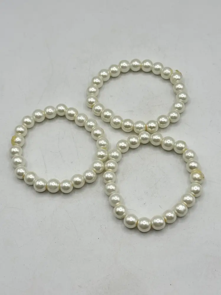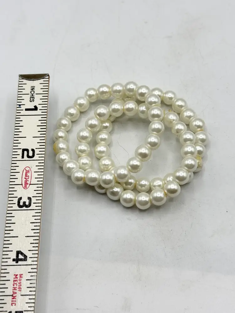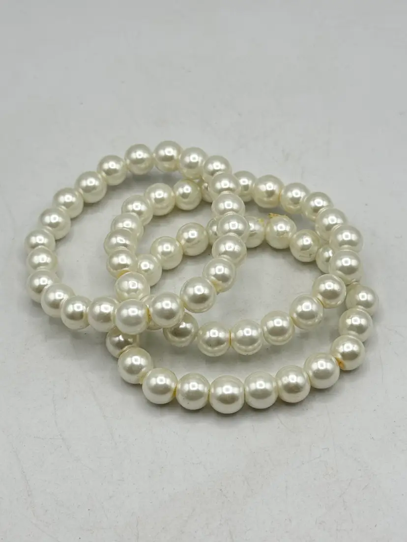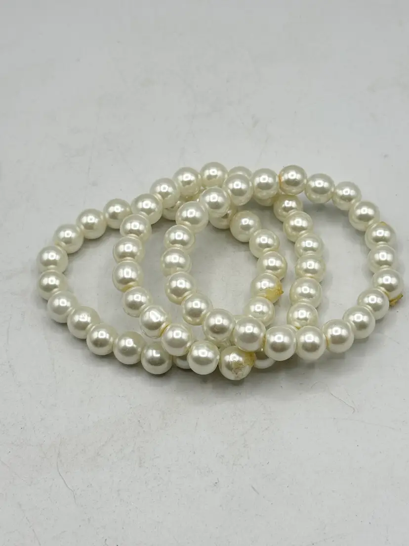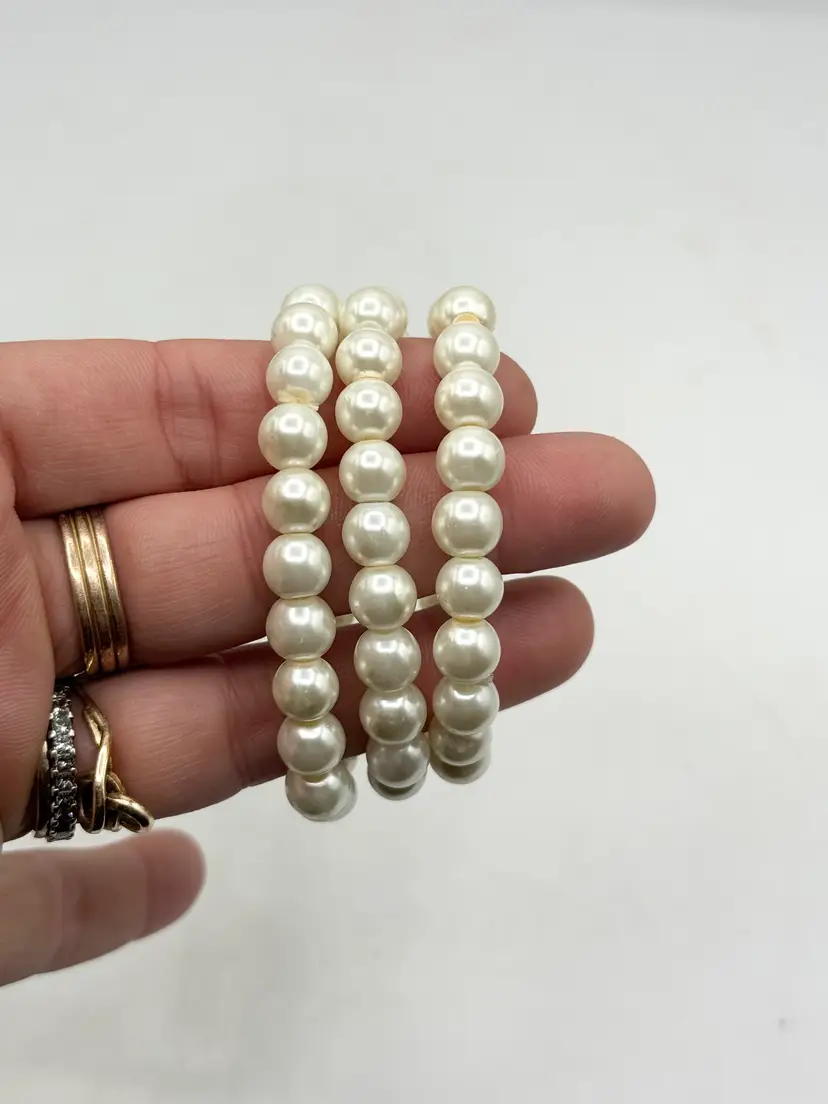 Vintage three strand faux pearl stretch bracelet set. Vintage bracelet set. Three strands of stretch faux pearls. Vintage bracelet set. MN54GH.