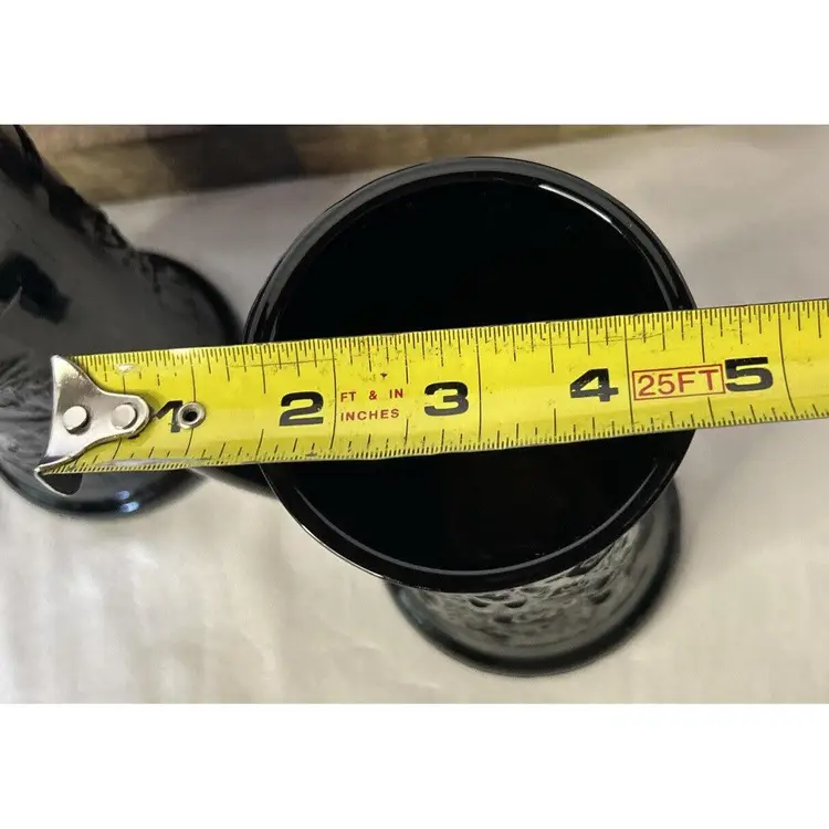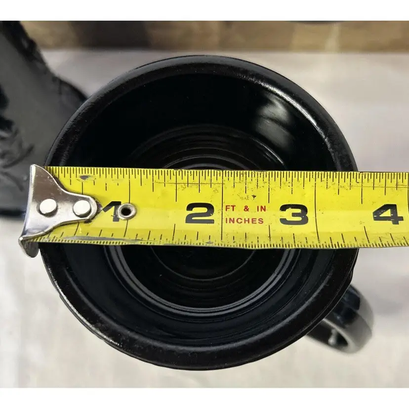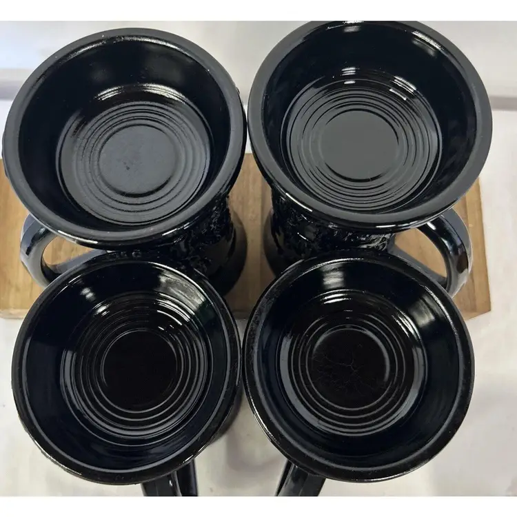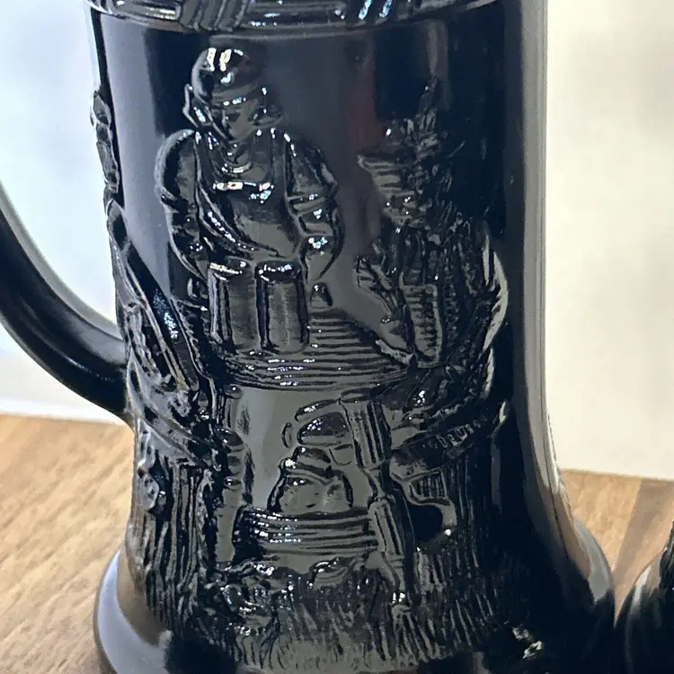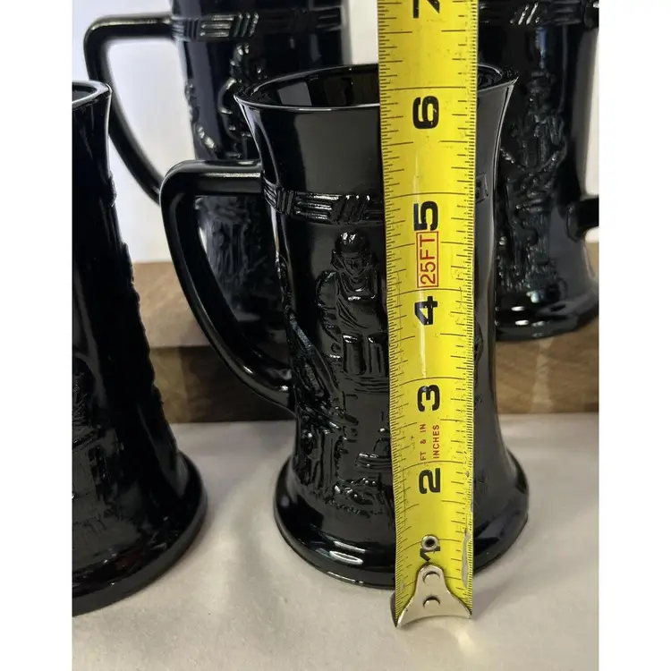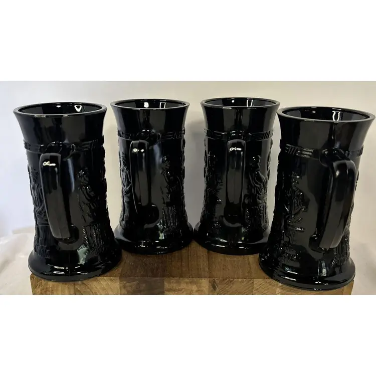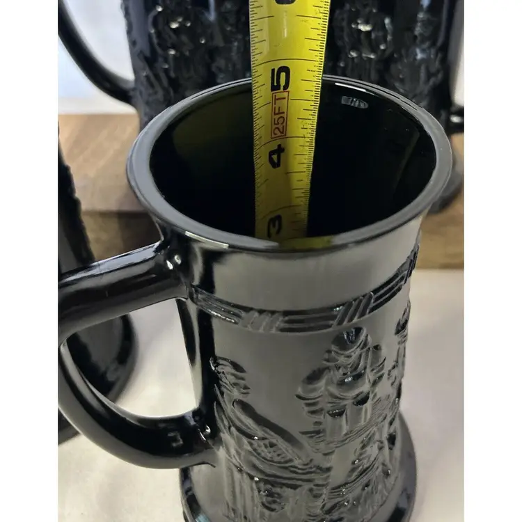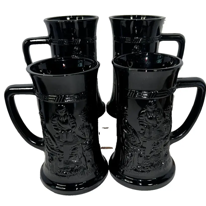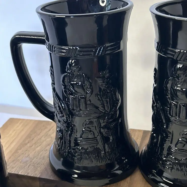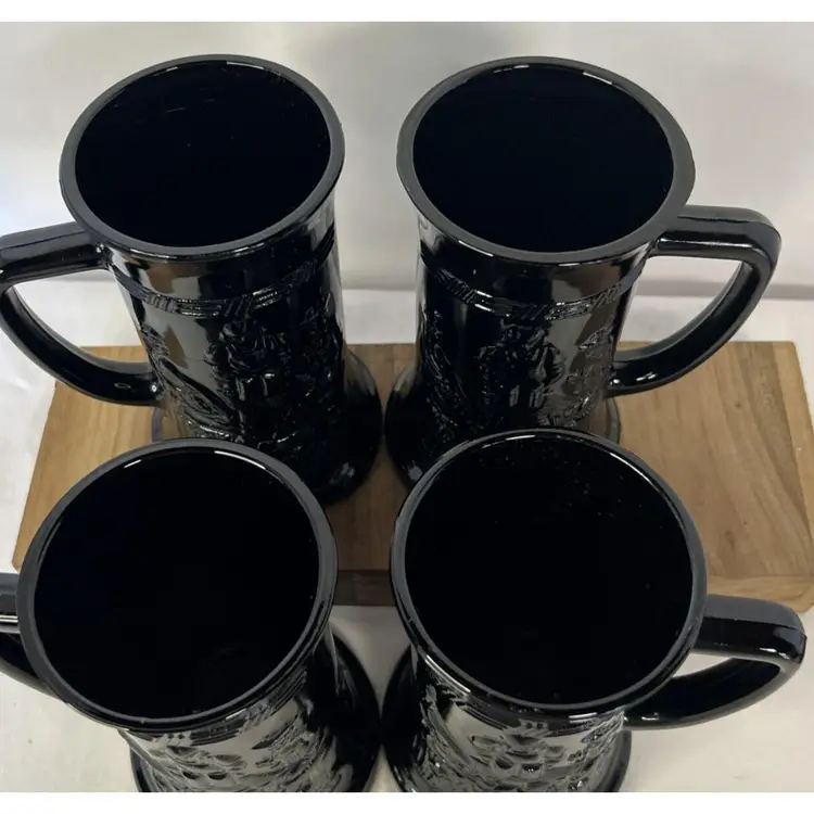 Indulge in the vintage charm of these Tiara Black Milk Glass Steins Beer Mugs by the Indiana Glass Company. The set of four large beer mugs feature the iconic Tiara Tavern Scene pattern and are made of high-quality black milk glass. Each measures 6" inches in height and 5" inches wide (which includes the handle). These mugs are perfect for enjoying a cold brew on a lazy afternoon.