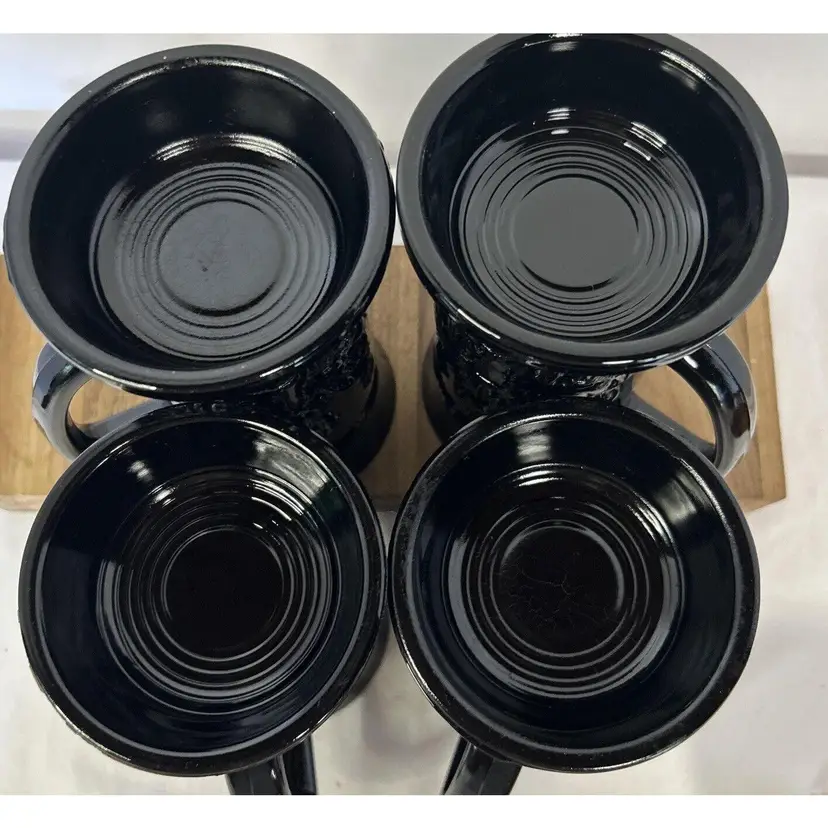 This vintage set of four Black Milk Glass Tavern Scene Mugs in the Tiara Pattern by Indiana Glass Company are in excellent vintage preowned condition. These beautiful black milk glass beer steins or mugs do not have any chips, cracks or discoloration, you won’t be disappointed when you get these home. They are absolutely stunning and will great on display on a shelf or curio cabinet.