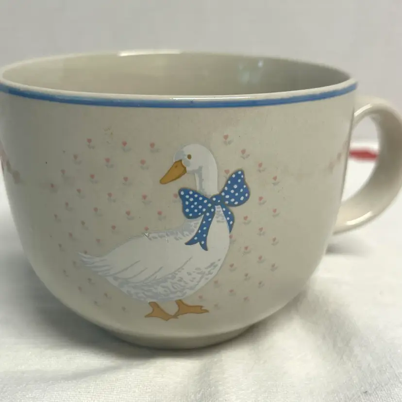 This item is a vintage Tienshan Stoneware mug featuring a white goose with blue bow and dishwasher/microwave-safe construction. EUC with only minor surface wear or scratches. No chips or cracks.