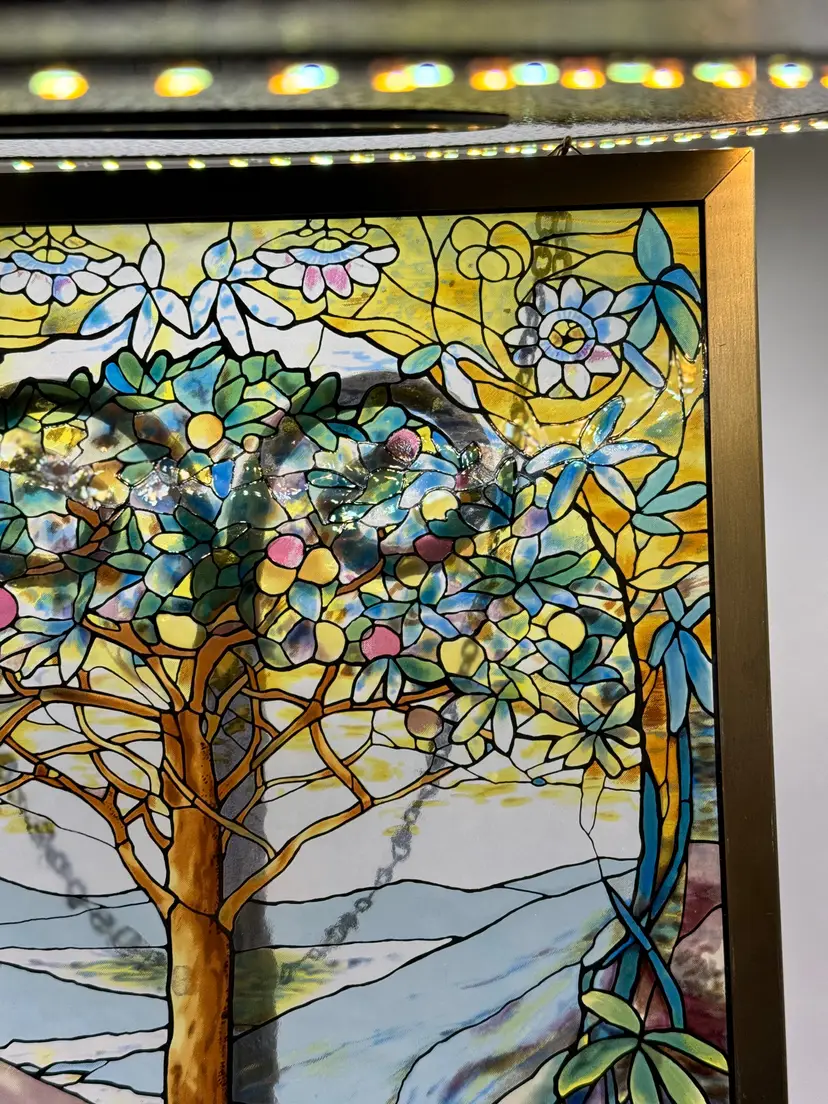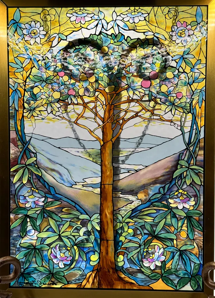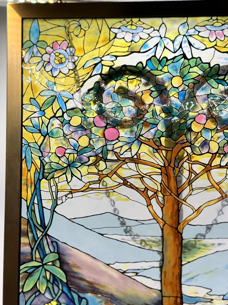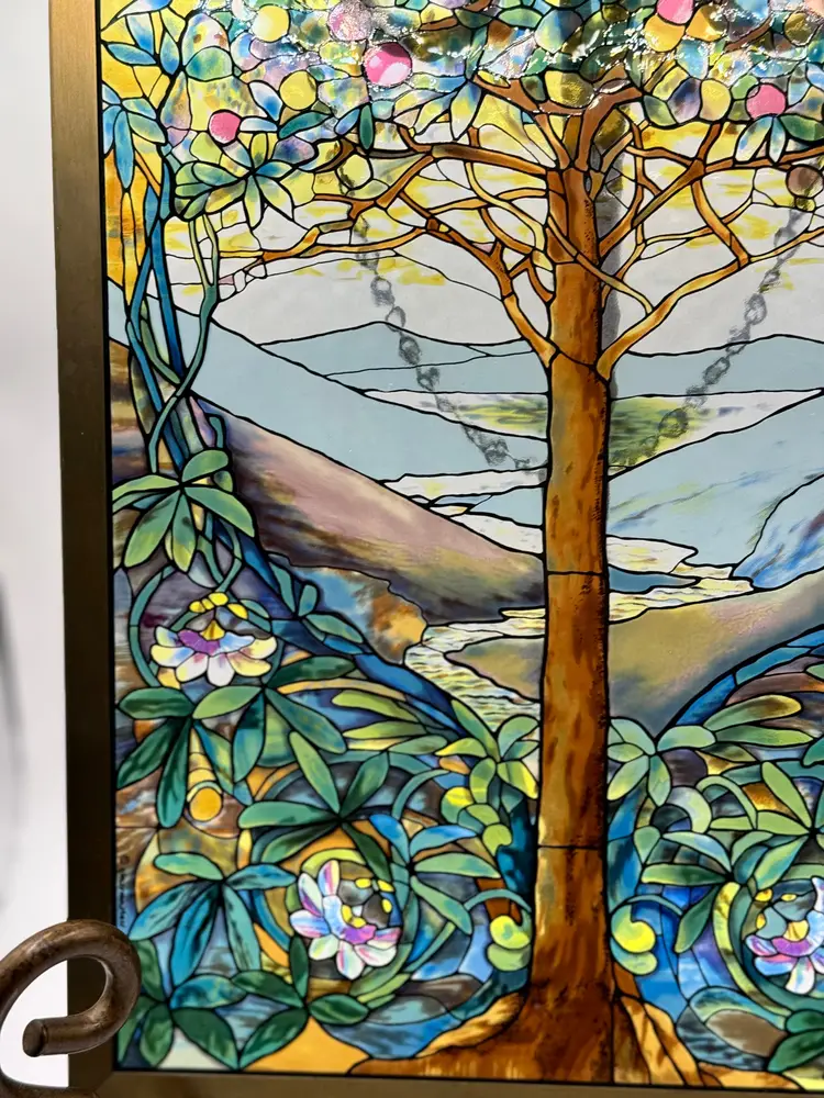 Vintage Tiffany “Tree Of Life” Stained Glass Sun Catcher Replica, Designed By Agnes Northrop, Handcrafted By Glassmasters Stained Glass Studio, Made In Macomb Township, MI, USA