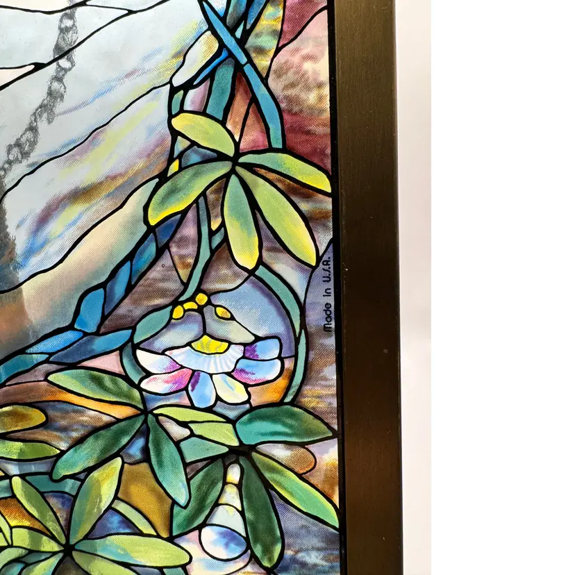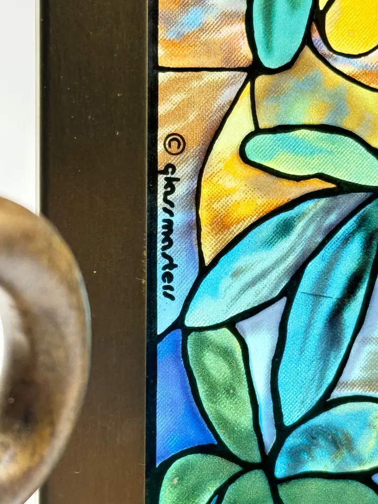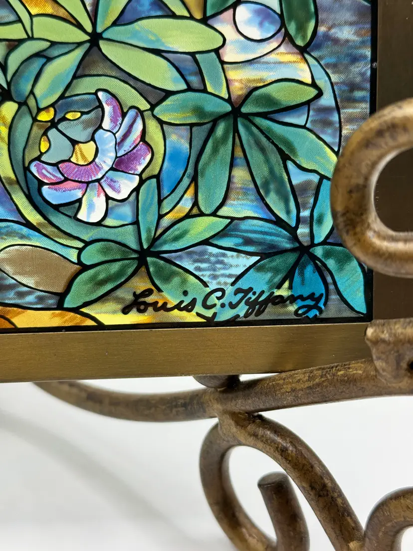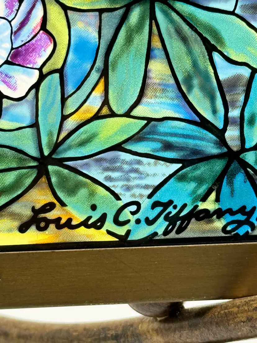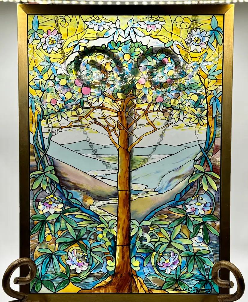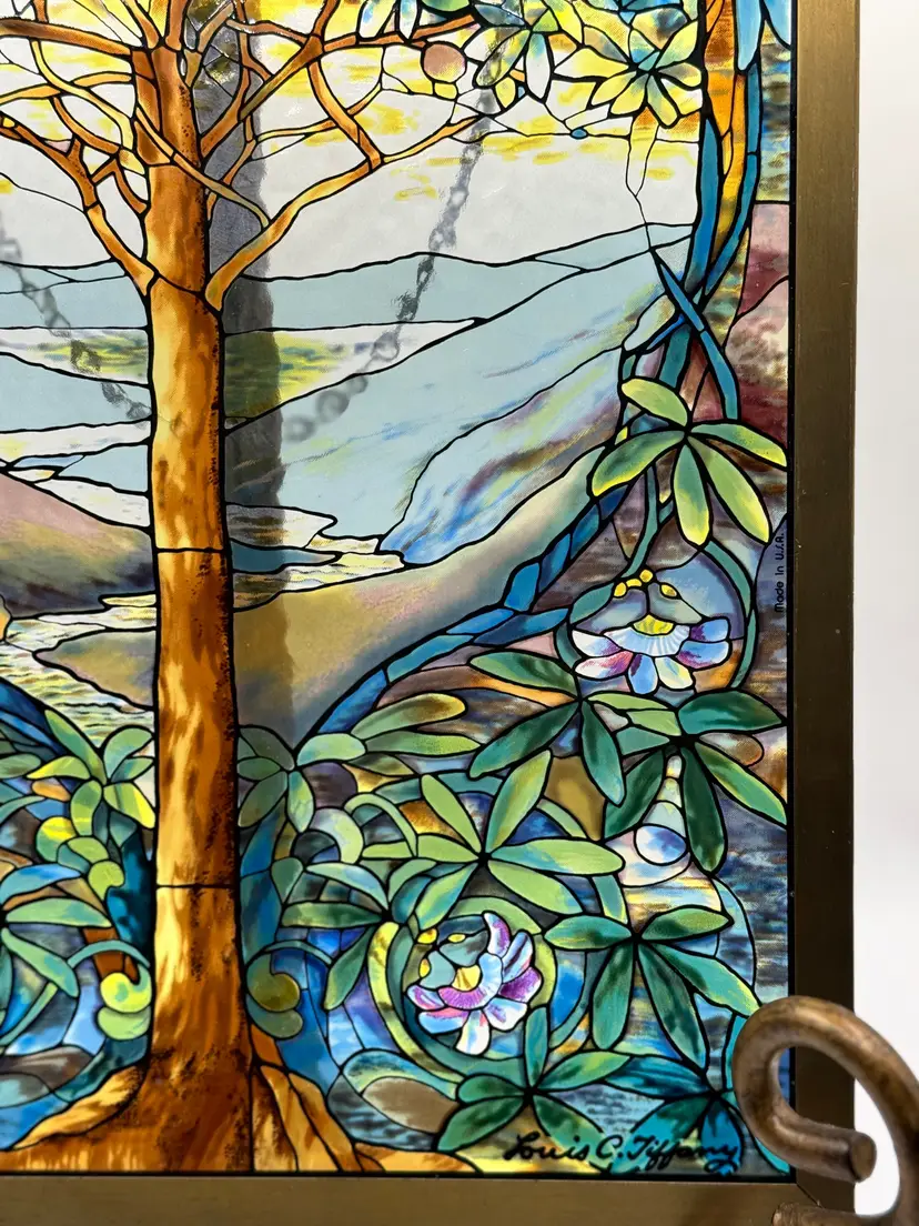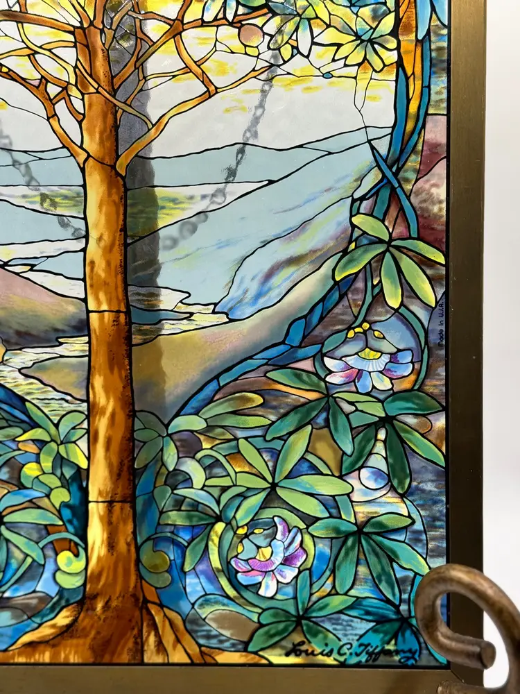 Vintage Tiffany “Tree of Life” stained glass sun catcher replica, designed by Agnes Northrop, handcrafted by Glassmasters Stained Glass Studio, Made in Macomb Township, MI.,USA. Louis Comfort Tiffany, a nature lover, frequently used trees in his scenes. Louis C. Tiffany, signature is on bottom right hand side. Glassmasters signature is on bottom left hand side. Made in USA, right hand side. It has a metal frame with chain for hanging as with all true Glassmasters pieces. It is shiny on one side and matte on the other side. Very beautiful and serene, takes you to a quiet place. No chips or cracks. Measures 9.25x12.75. Weighs 2lb. The picture stand is excluded, for photography only.