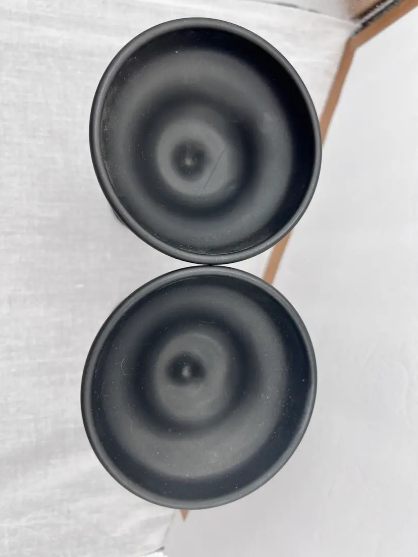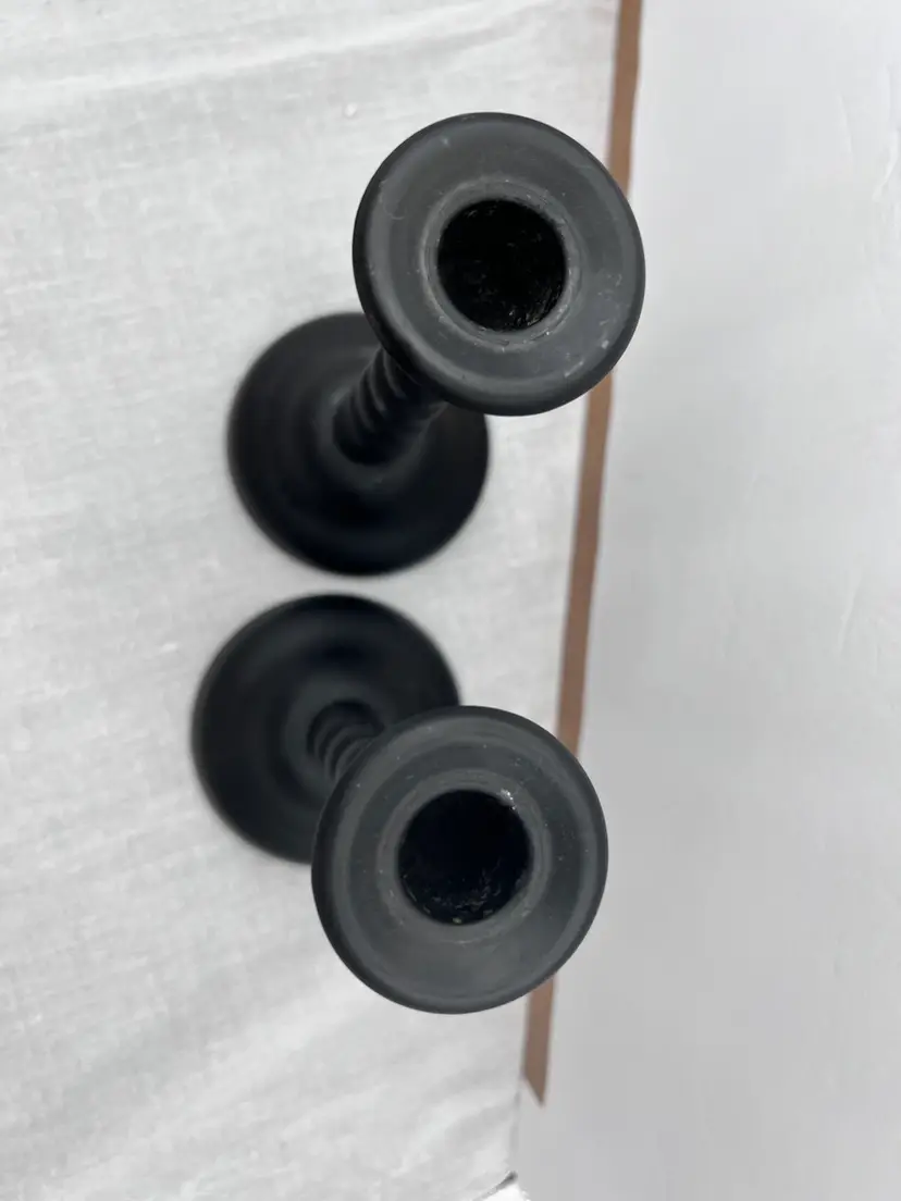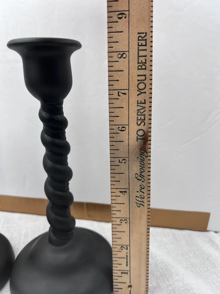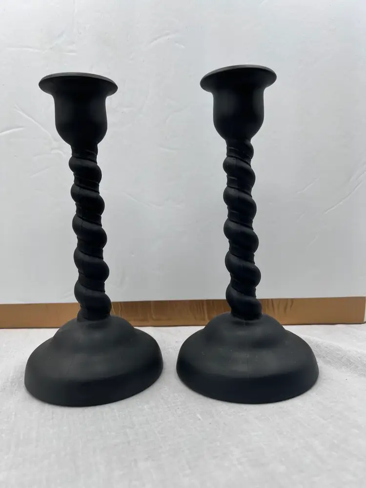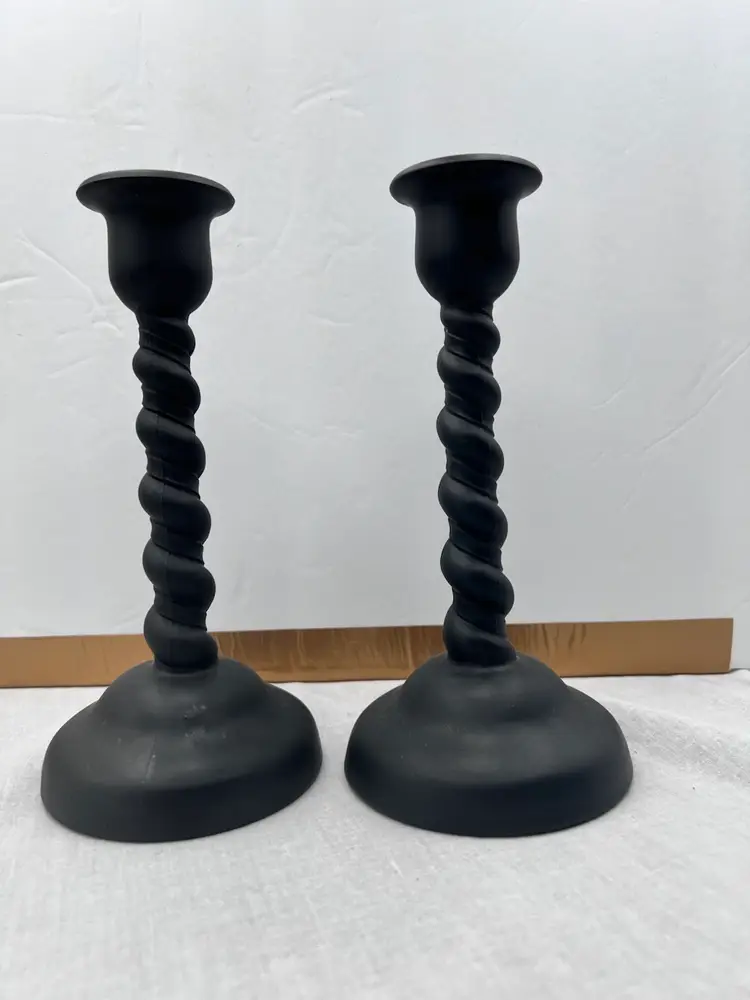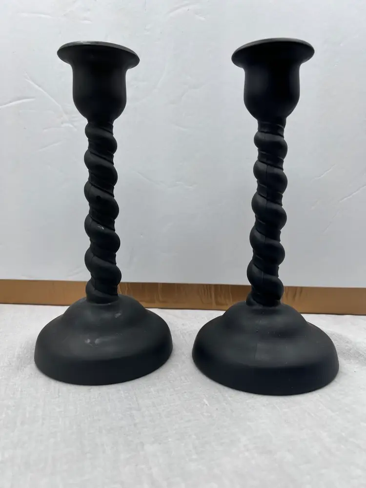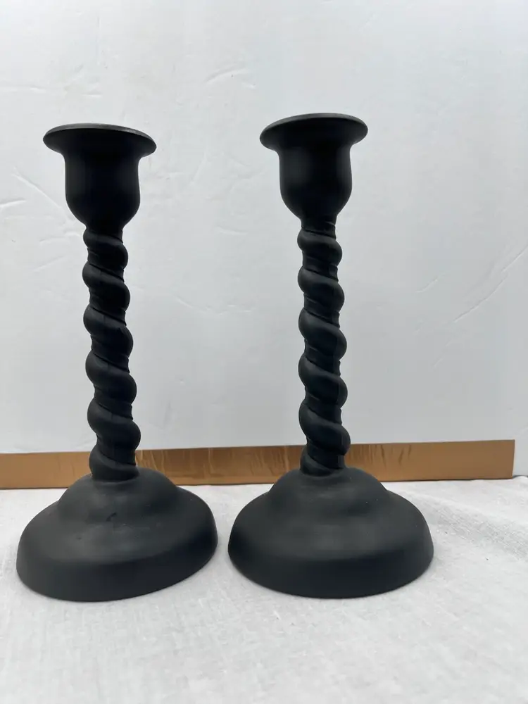 Beautiful Vintage Tiffin Black Satin Glass Spiral Twist Art Deco Candlestick Set Of Two 8 1/2” tall x 4”. wide at base, in very good condition Made by the Tiffin Company