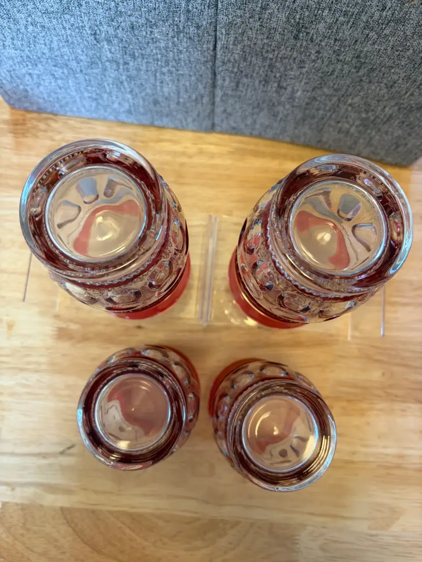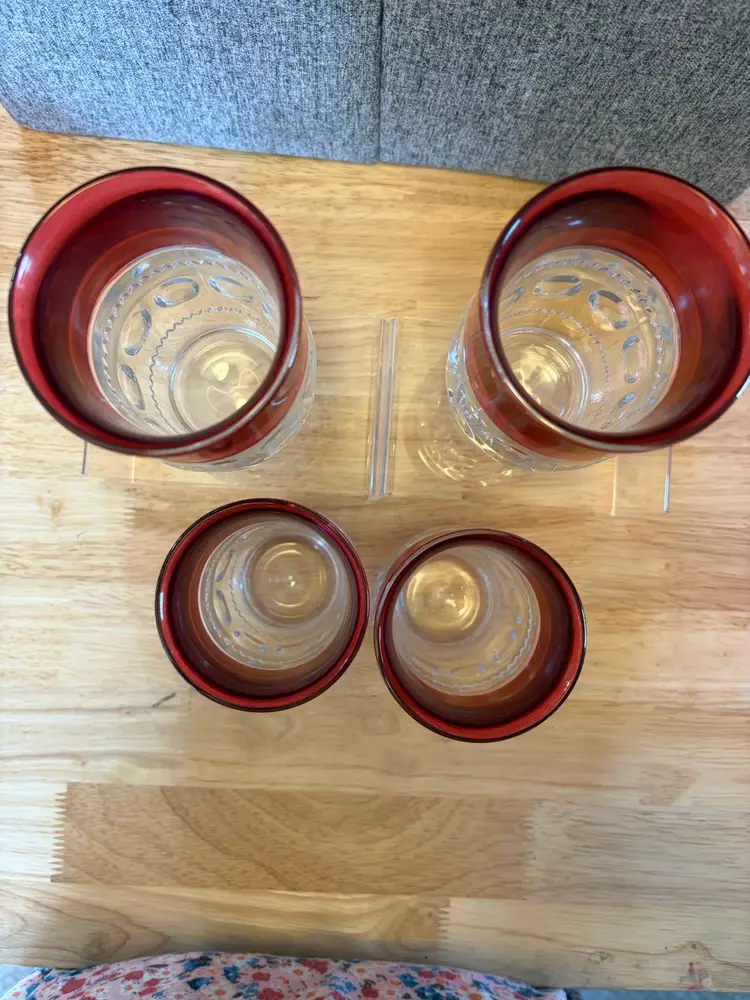 Set of 4 vintage tumblers with ruby flash tops. Each glass features intricate etched patterns. Perfect for adding a touch of elegance to your drinkware collection. Each tumbler is 5 inches tall and 3 inches wide. The flash is in excellent condition. There are no chips or cracks.