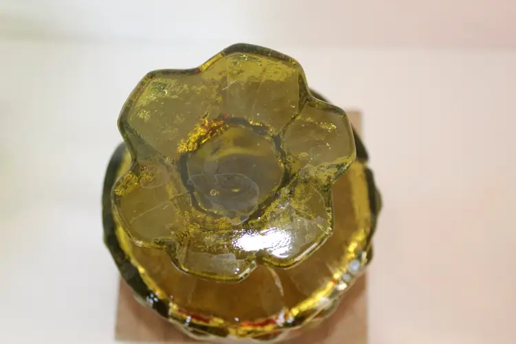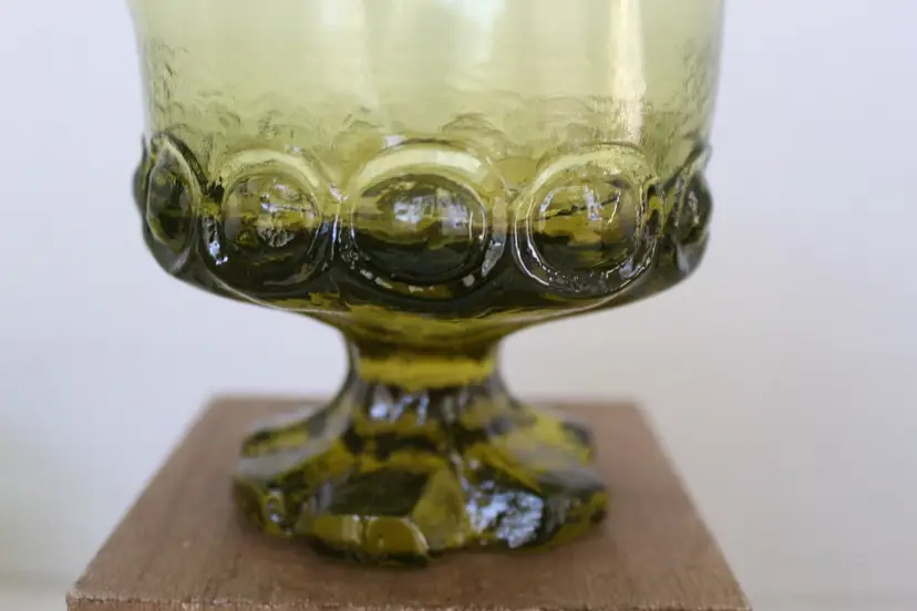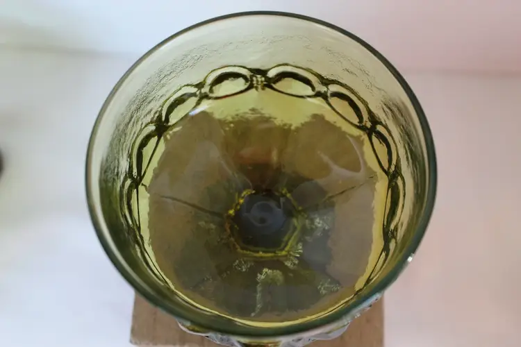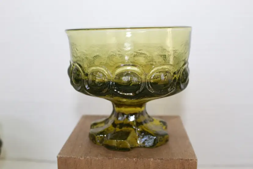 The Vintage Tiffin Franciscan Madeira Olive Green Sorbet Sherbet Glass MCM Set is a round, pressed glass set featuring a glossy finish and a vibrant green color. This mid-century modern set from the 1970s is UV reactive and made in the United States. With a single compartment and a height of 3 5/8 inches, this original Tiffin Franciscan product is perfect for serving sherbert in a stylish and unique way. Please note that these dishes are for decorative purposes only and should be hand washed to maintain their condition. For sale on Replacements.ltd for $8 per glass.