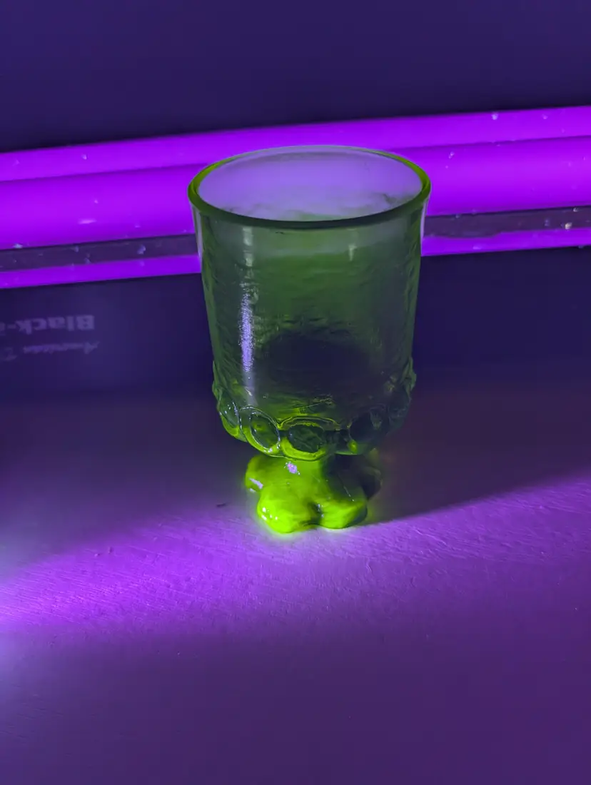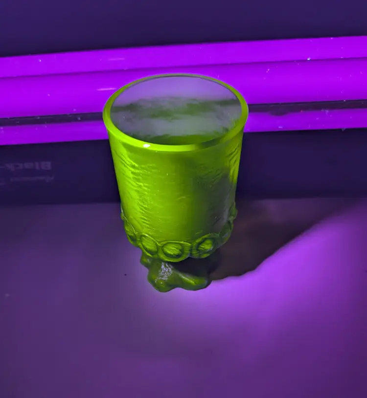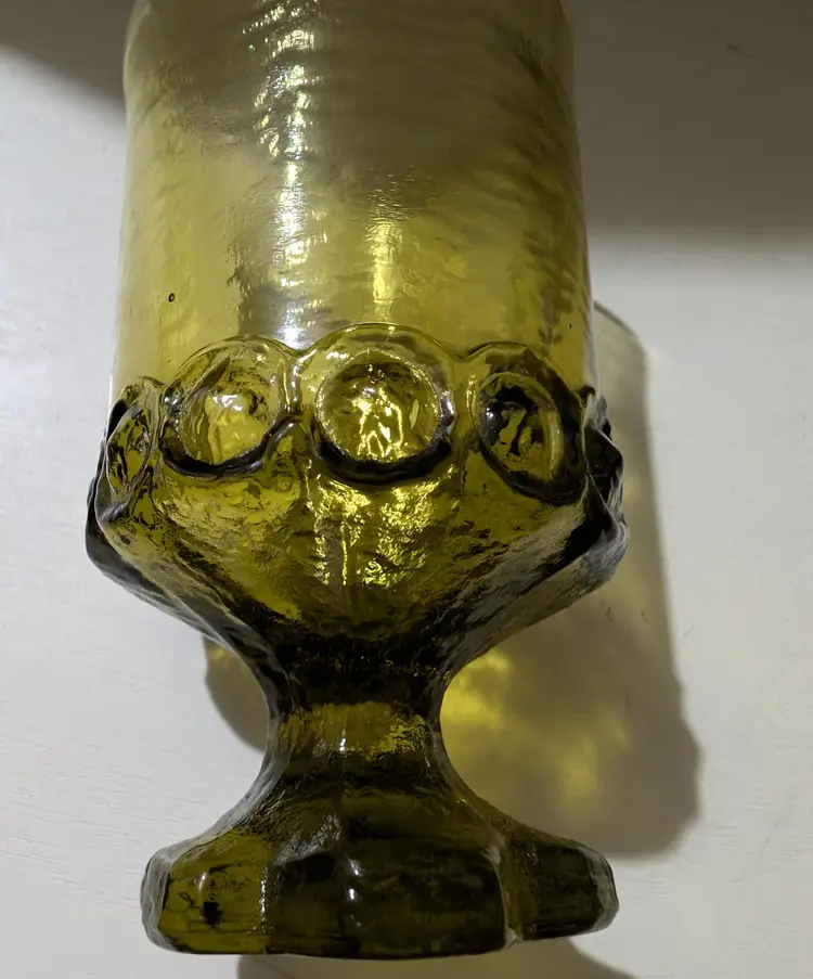 Beautiful vintage Olive green glass goblet featuring a unique textured design. This piece is in excellent condition with no cracks or chips. Perfect for adding a touch of vintage charm to your kitchen or dining collection. The goblet stands approximately 5 inches tall and has a base width of 3 inches. Ideal for collectors or as a stylish decor item that also glows under UV light.