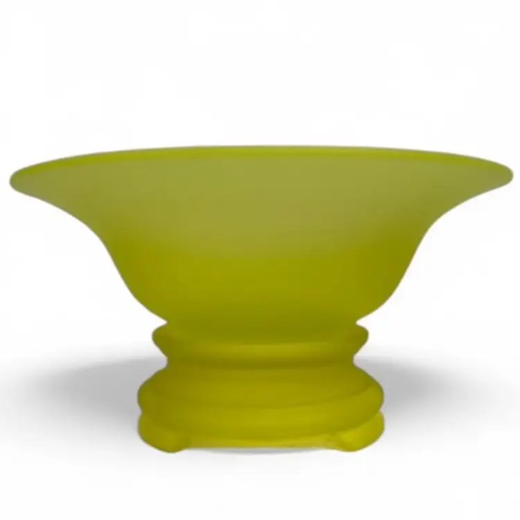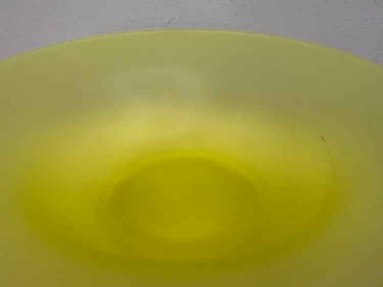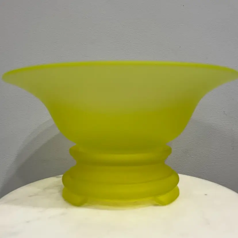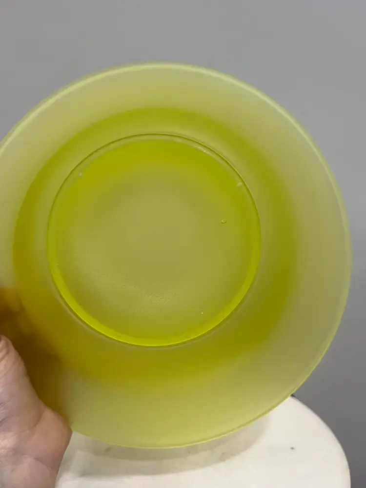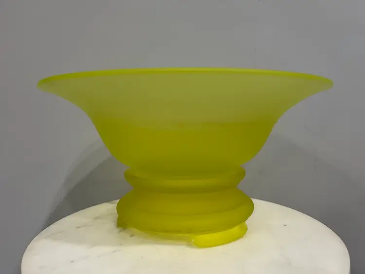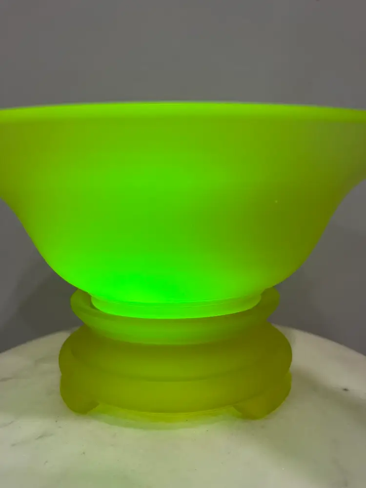 There are several flaws with this piece, but mainly on the stand. The stand has one larger chip on one of the feet along with some smaller chips on another foot. There’s also some discoloration to the satin finish. The bowl has no chips or cracks, but does have a darker line of discoloration on the inside as shown. Please see photos for details. Both pieces together measure approximately 5” tall and 9.5” in diameter. Both glow great under black light. Message me with any questions.