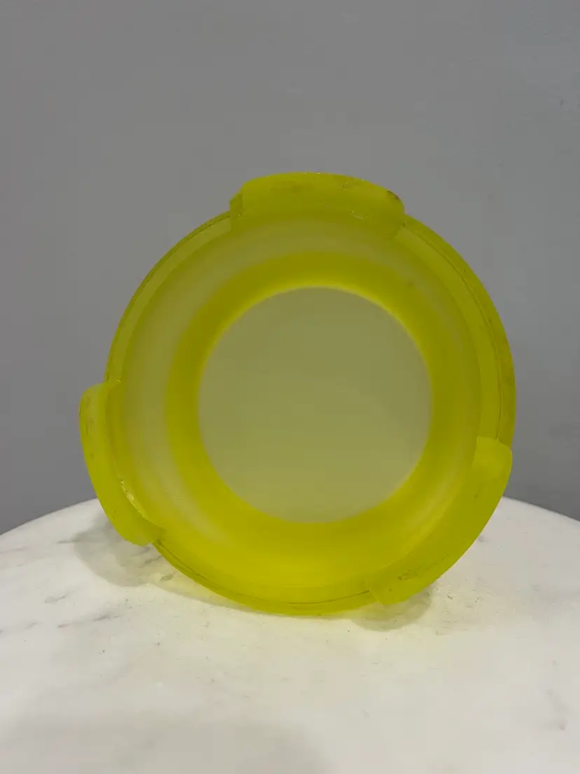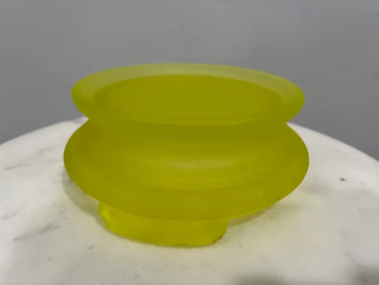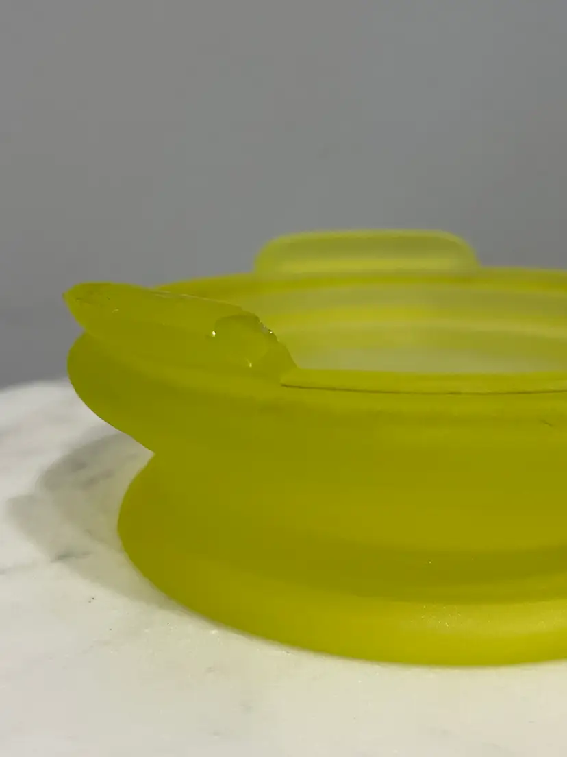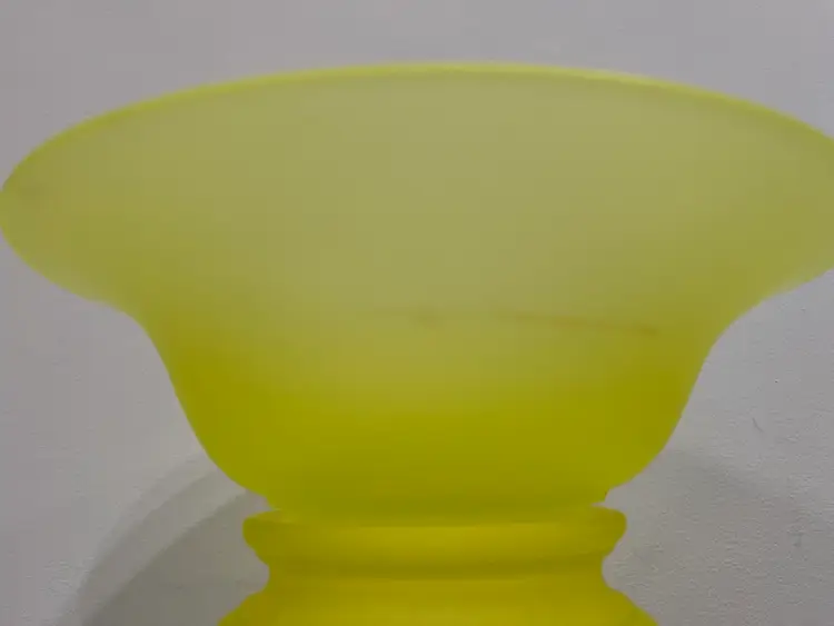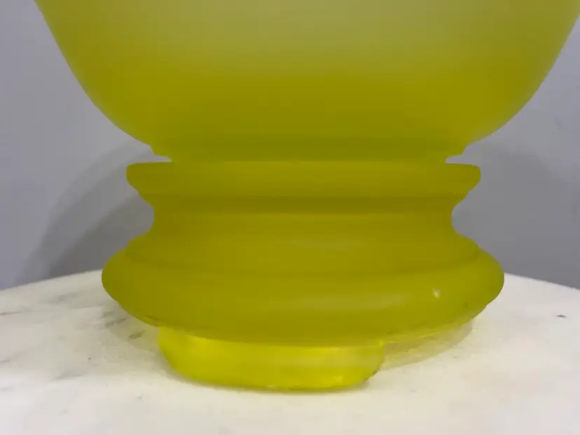 There are several flaws with this piece, but mainly on the stand. The stand has one larger chip on one of the feet along with some smaller chips on another foot. There’s also some discoloration to the satin finish. The bowl has no chips or cracks, but does have a darker line of discoloration on the inside as shown. Please see photos for details. Both pieces together measure approximately 5” tall and 9.5” in diameter. Both glow great under black light. Message me with any questions.