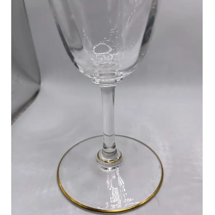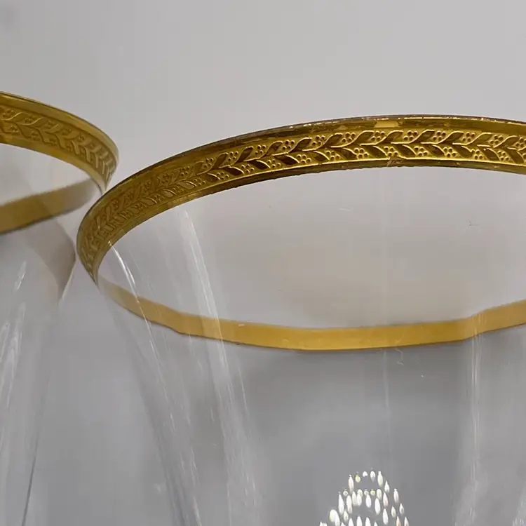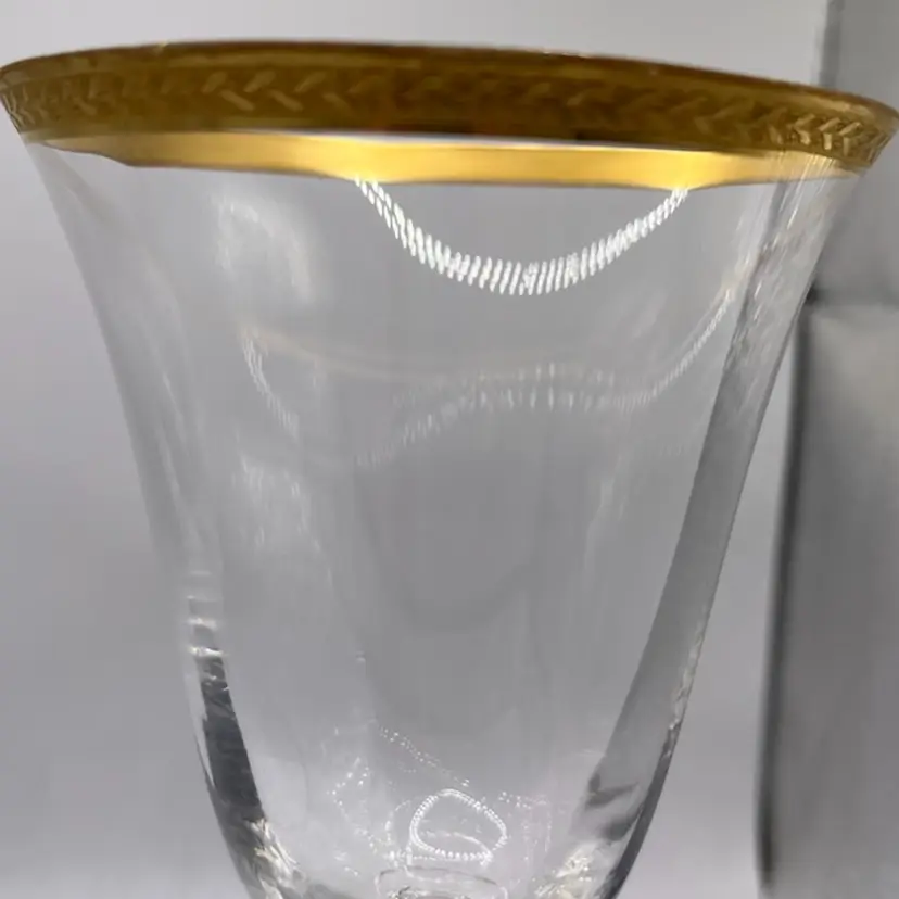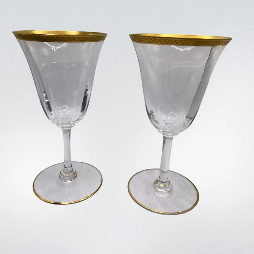 Set of two Tiffin Wine glasses in Excelwnt pre-Owned condition. Both have the 22kt. Gold Laurel Leaf pattern. Beautiful vintage set approx 7x 3