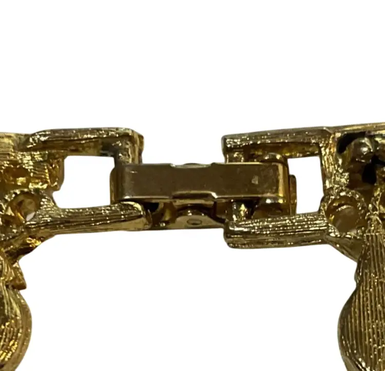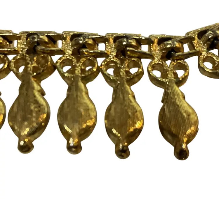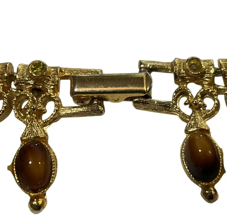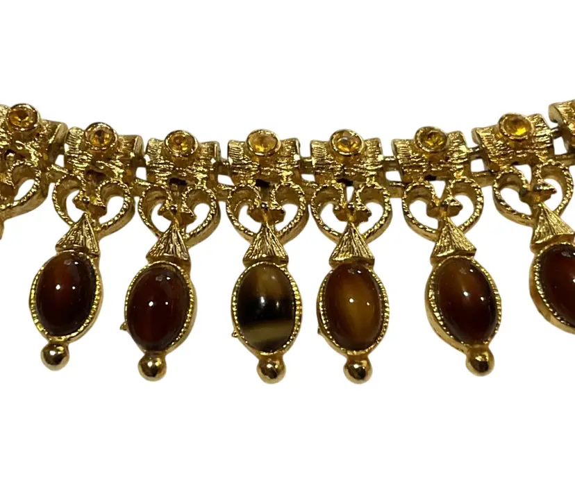 This exquisite vintage choker necklace features a stunning tiger eye gemstone and gold-tone design, perfect for adding a touch of Etruscan revival elegance to any outfit. Measuring 15 inches, it’s an eye-catching accessory for any occasion.